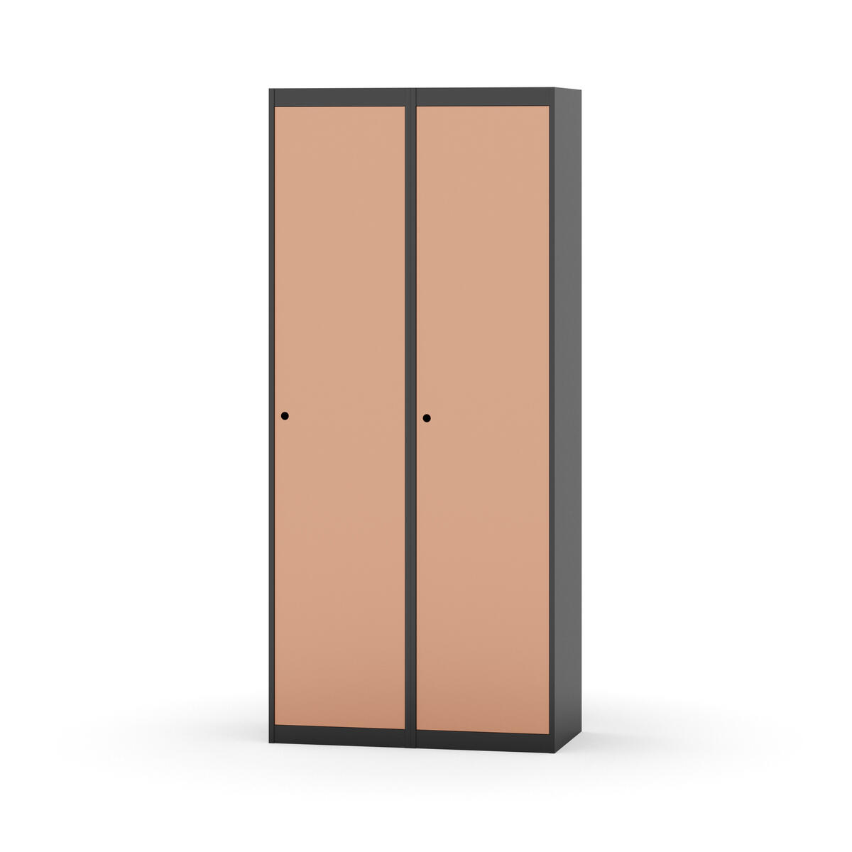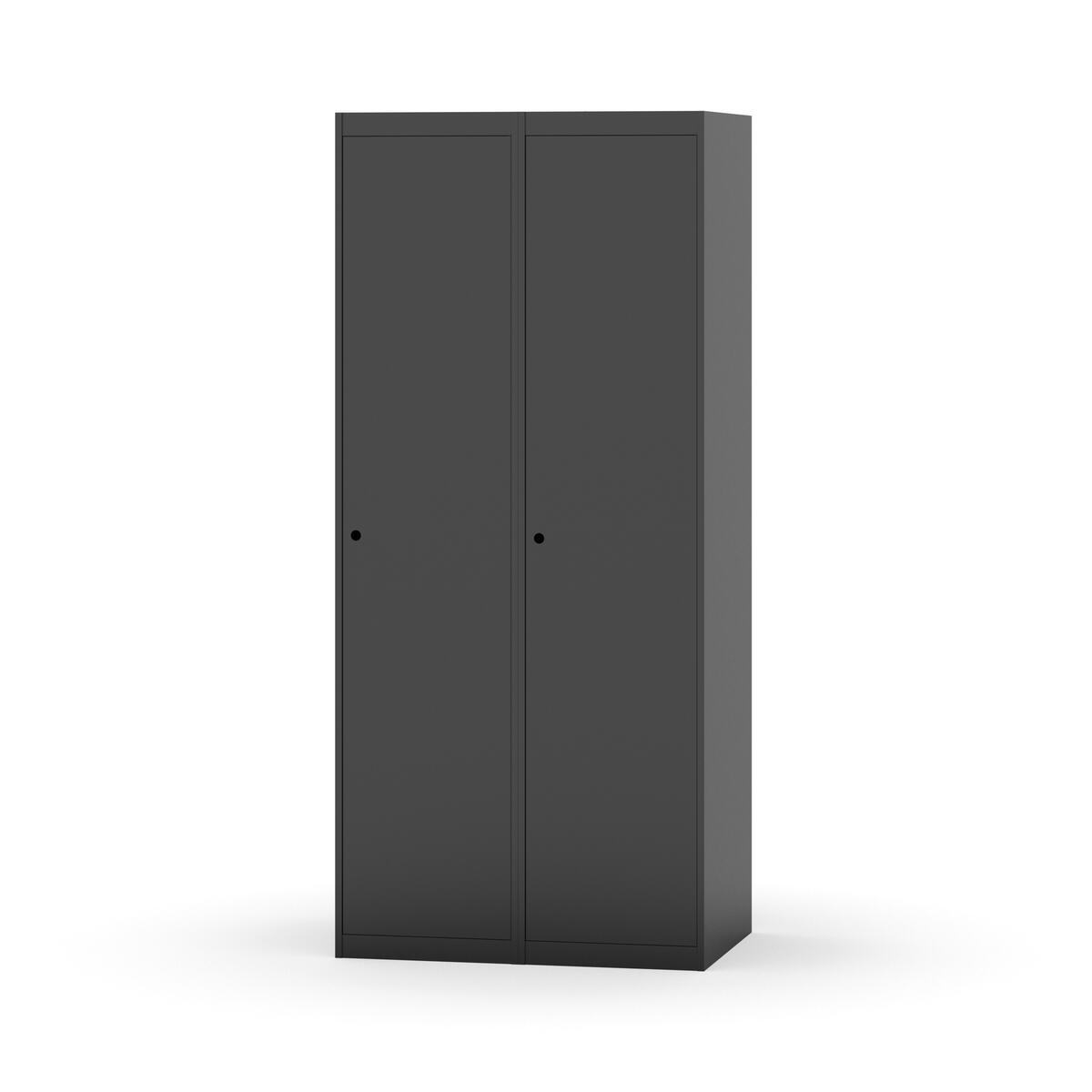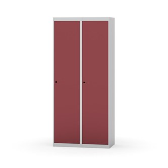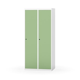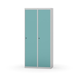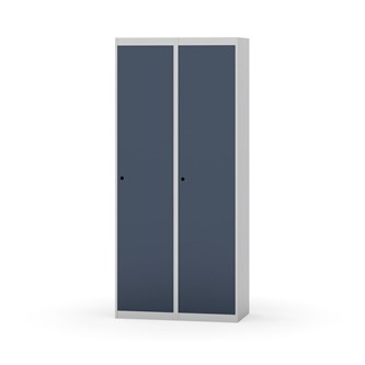 Garderobeskab med fuldsvejset stel. Vælg mellem låge i metal eller laminat. Metallågen er udstyret med dørstopper i stål og indvendig forstærkningsplade omkring låsehullet. Laminatlågen er indstøbt i en stålramme, som er udstyret med dørstopper i stål. Lågerne kan åbnes 90 grader. Indretning: Hylde og bøjlestang med to praktiske ankerkroge. Plan bund uden kant. Ventilation gennem huller i top-/bundplade. Bemærk, at lås samt sokkel/ben bestilles på separate varenumre. Leveres med færdigmonteret lås. Det valgte understel monteres ved levering.