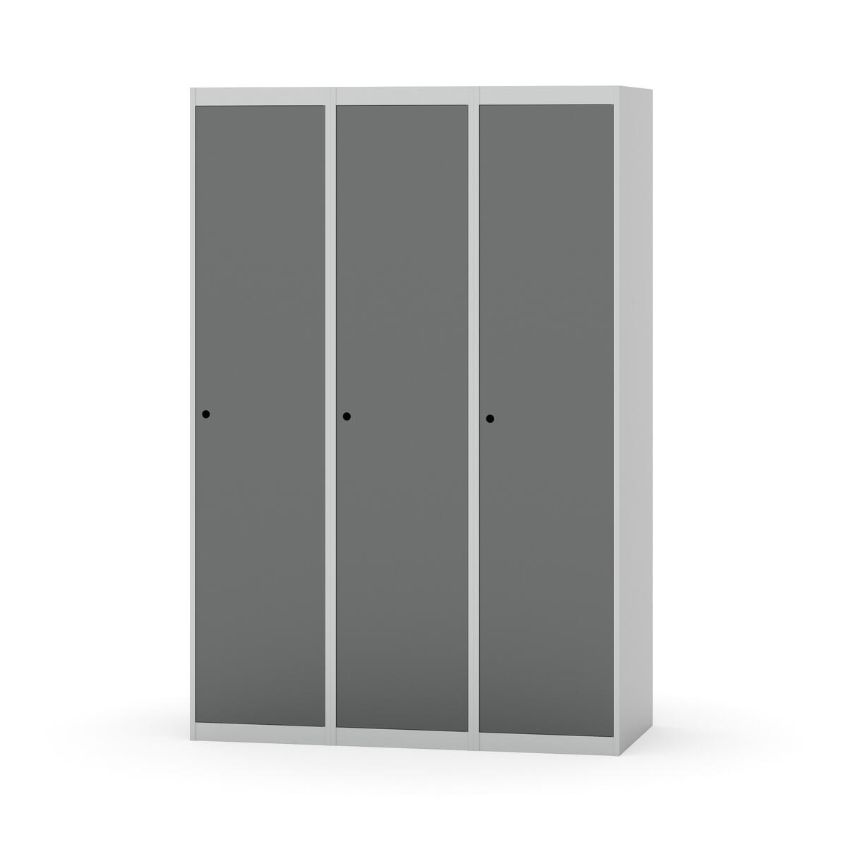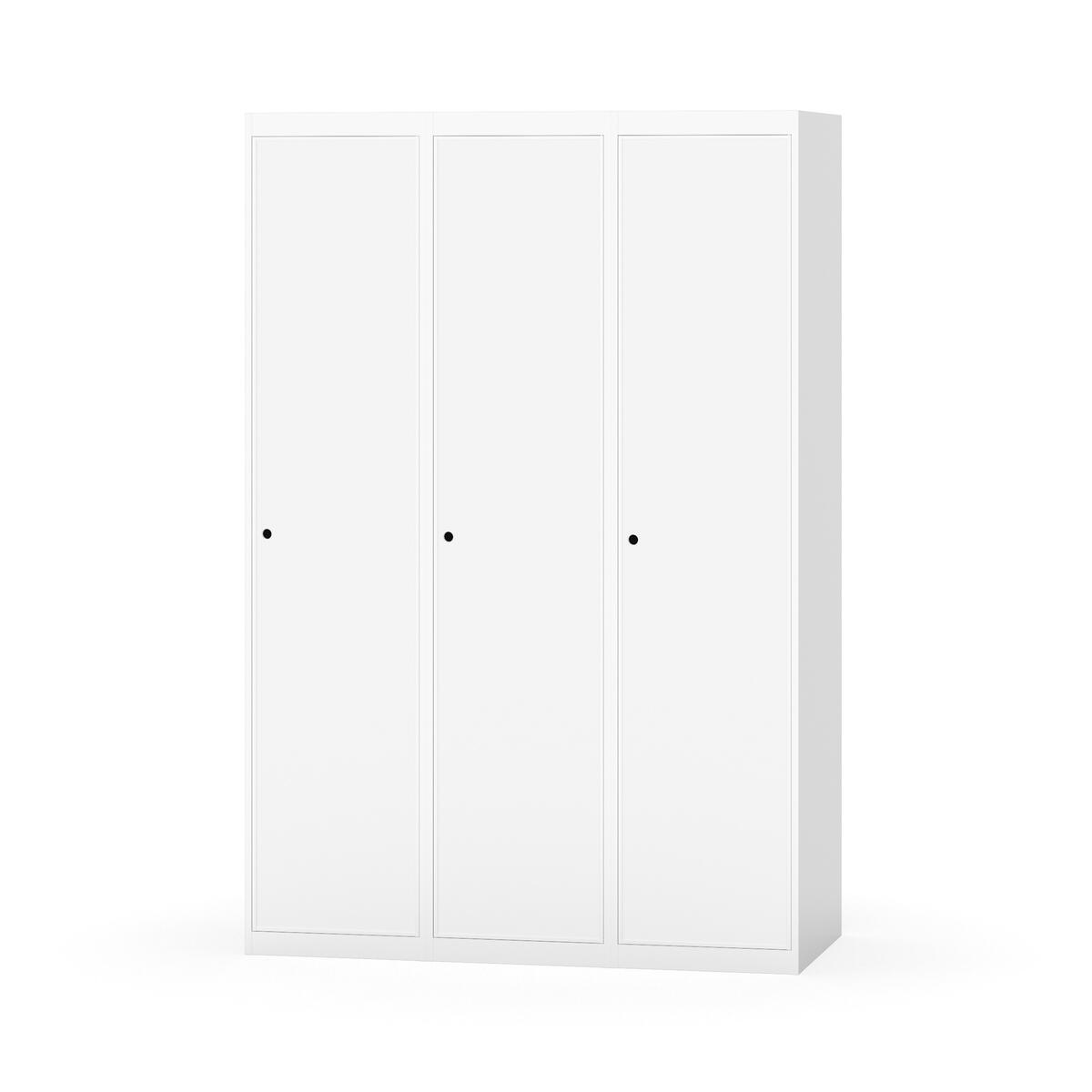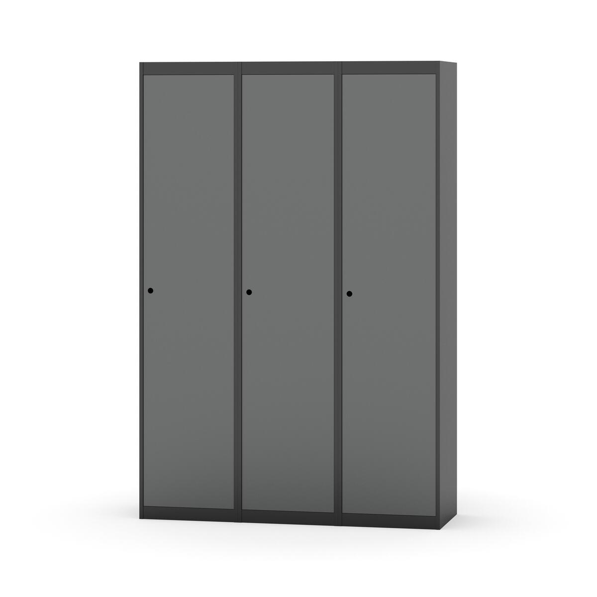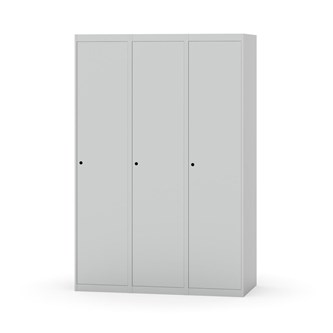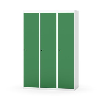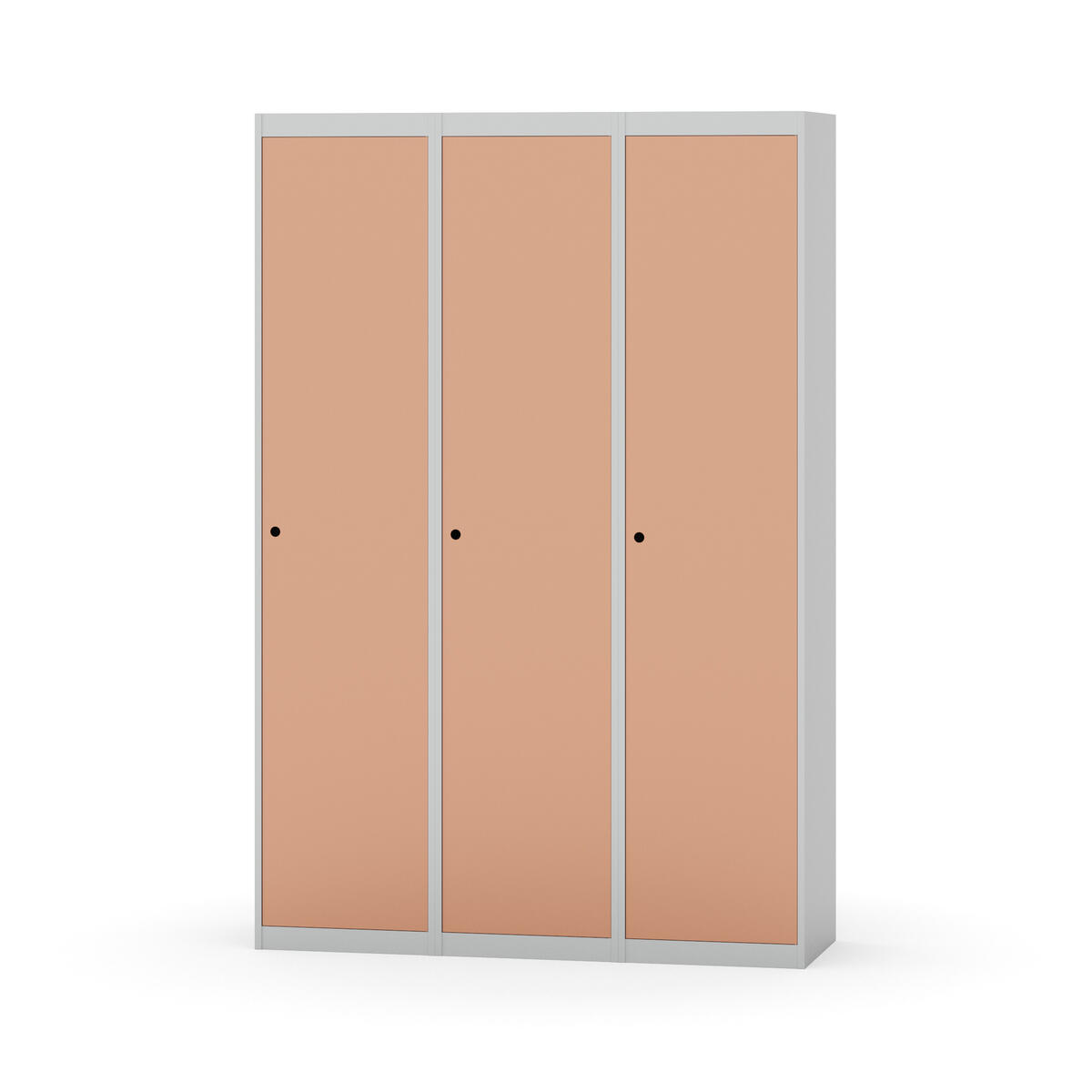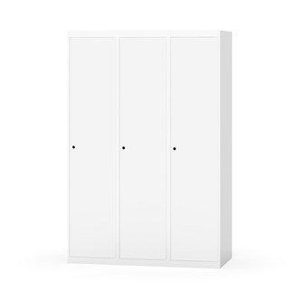 Garderobeskab med fuldsvejset stel. Vælg mellem låge i metal eller laminat. Metallågen er udstyret med dørstopper i stål og indvendig forstærkningsplade omkring låsehullet. Laminatlågen er indstøbt i en stålramme, som er udstyret med dørstopper i stål. Lågerne kan åbnes 90 grader. Indretning: Hylde og bøjlestang med to praktiske ankerkroge. Plan bund uden kant. Ventilation gennem huller i top-/bundplade. Bemærk, at lås samt sokkel/ben bestilles på separate varenumre. Leveres med færdigmonteret lås. Det valgte understel monteres ved levering.