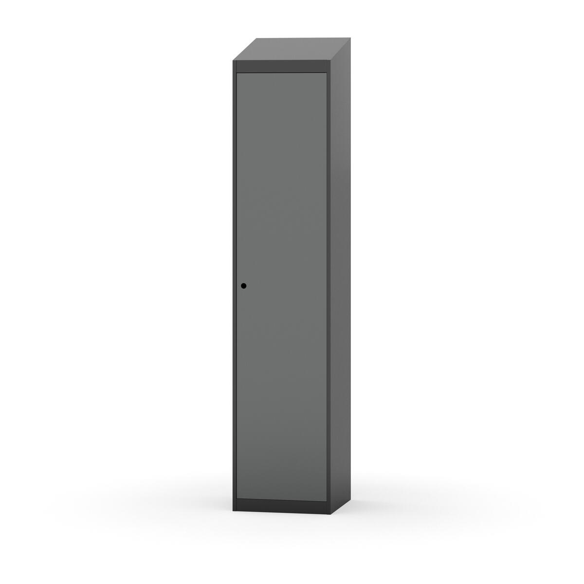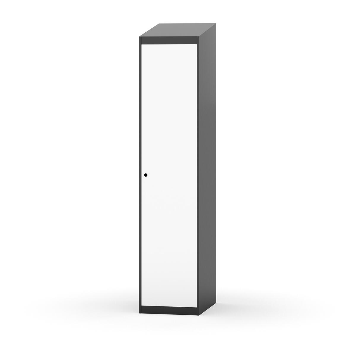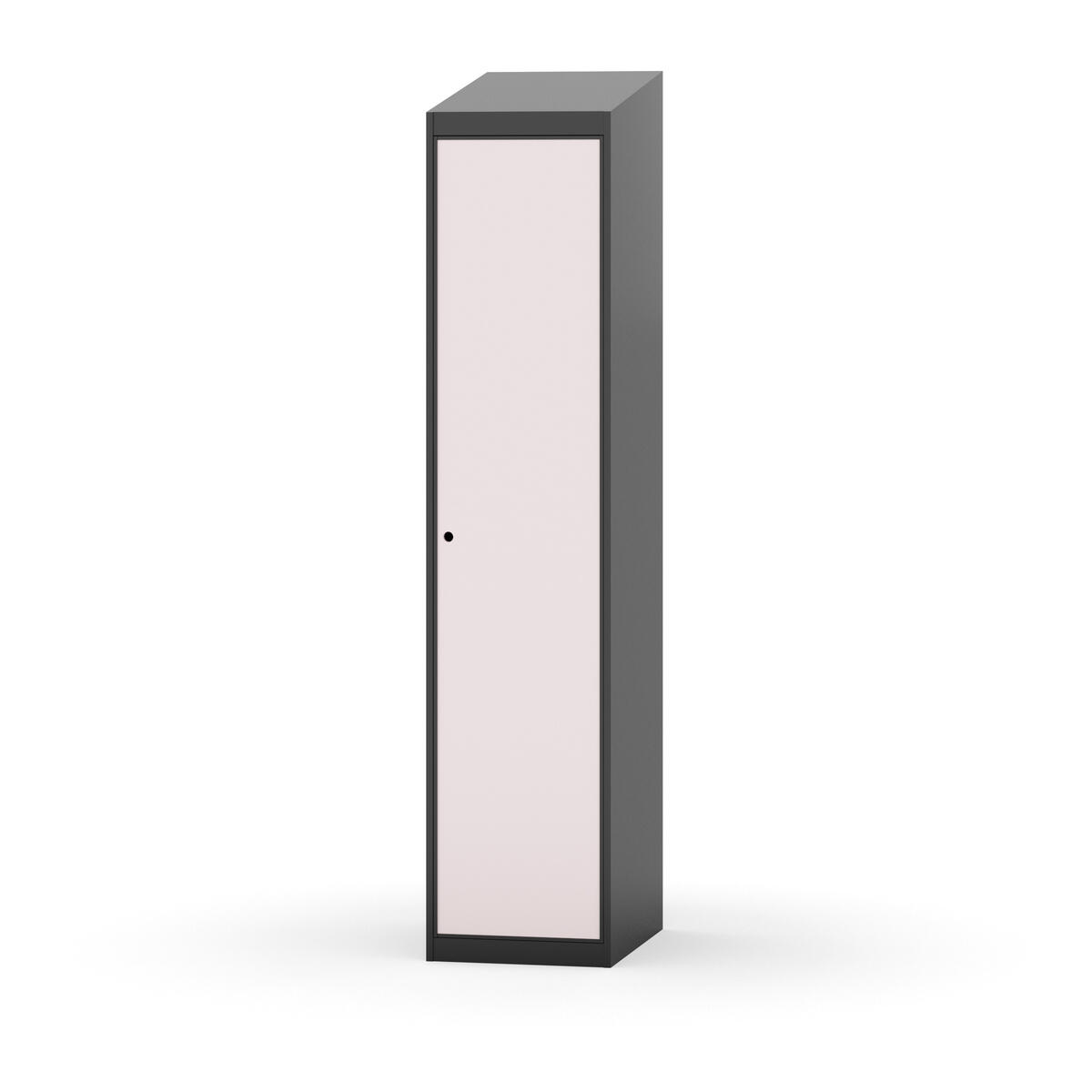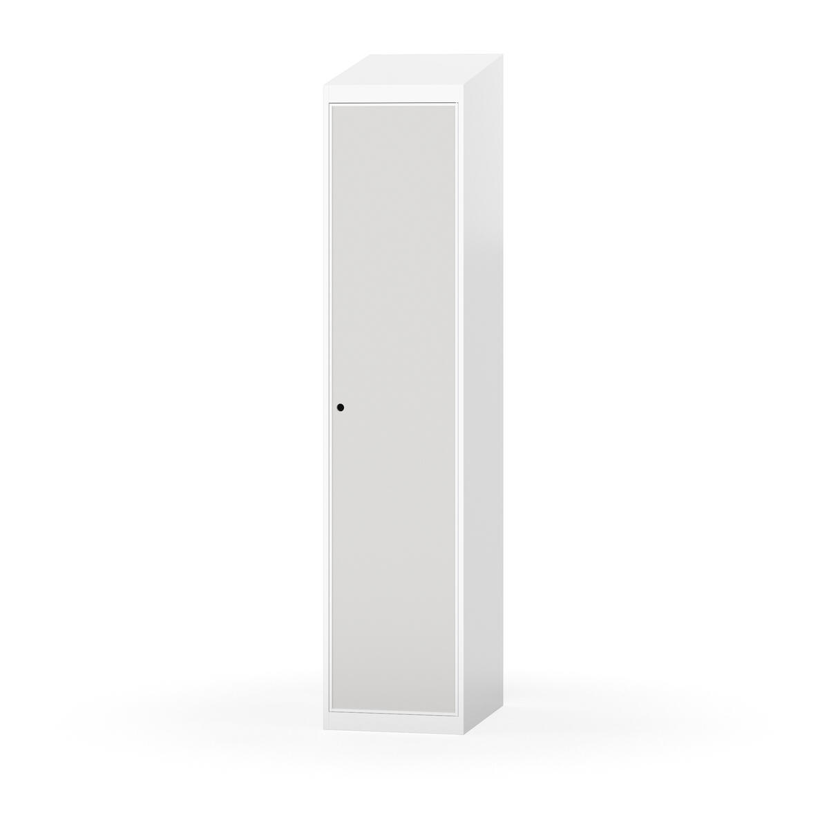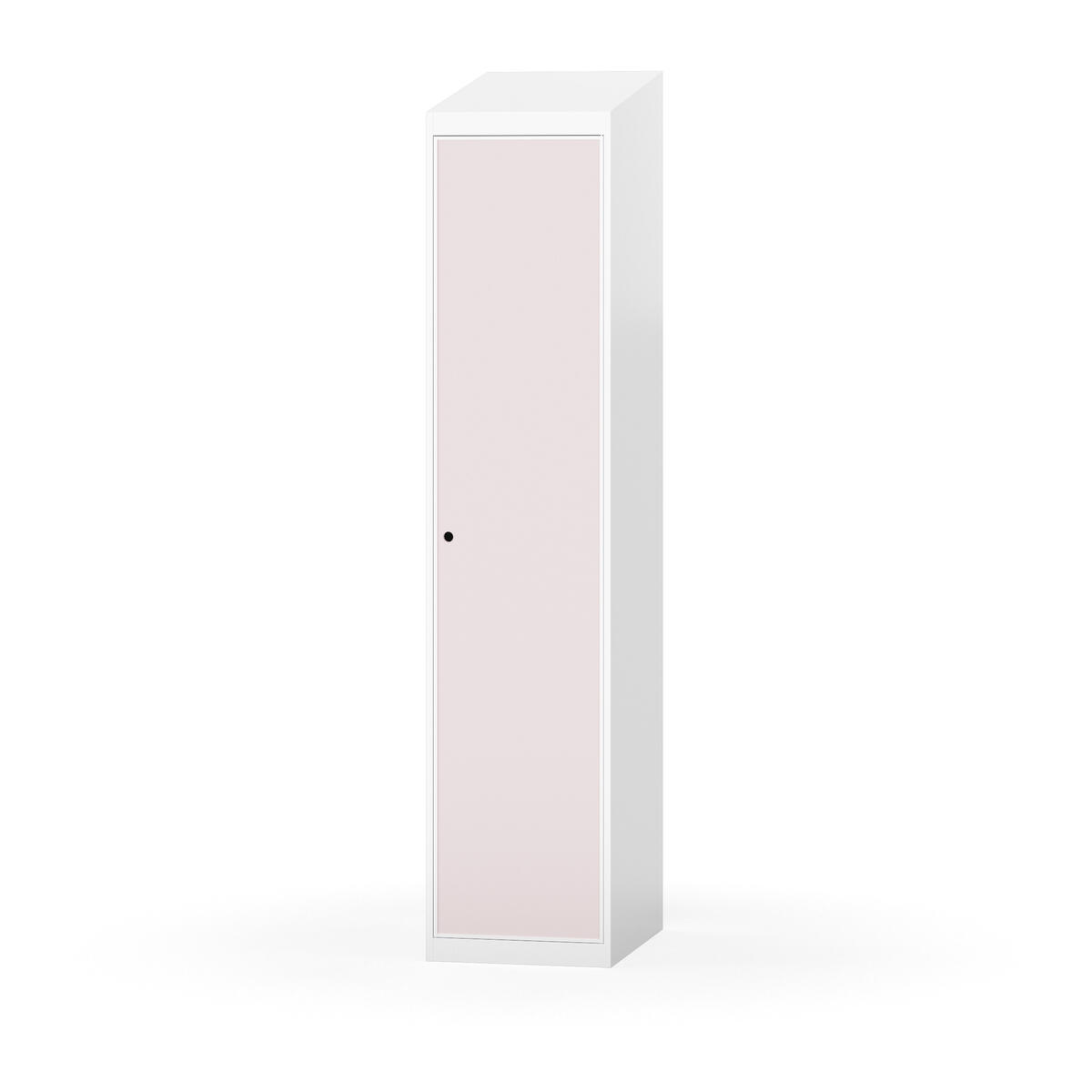 Garderobeskab med fuldsvejset stel. Vælg mellem låge i metal eller laminat. Metallågen er udstyret med dørstopper i stål og indvendig forstærkningsplade omkring låsehullet. Laminatlågen er indstøbt i en stålramme, som er udstyret med dørstopper i stål. Lågerne kan åbnes 90 grader. Indretning: Hylde og bøjlestang med to praktiske ankerkroge. Plan bund uden kant. Ventilation gennem huller i top-/bundplade. Bemærk, at lås samt sokkel/ben bestilles på separate varenumre. Leveres med færdigmonteret lås. Det valgte understel monteres ved levering.