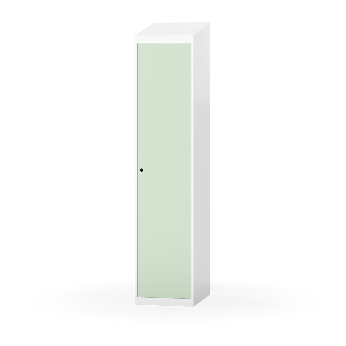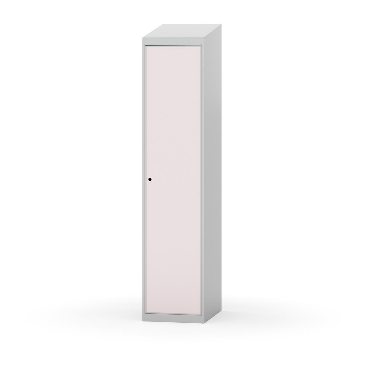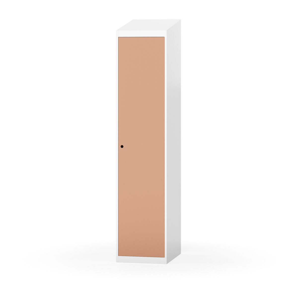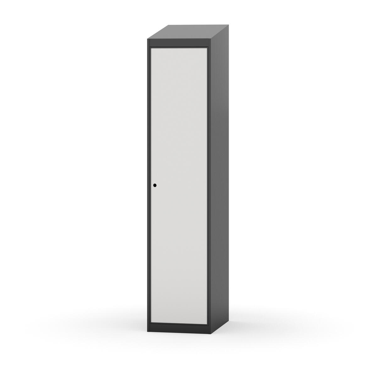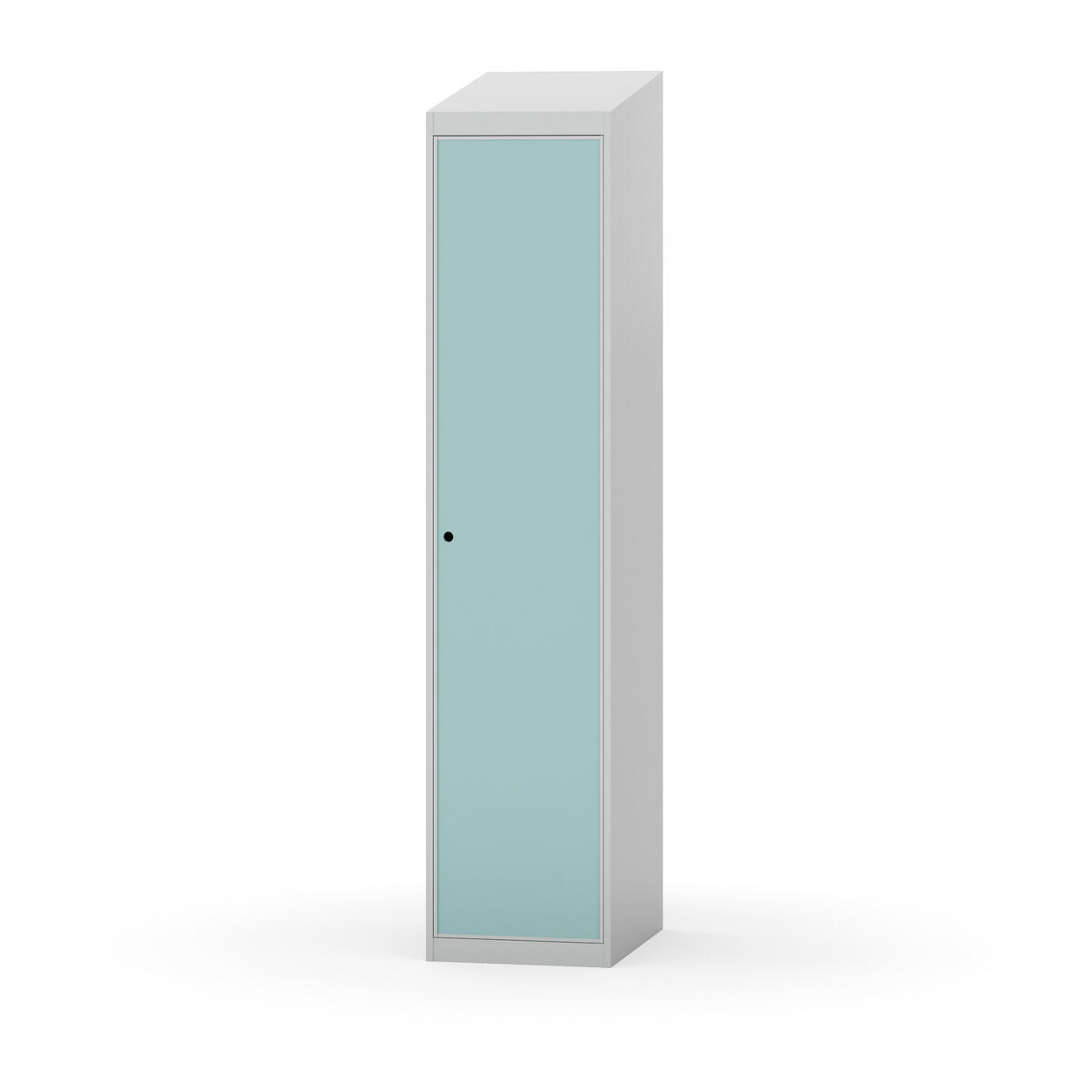 Garderobeskab med fuldsvejset stel. Vælg mellem låge i metal eller laminat. Metallågen er udstyret med dørstopper i stål og indvendig forstærkningsplade omkring låsehullet. Laminatlågen er indstøbt i en stålramme, som er udstyret med dørstopper i stål. Lågerne kan åbnes 90 grader. Indretning: Hylde og bøjlestang med to praktiske ankerkroge. Plan bund uden kant. Ventilation gennem huller i top-/bundplade. Bemærk, at lås samt sokkel/ben bestilles på separate varenumre. Leveres med færdigmonteret lås. Det valgte understel monteres ved levering.