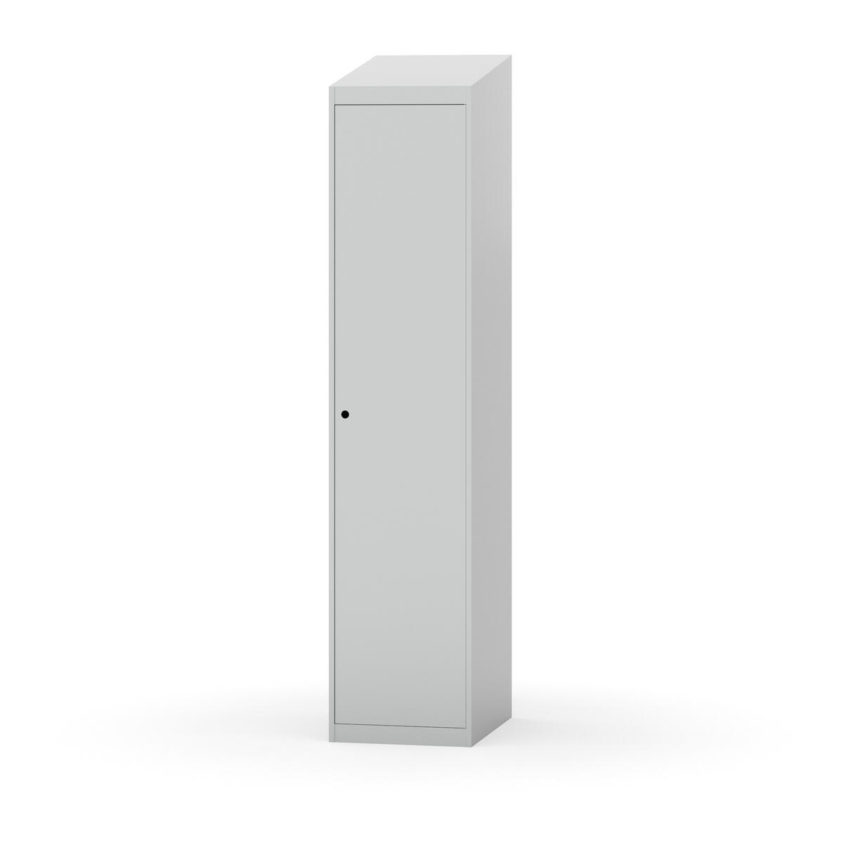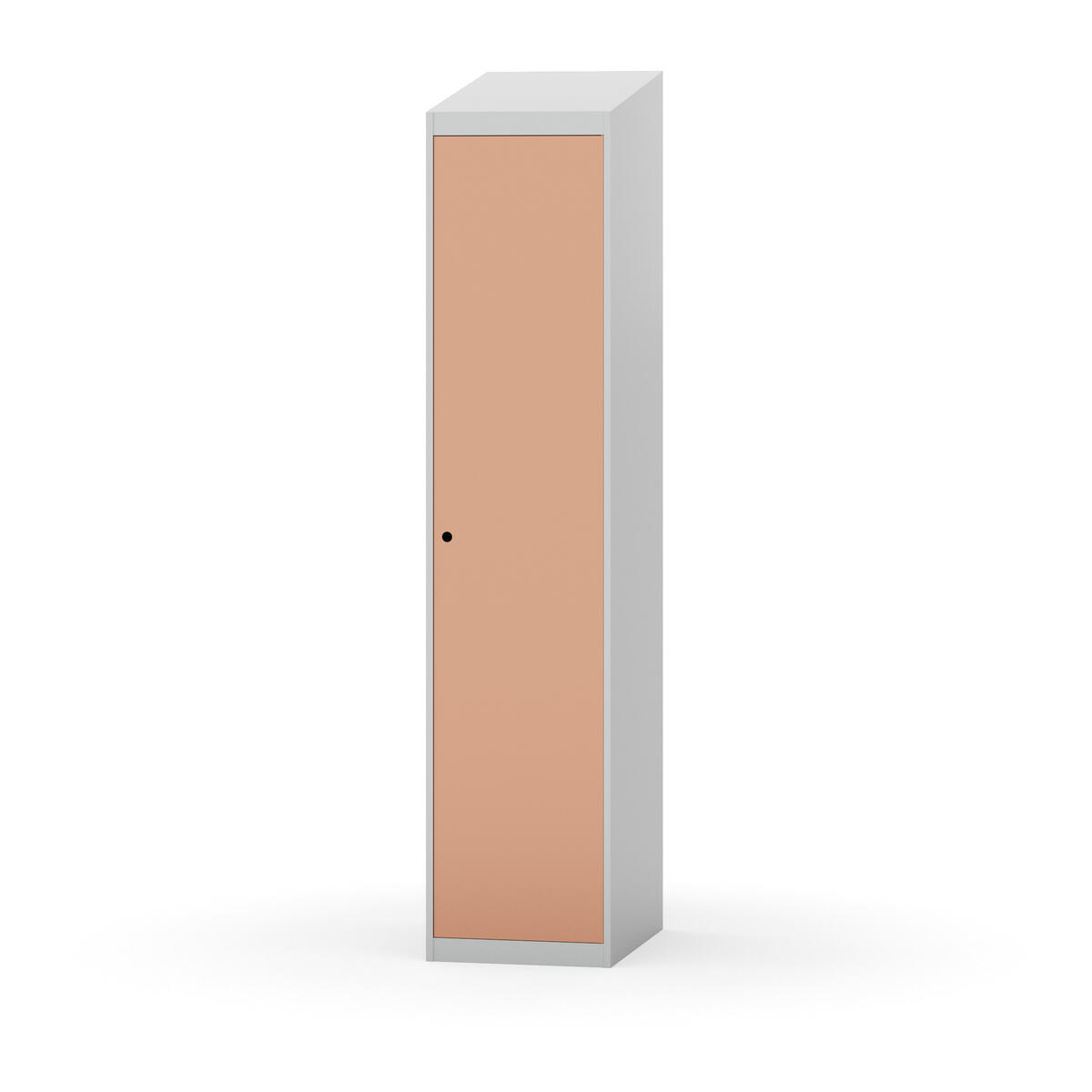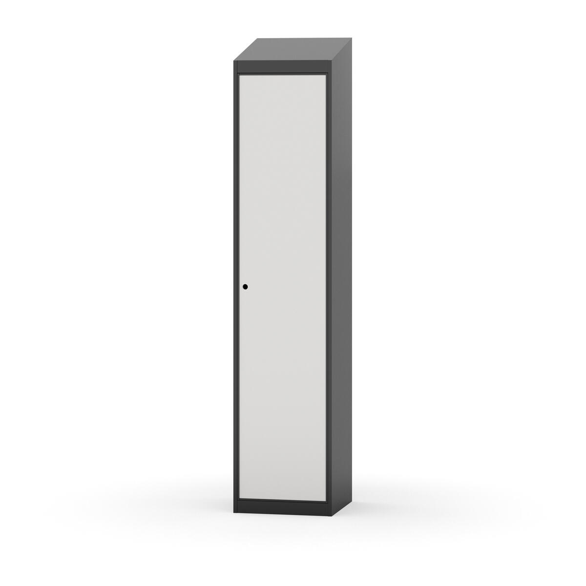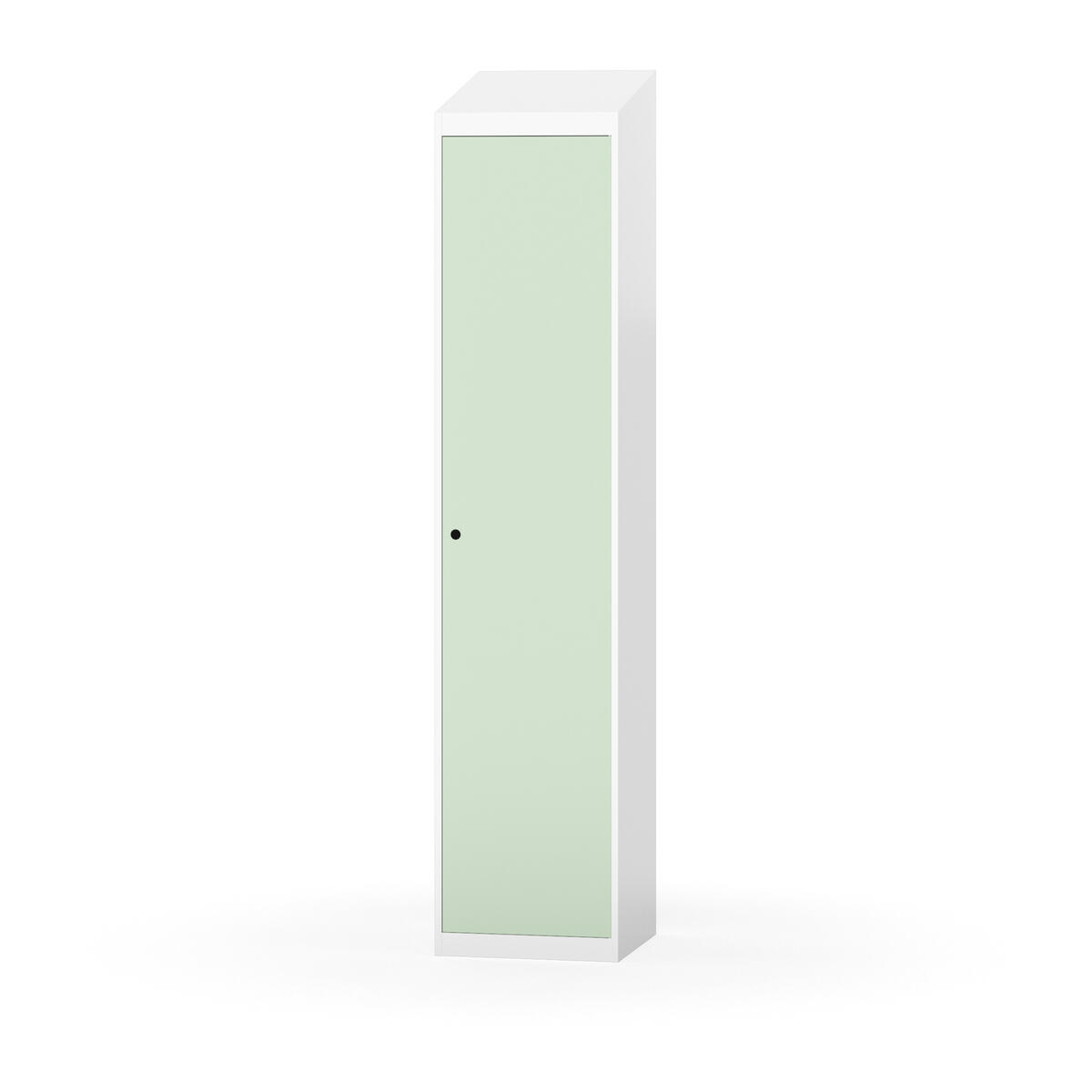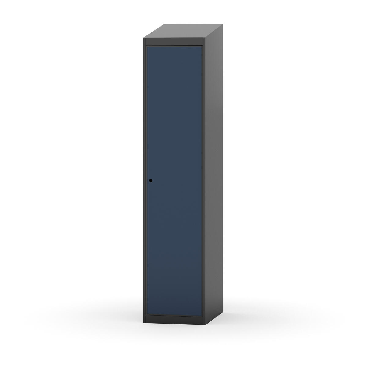 Garderobeskab med fuldsvejset stel. Vælg mellem låge i metal eller laminat. Metallågen er udstyret med dørstopper i stål og indvendig forstærkningsplade omkring låsehullet. Laminatlågen er indstøbt i en stålramme, som er udstyret med dørstopper i stål. Lågerne kan åbnes 90 grader. Indretning: Hylde og bøjlestang med to praktiske ankerkroge. Plan bund uden kant. Ventilation gennem huller i top-/bundplade. Bemærk, at lås samt sokkel/ben bestilles på separate varenumre. Leveres med færdigmonteret lås. Det valgte understel monteres ved levering.
