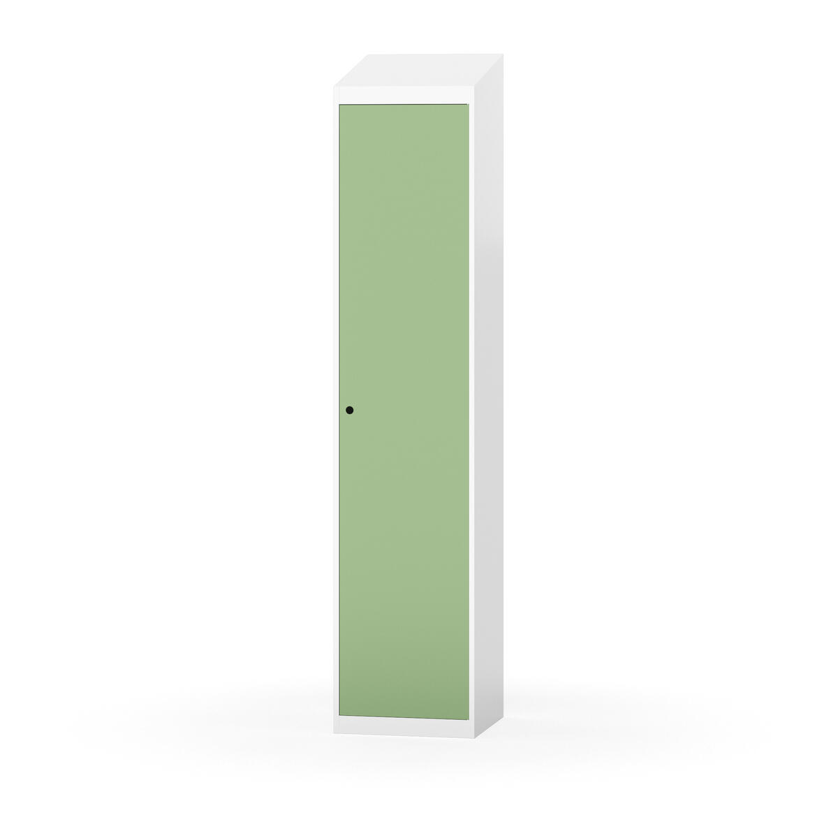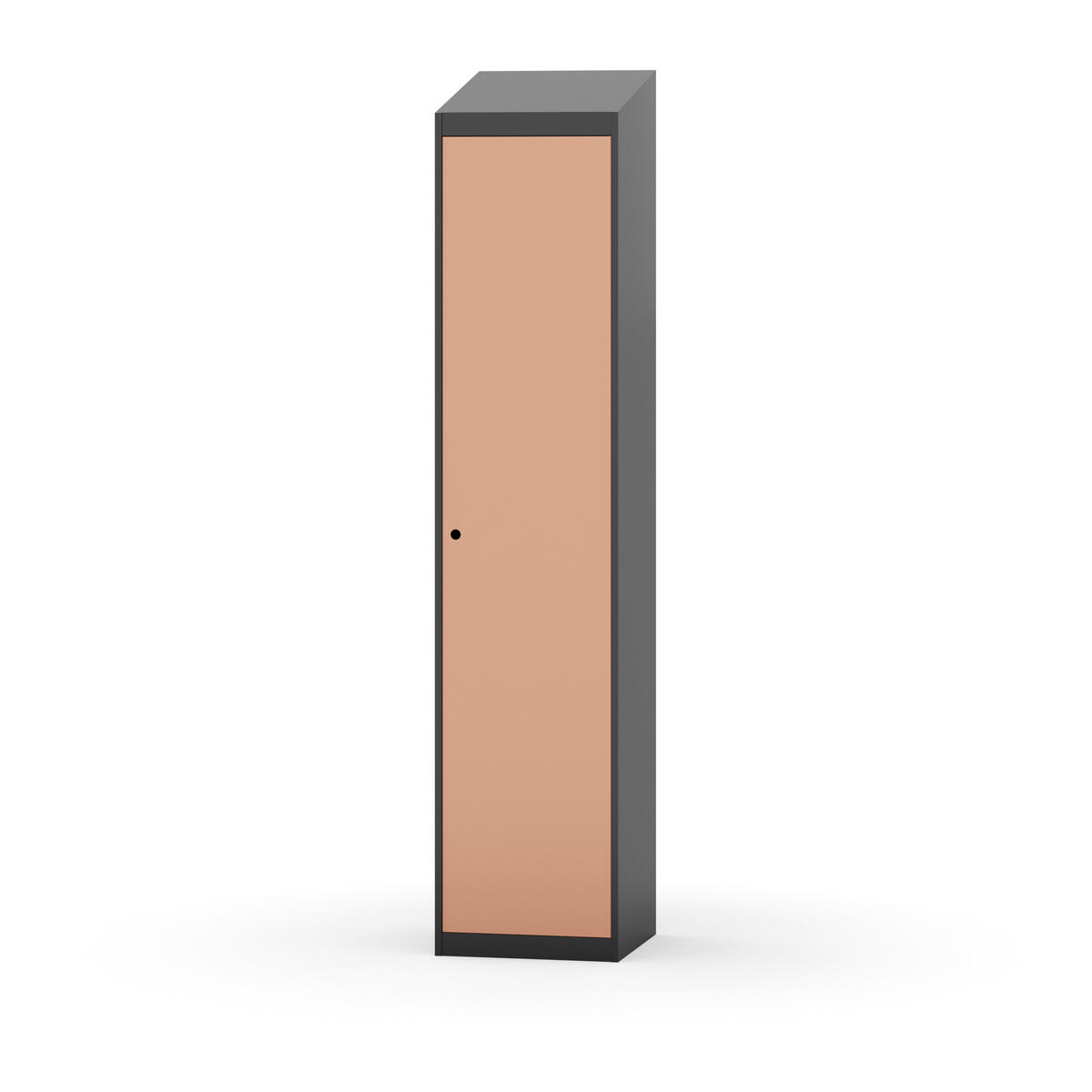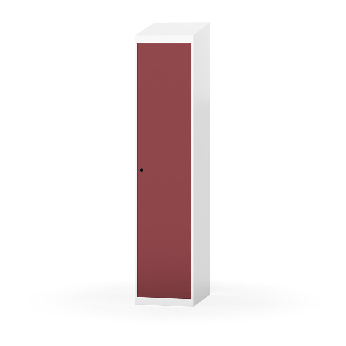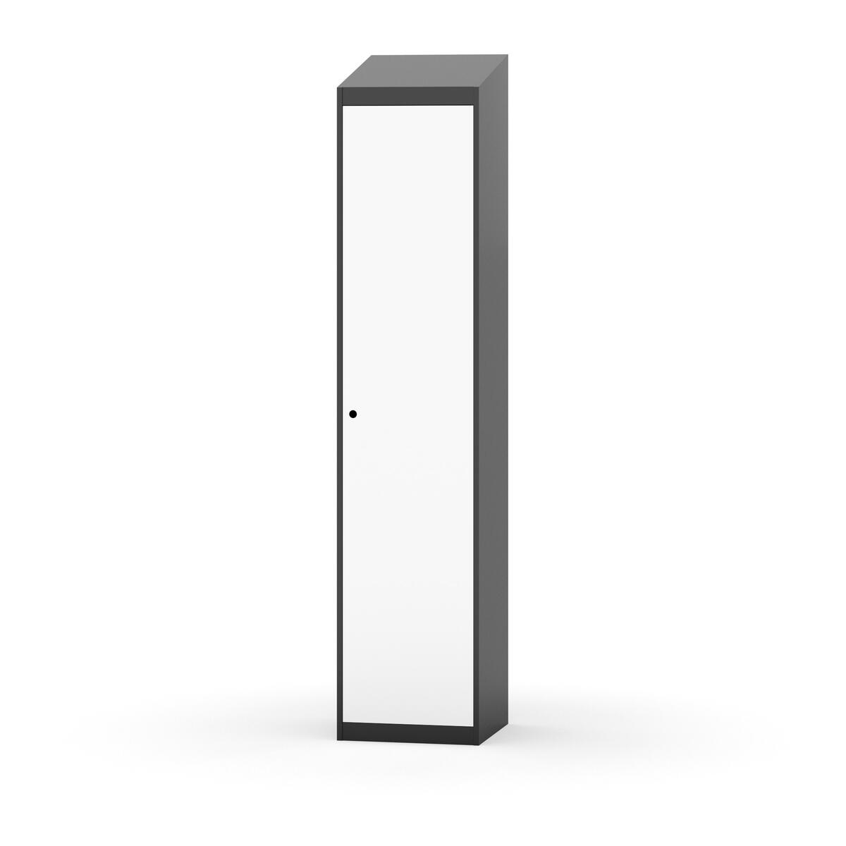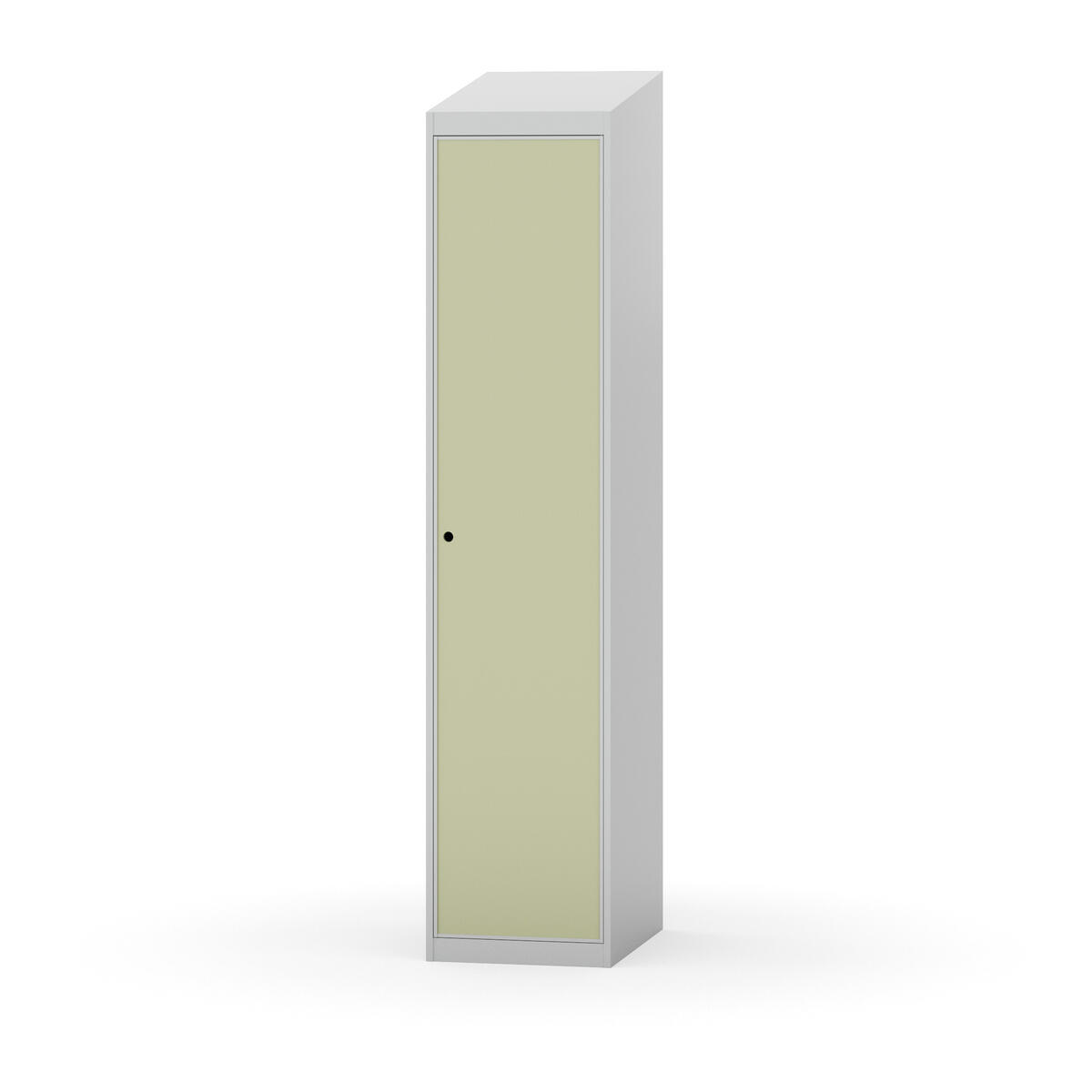 Garderobeskab med fuldsvejset stel. Vælg mellem låge i metal eller laminat. Metallågen er udstyret med dørstopper i stål og indvendig forstærkningsplade omkring låsehullet. Laminatlågen er indstøbt i en stålramme, som er udstyret med dørstopper i stål. Lågerne kan åbnes 90 grader. Indretning: Hylde og bøjlestang med to praktiske ankerkroge. Plan bund uden kant. Ventilation gennem huller i top-/bundplade. Bemærk, at lås samt sokkel/ben bestilles på separate varenumre. Leveres med færdigmonteret lås. Det valgte understel monteres ved levering.