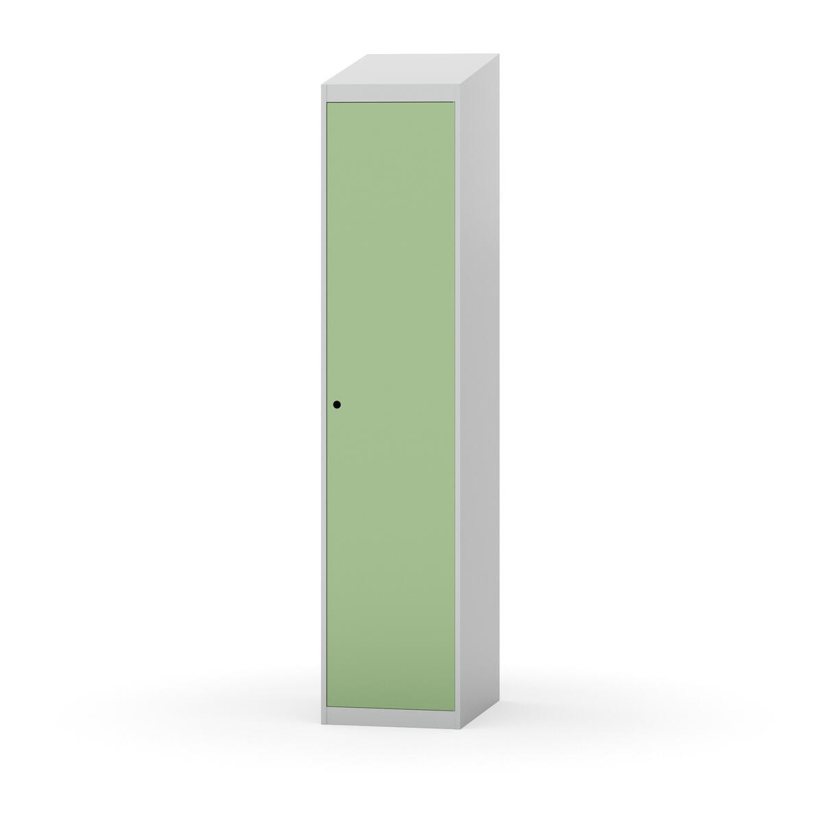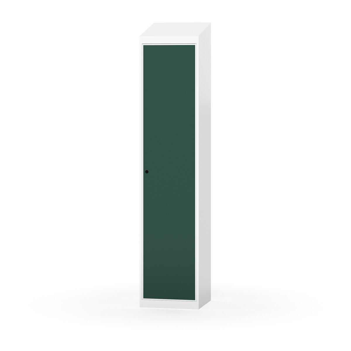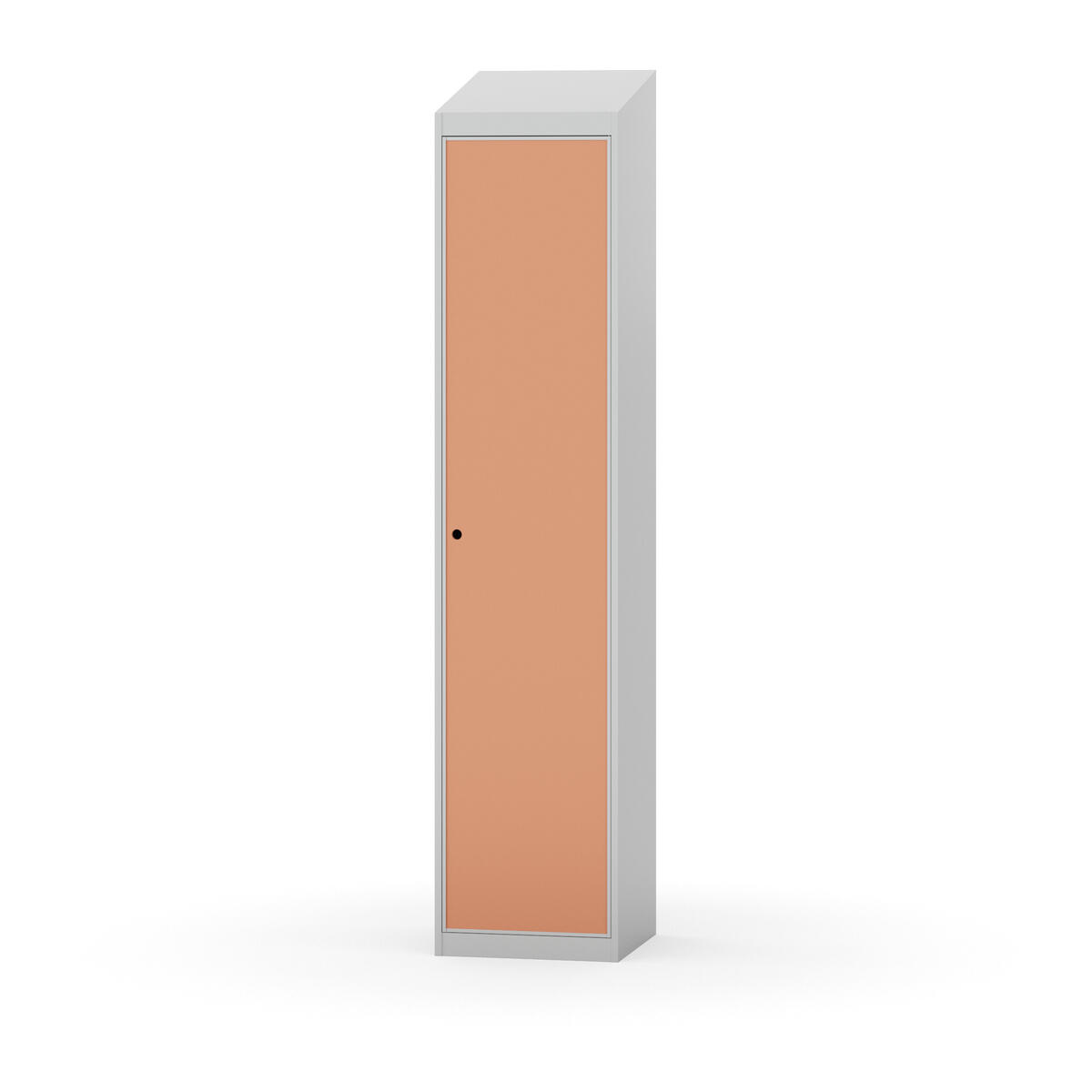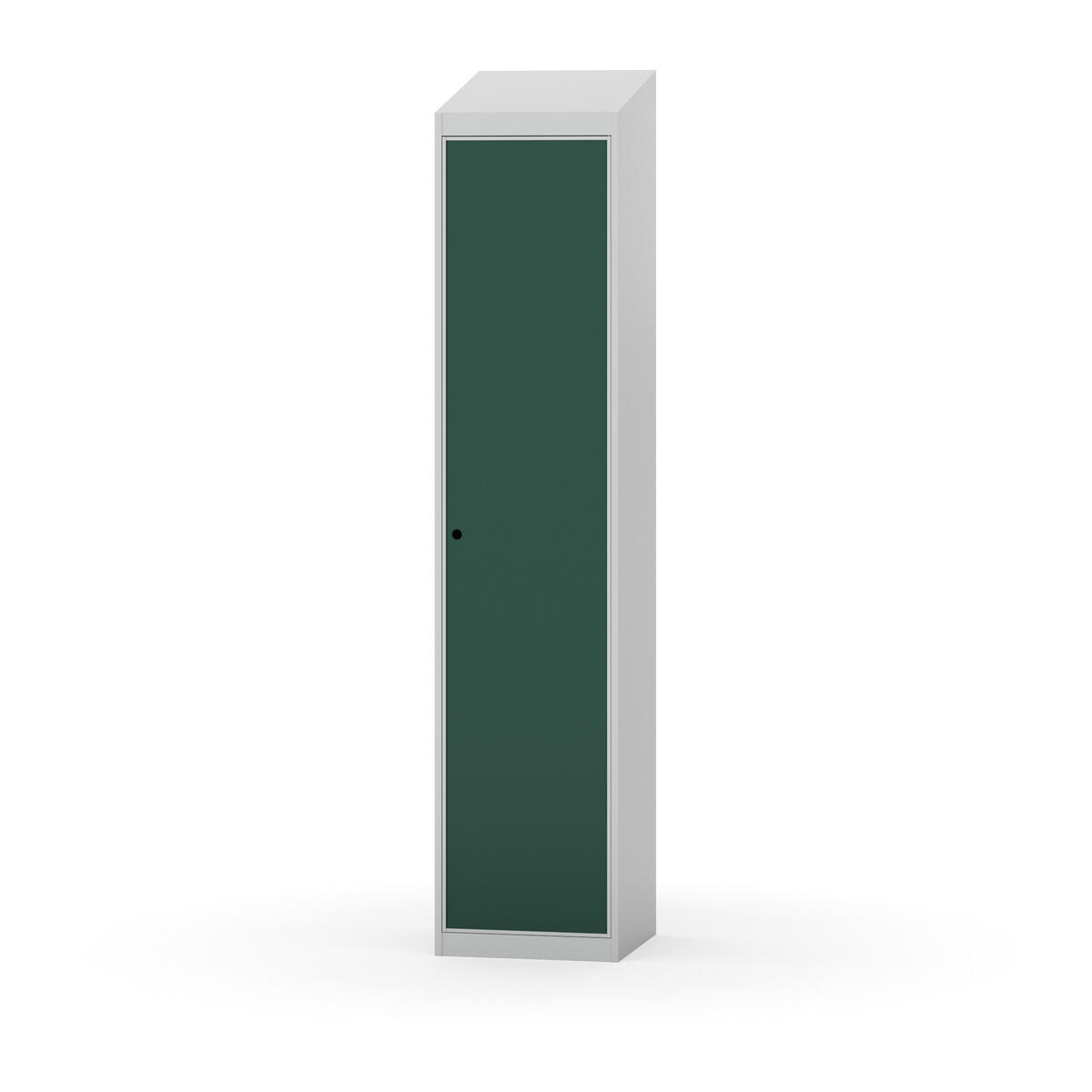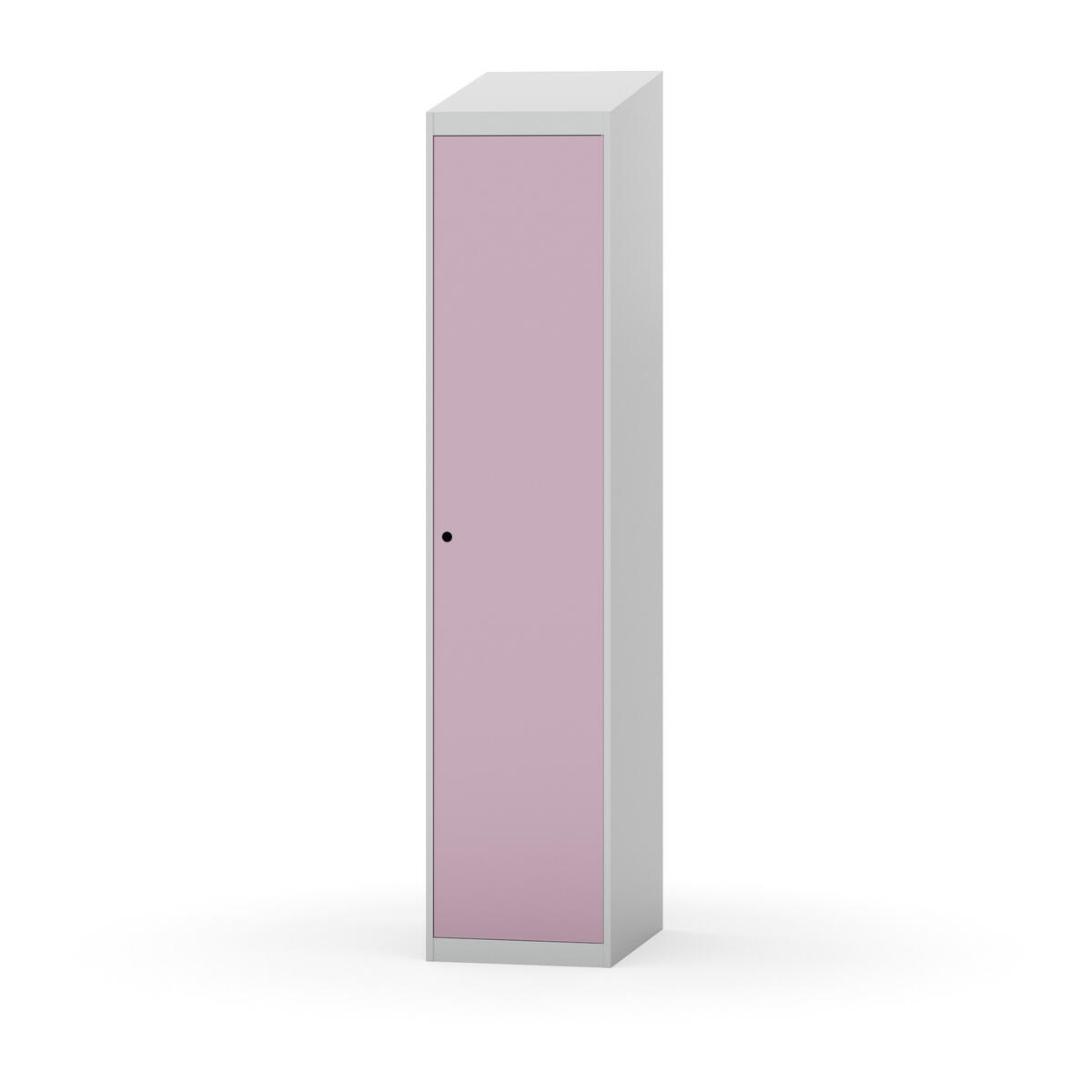Garderobeskab med fuldsvejset stel. Vælg mellem låge i metal eller laminat. Metallågen er udstyret med dørstopper i stål og indvendig forstærkningsplade omkring låsehullet. Laminatlågen er indstøbt i en stålramme, som er udstyret med dørstopper i stål. Lågerne kan åbnes 90 grader. Indretning: Hylde og bøjlestang med to praktiske ankerkroge. Plan bund uden kant. Ventilation gennem huller i top-/bundplade. Bemærk, at lås samt sokkel/ben bestilles på separate varenumre. Leveres med færdigmonteret lås. Det valgte understel monteres ved levering.
