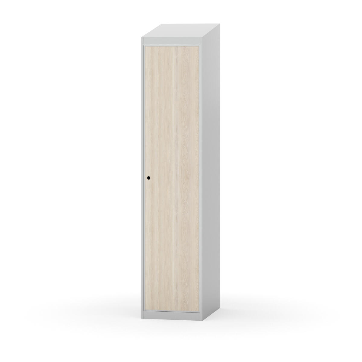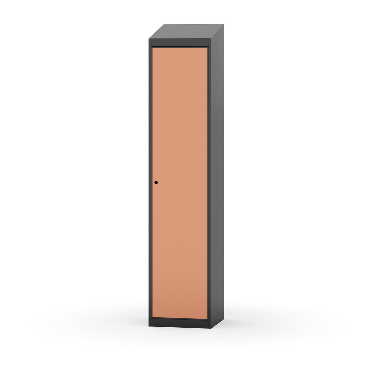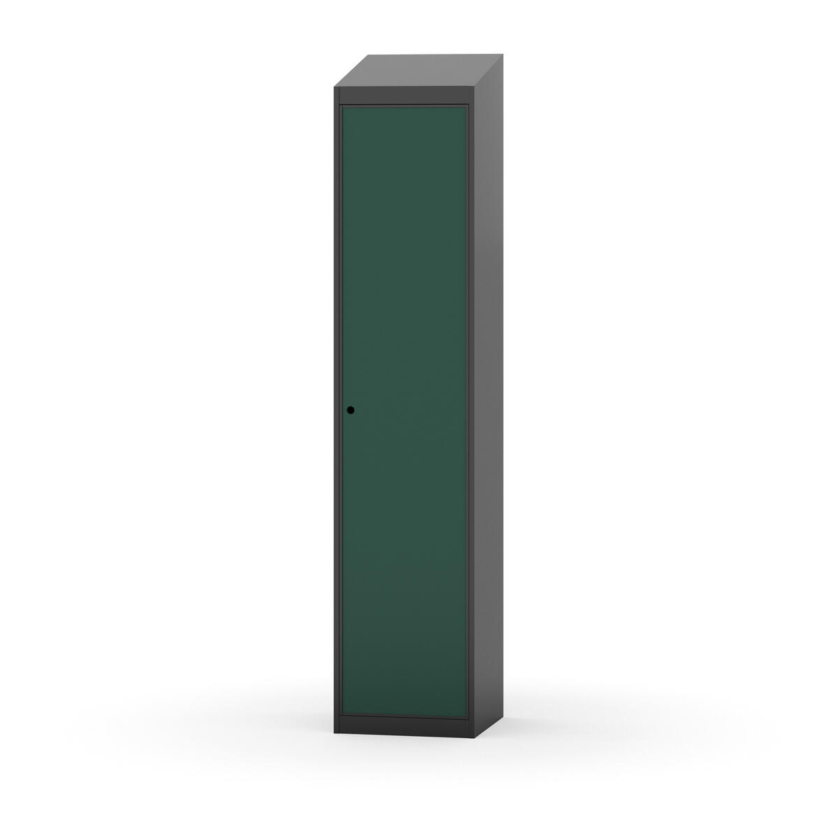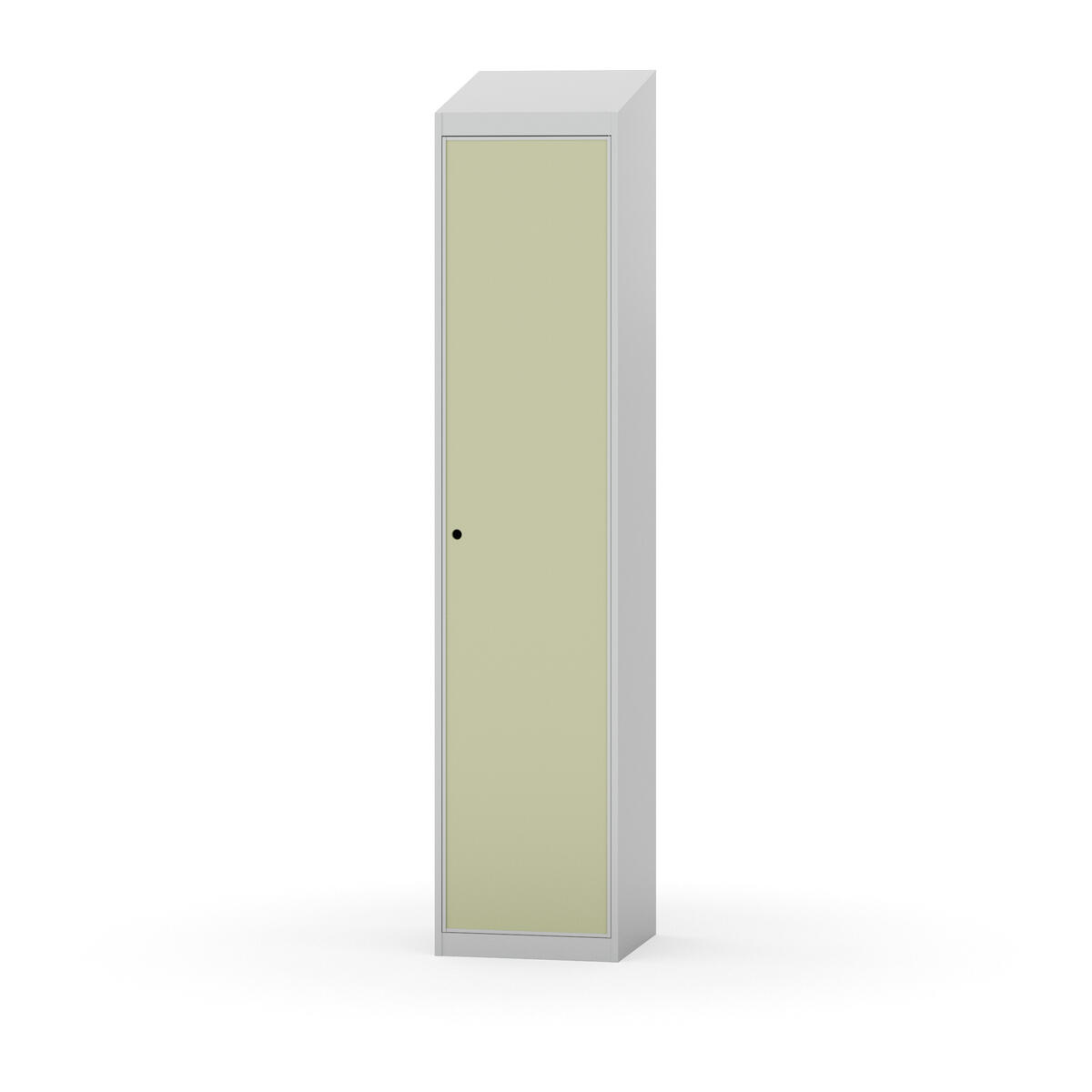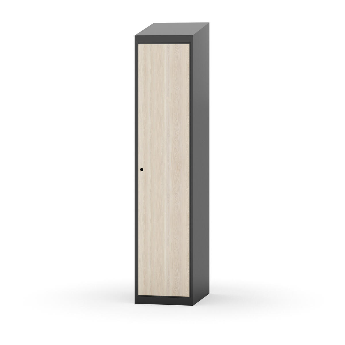 Garderobeskab med fuldsvejset stel. Vælg mellem låge i metal eller laminat. Metallågen er udstyret med dørstopper i stål og indvendig forstærkningsplade omkring låsehullet. Laminatlågen er indstøbt i en stålramme, som er udstyret med dørstopper i stål. Lågerne kan åbnes 90 grader. Indretning: Hylde og bøjlestang med to praktiske ankerkroge. Plan bund uden kant. Ventilation gennem huller i top-/bundplade. Bemærk, at lås samt sokkel/ben bestilles på separate varenumre. Leveres med færdigmonteret lås. Det valgte understel monteres ved levering.