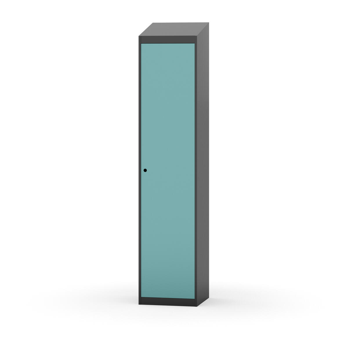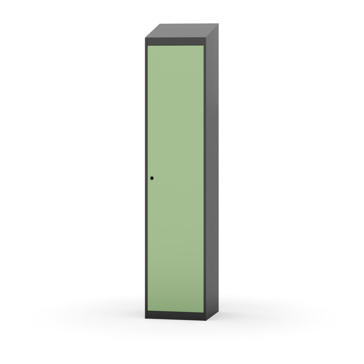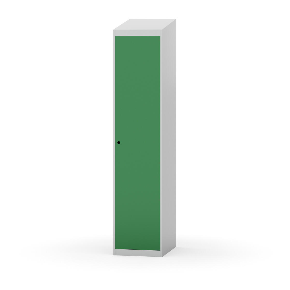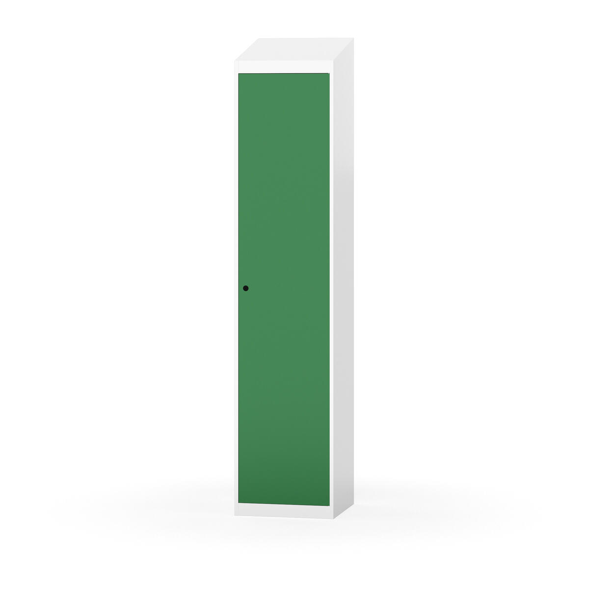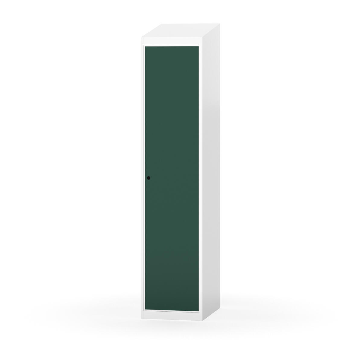 Garderobeskab med fuldsvejset stel. Vælg mellem låge i metal eller laminat. Metallågen er udstyret med dørstopper i stål og indvendig forstærkningsplade omkring låsehullet. Laminatlågen er indstøbt i en stålramme, som er udstyret med dørstopper i stål. Lågerne kan åbnes 90 grader. Indretning: Hylde og bøjlestang med to praktiske ankerkroge. Plan bund uden kant. Ventilation gennem huller i top-/bundplade. Bemærk, at lås samt sokkel/ben bestilles på separate varenumre. Leveres med færdigmonteret lås. Det valgte understel monteres ved levering.