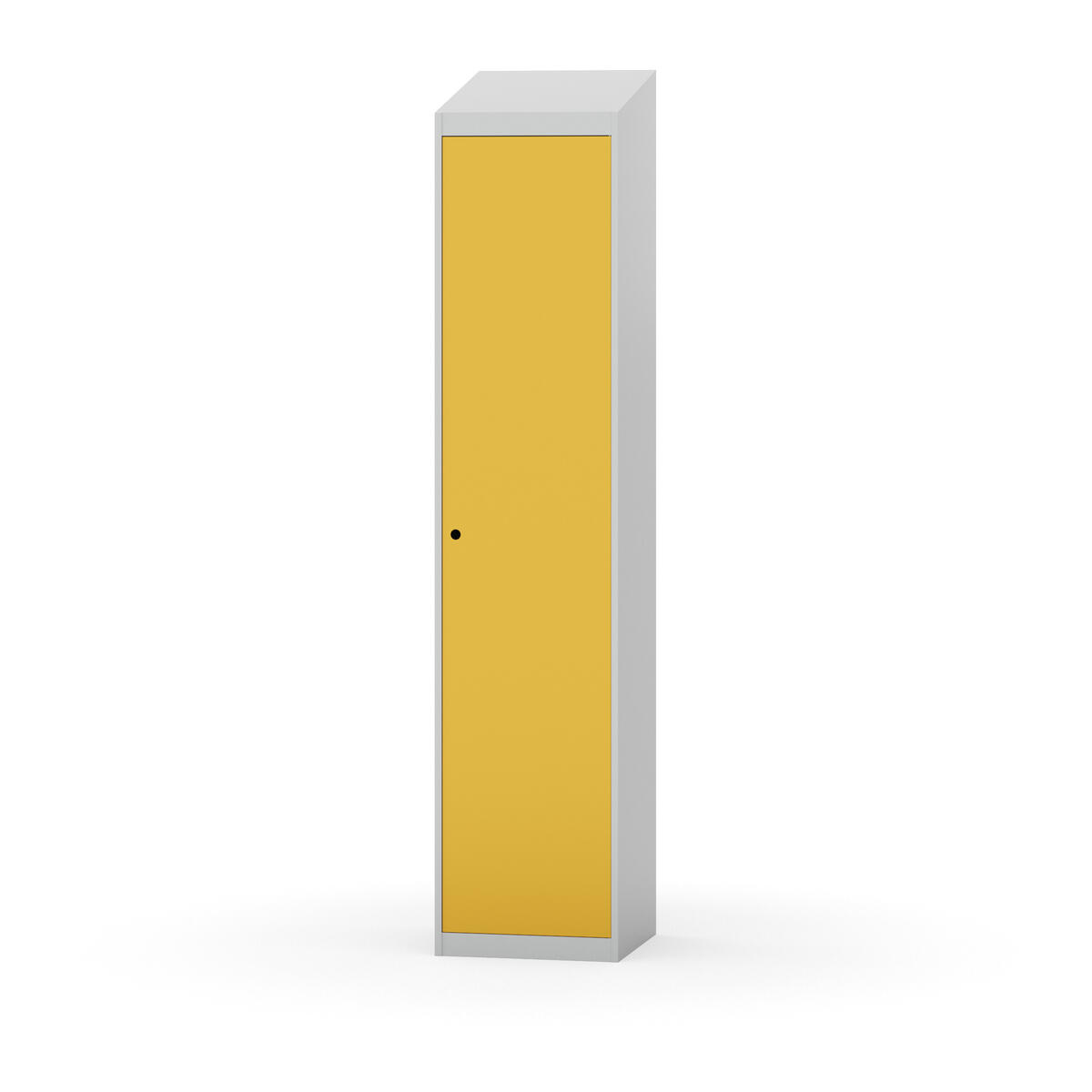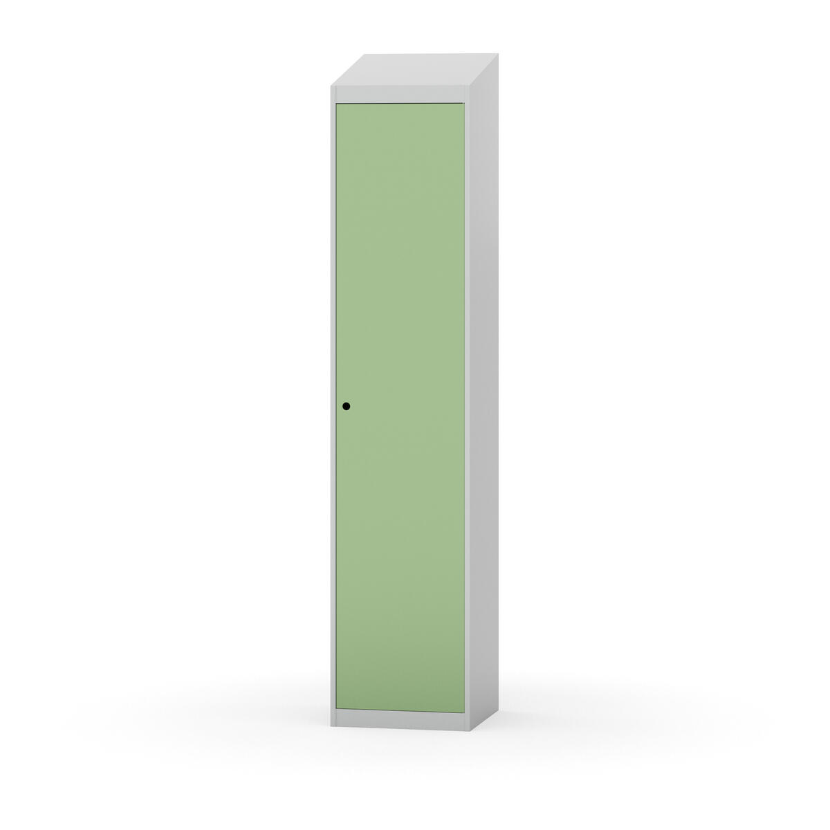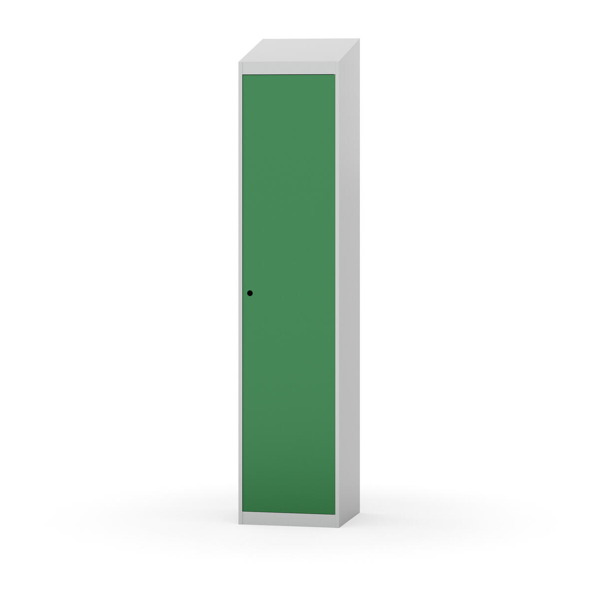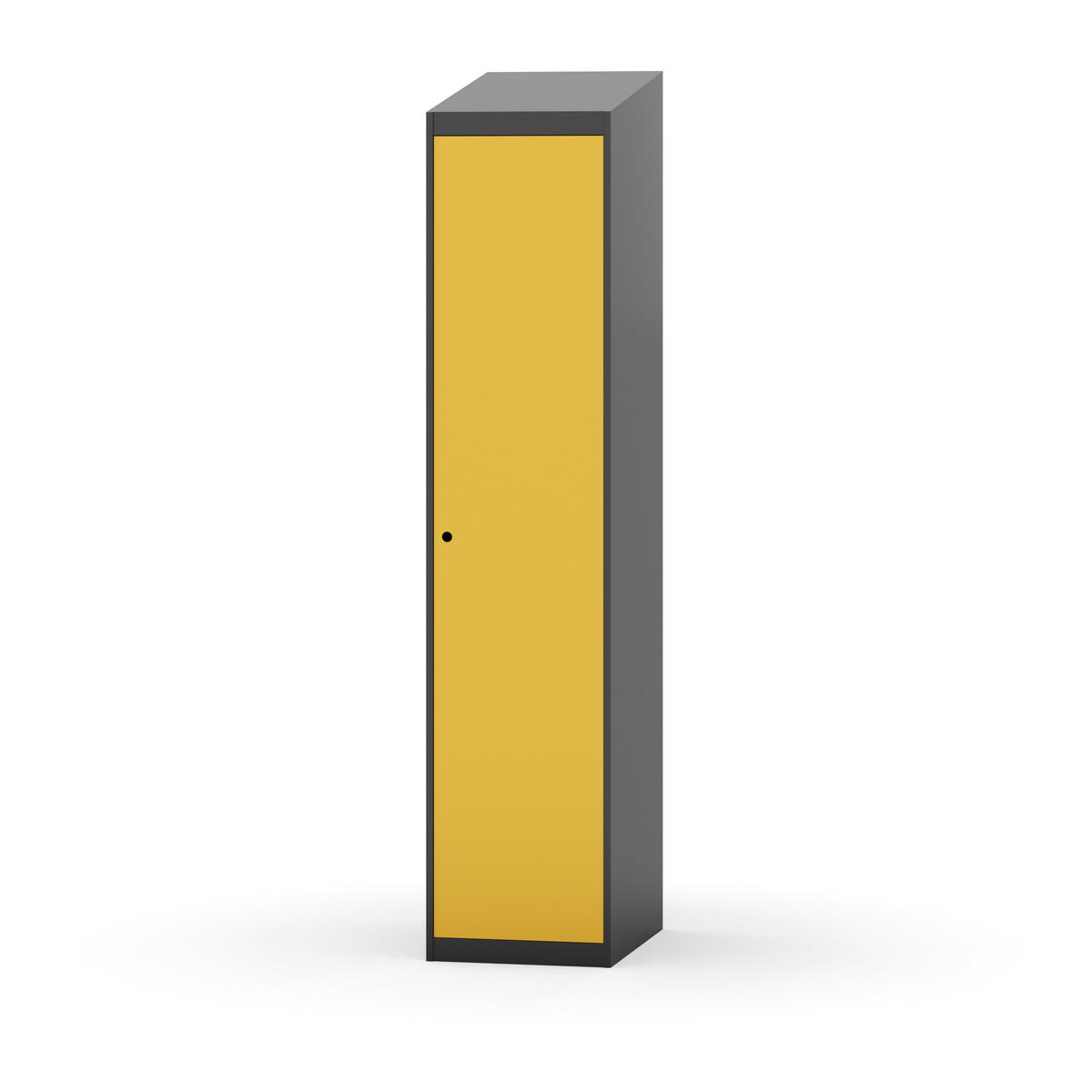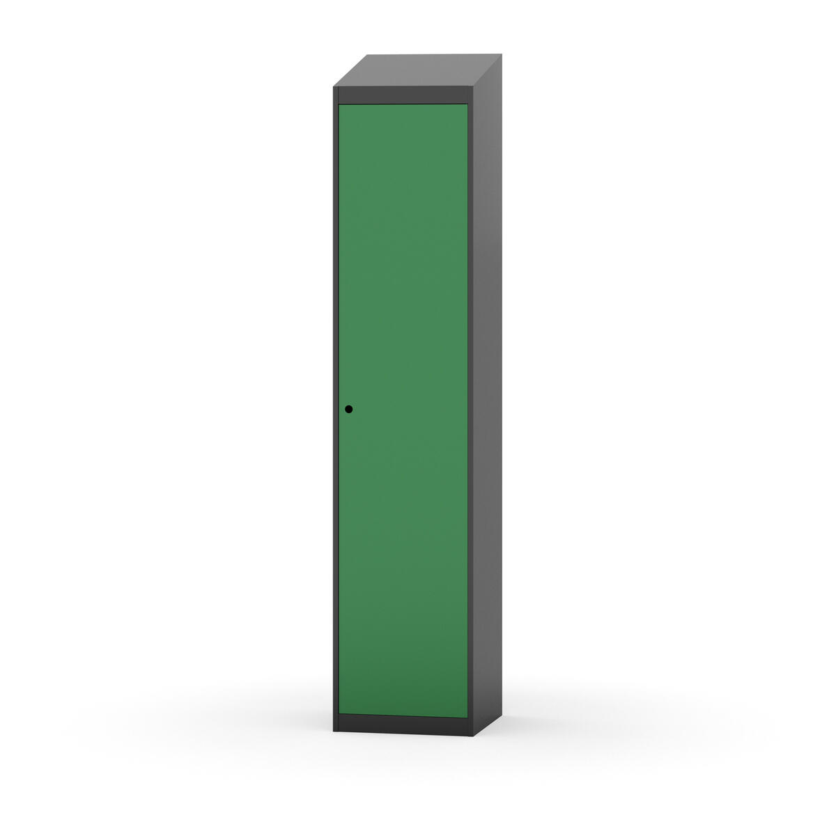 Garderobeskab med fuldsvejset stel. Vælg mellem låge i metal eller laminat. Metallågen er udstyret med dørstopper i stål og indvendig forstærkningsplade omkring låsehullet. Laminatlågen er indstøbt i en stålramme, som er udstyret med dørstopper i stål. Lågerne kan åbnes 90 grader. Indretning: Hylde og bøjlestang med to praktiske ankerkroge. Plan bund uden kant. Ventilation gennem huller i top-/bundplade. Bemærk, at lås samt sokkel/ben bestilles på separate varenumre. Leveres med færdigmonteret lås. Det valgte understel monteres ved levering.