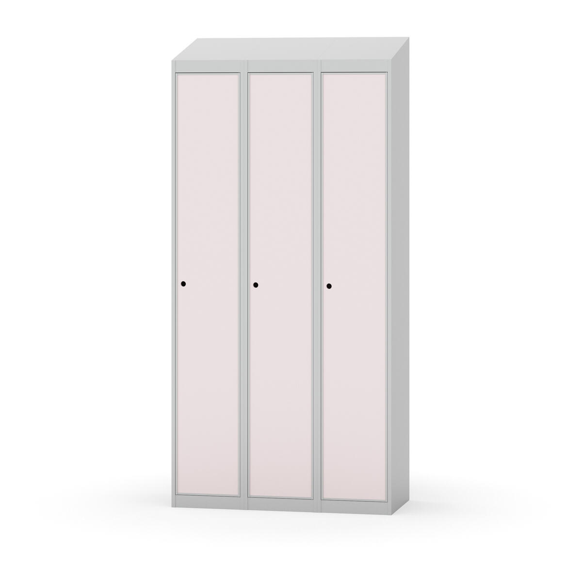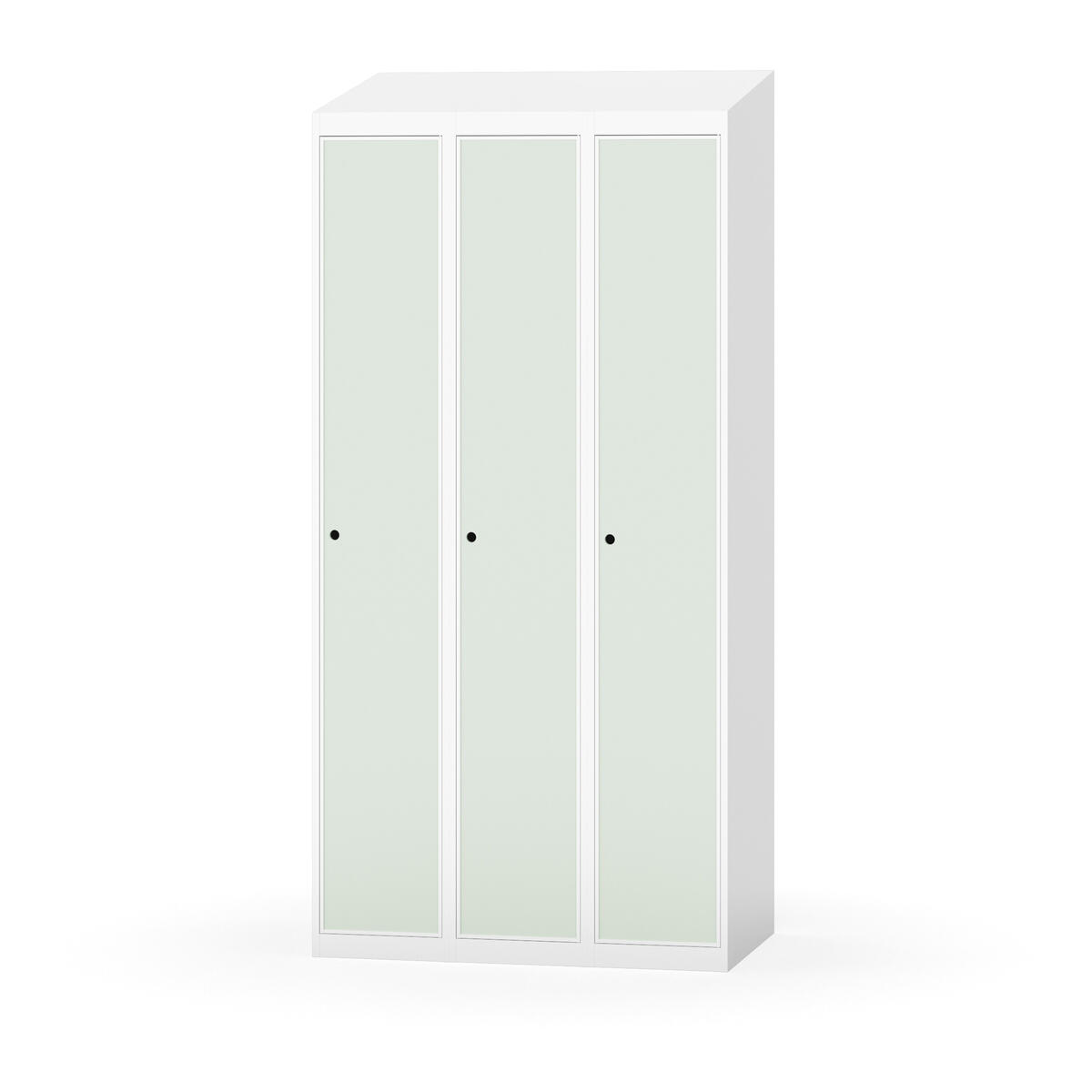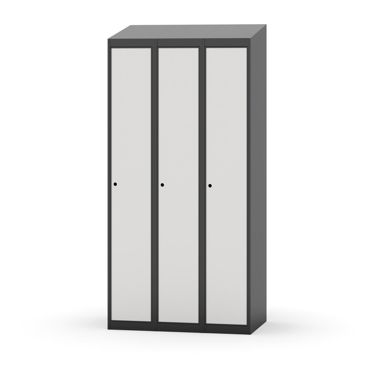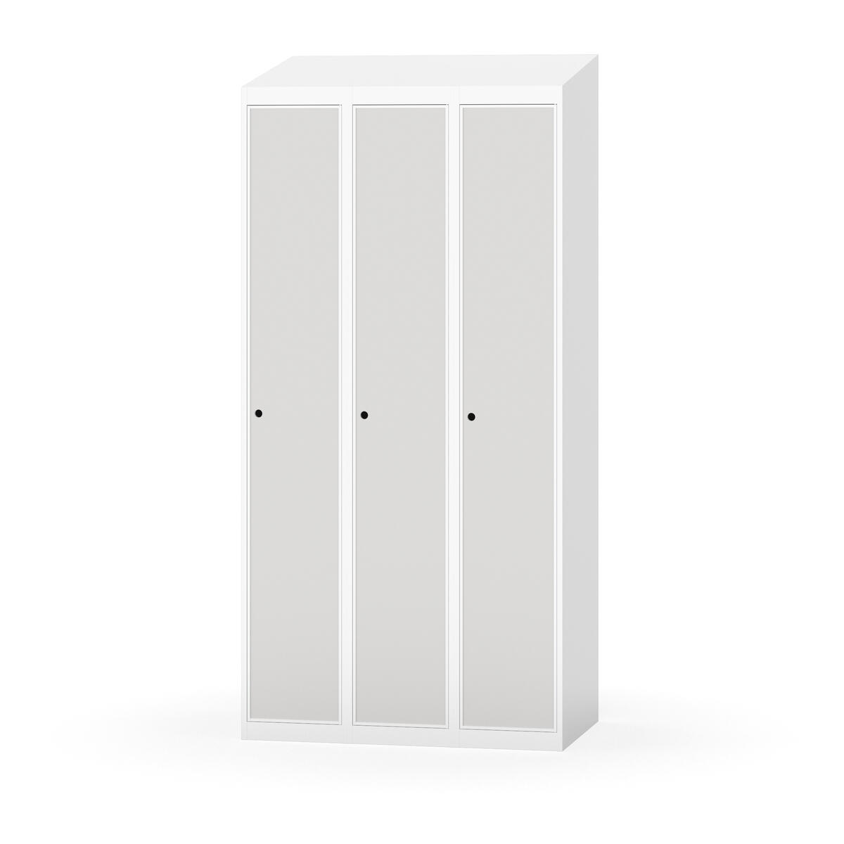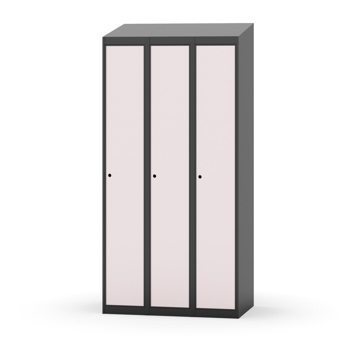 Garderobeskab med fuldsvejset stel. Vælg mellem låge i metal eller laminat. Metallågen er udstyret med dørstopper i stål og indvendig forstærkningsplade omkring låsehullet. Laminatlågen er indstøbt i en stålramme, som er udstyret med dørstopper i stål. Lågerne kan åbnes 90 grader. Indretning: Hylde og bøjlestang med to praktiske ankerkroge. Plan bund uden kant. Ventilation gennem huller i top-/bundplade. Bemærk, at lås samt sokkel/ben bestilles på separate varenumre. Leveres med færdigmonteret lås. Det valgte understel monteres ved levering.