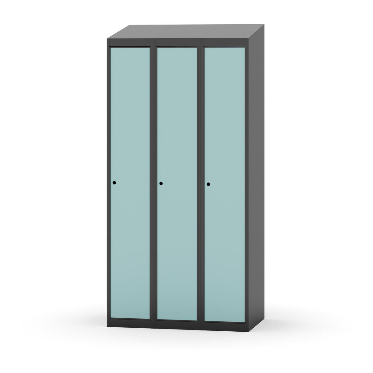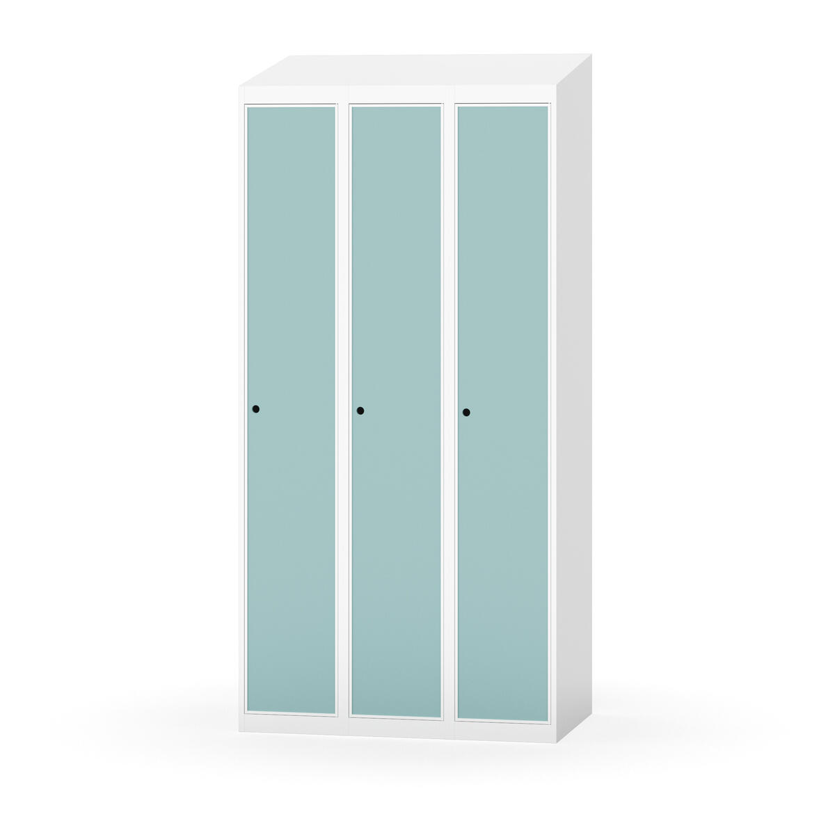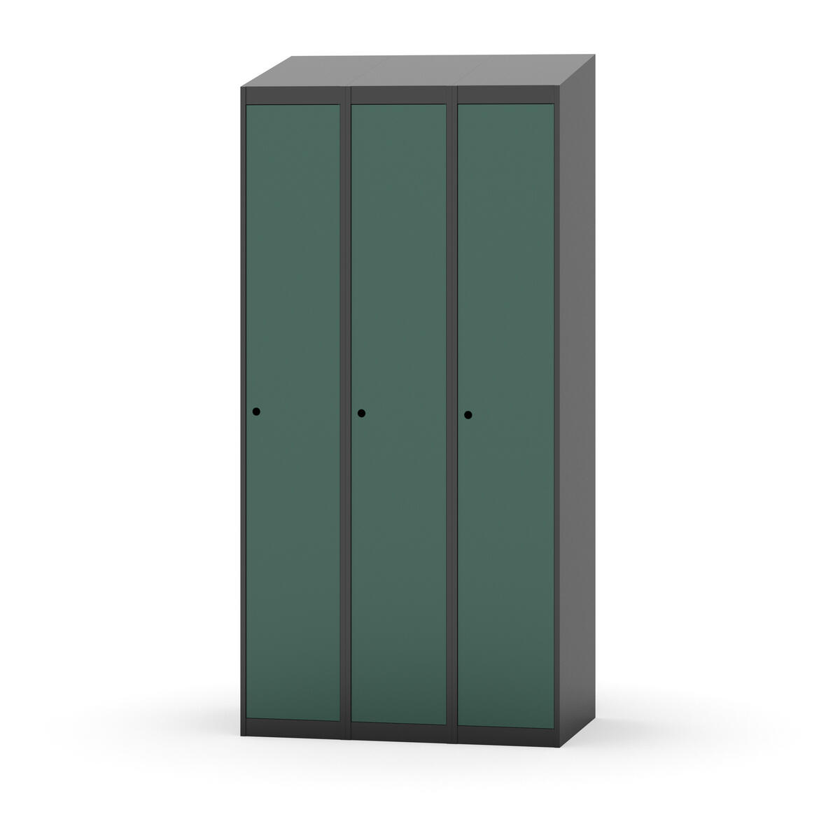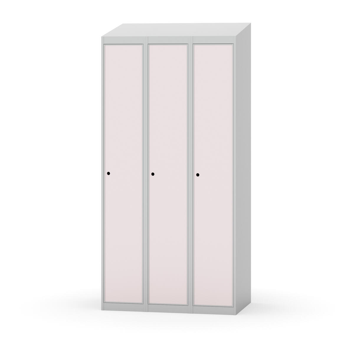 Garderobeskab med fuldsvejset stel. Vælg mellem låge i metal eller laminat. Metallågen er udstyret med dørstopper i stål og indvendig forstærkningsplade omkring låsehullet. Laminatlågen er indstøbt i en stålramme, som er udstyret med dørstopper i stål. Lågerne kan åbnes 90 grader. Indretning: Hylde og bøjlestang med to praktiske ankerkroge. Plan bund uden kant. Ventilation gennem huller i top-/bundplade. Bemærk, at lås samt sokkel/ben bestilles på separate varenumre. Leveres med færdigmonteret lås. Det valgte understel monteres ved levering.