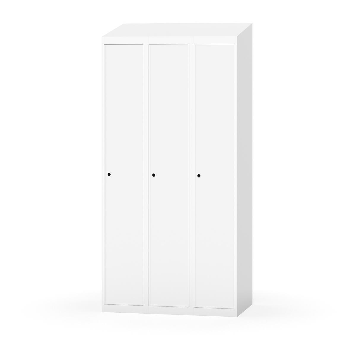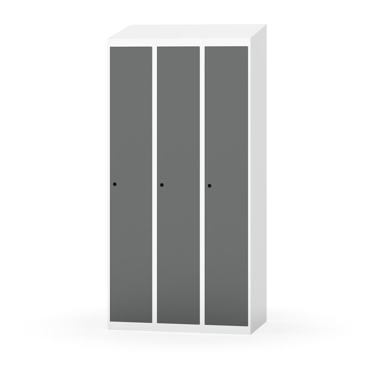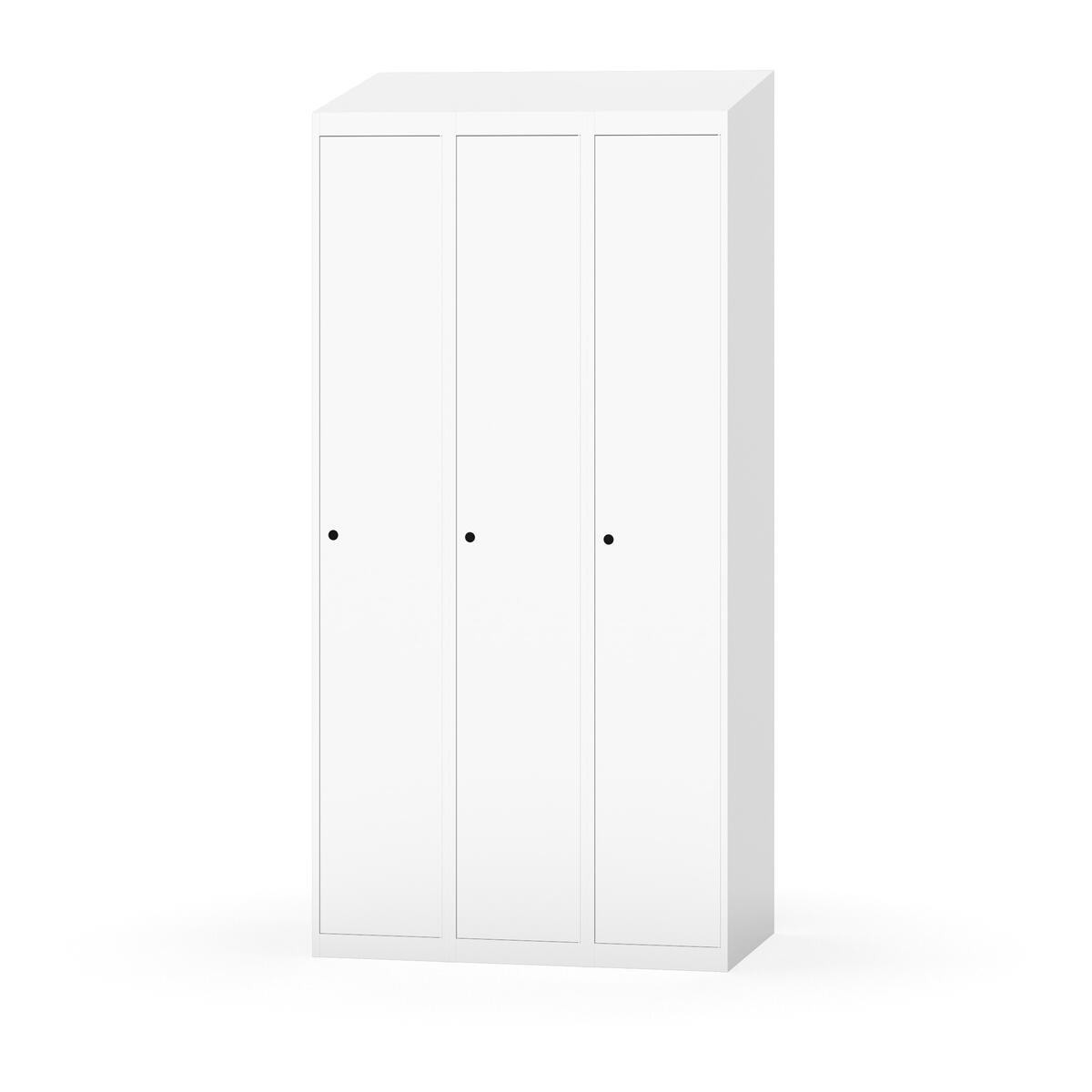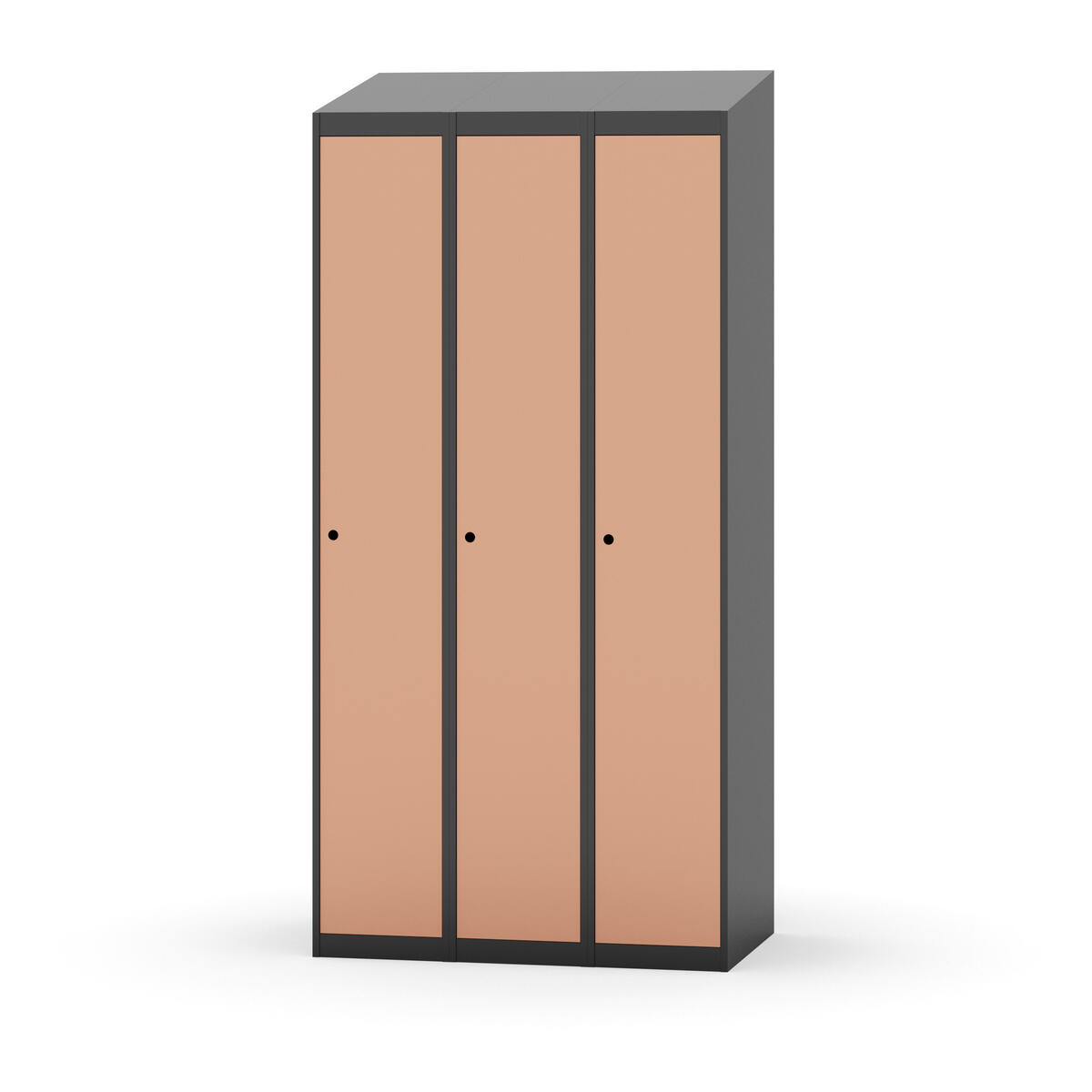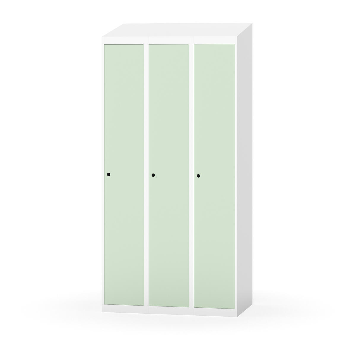 Garderobeskab med fuldsvejset stel. Vælg mellem låge i metal eller laminat. Metallågen er udstyret med dørstopper i stål og indvendig forstærkningsplade omkring låsehullet. Laminatlågen er indstøbt i en stålramme, som er udstyret med dørstopper i stål. Lågerne kan åbnes 90 grader. Indretning: Hylde og bøjlestang med to praktiske ankerkroge. Plan bund uden kant. Ventilation gennem huller i top-/bundplade. Bemærk, at lås samt sokkel/ben bestilles på separate varenumre. Leveres med færdigmonteret lås. Det valgte understel monteres ved levering.