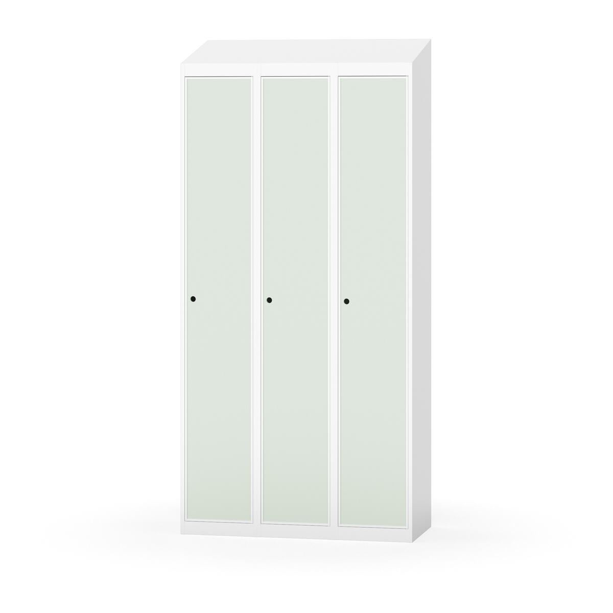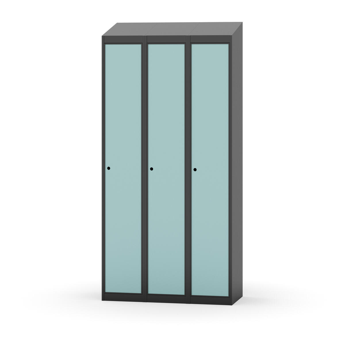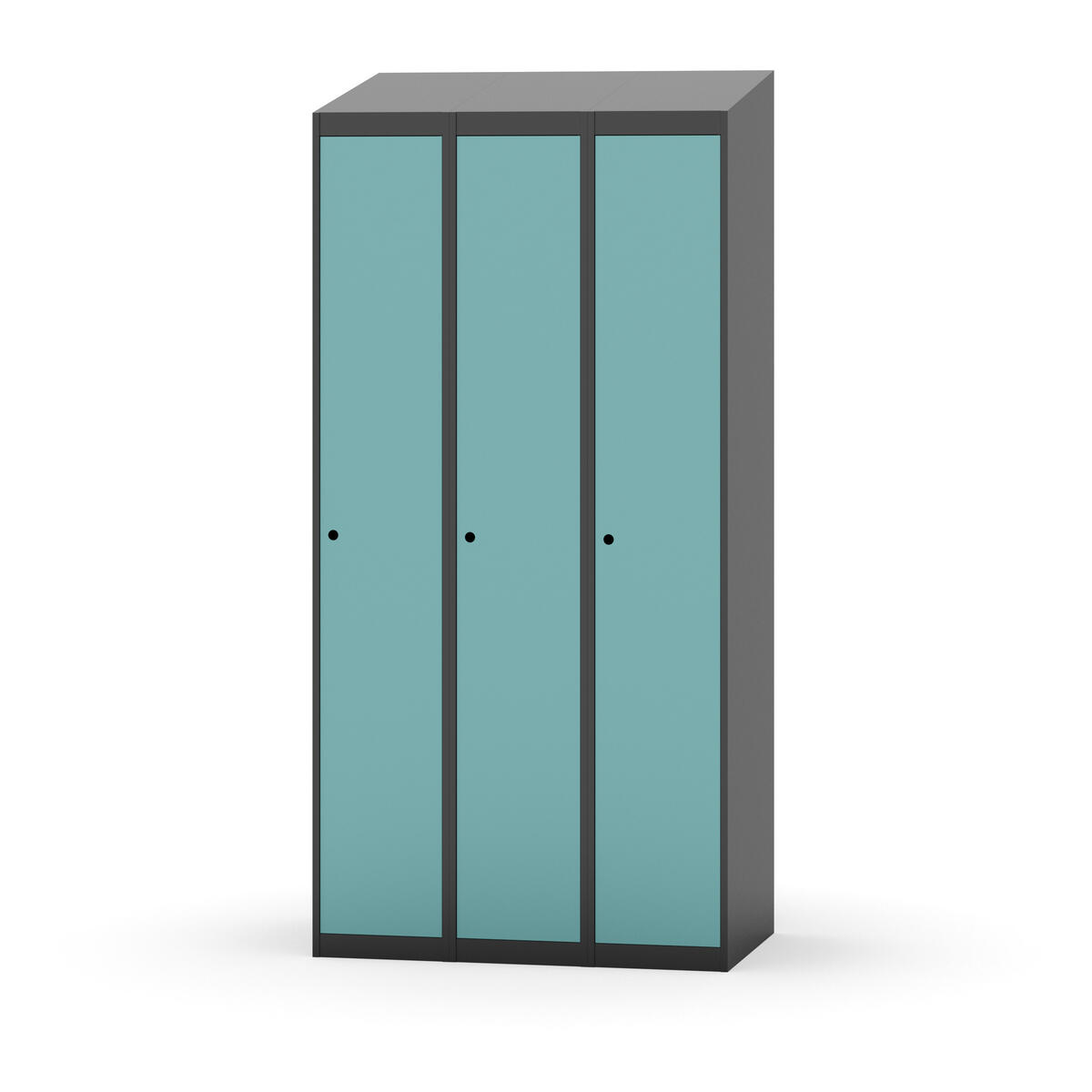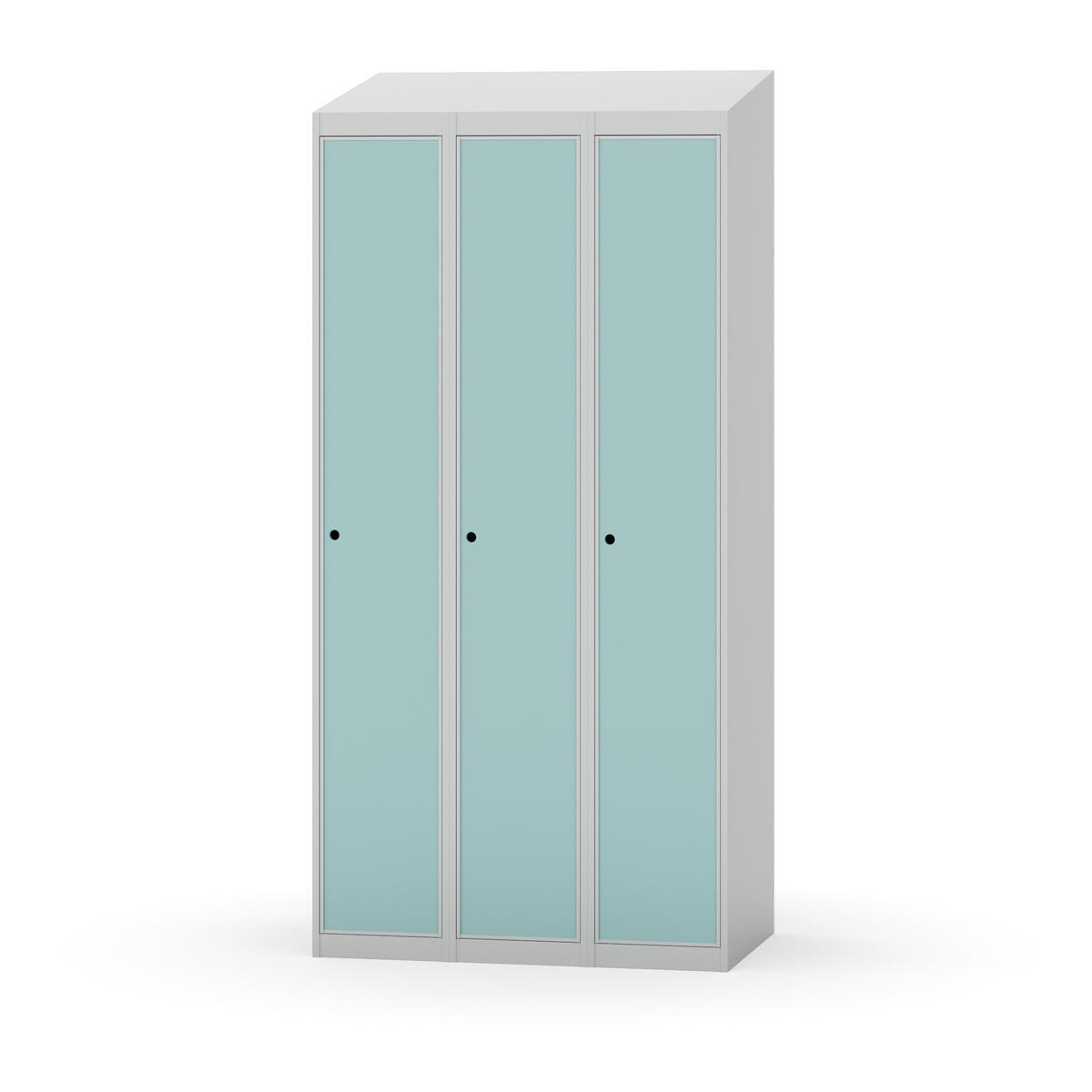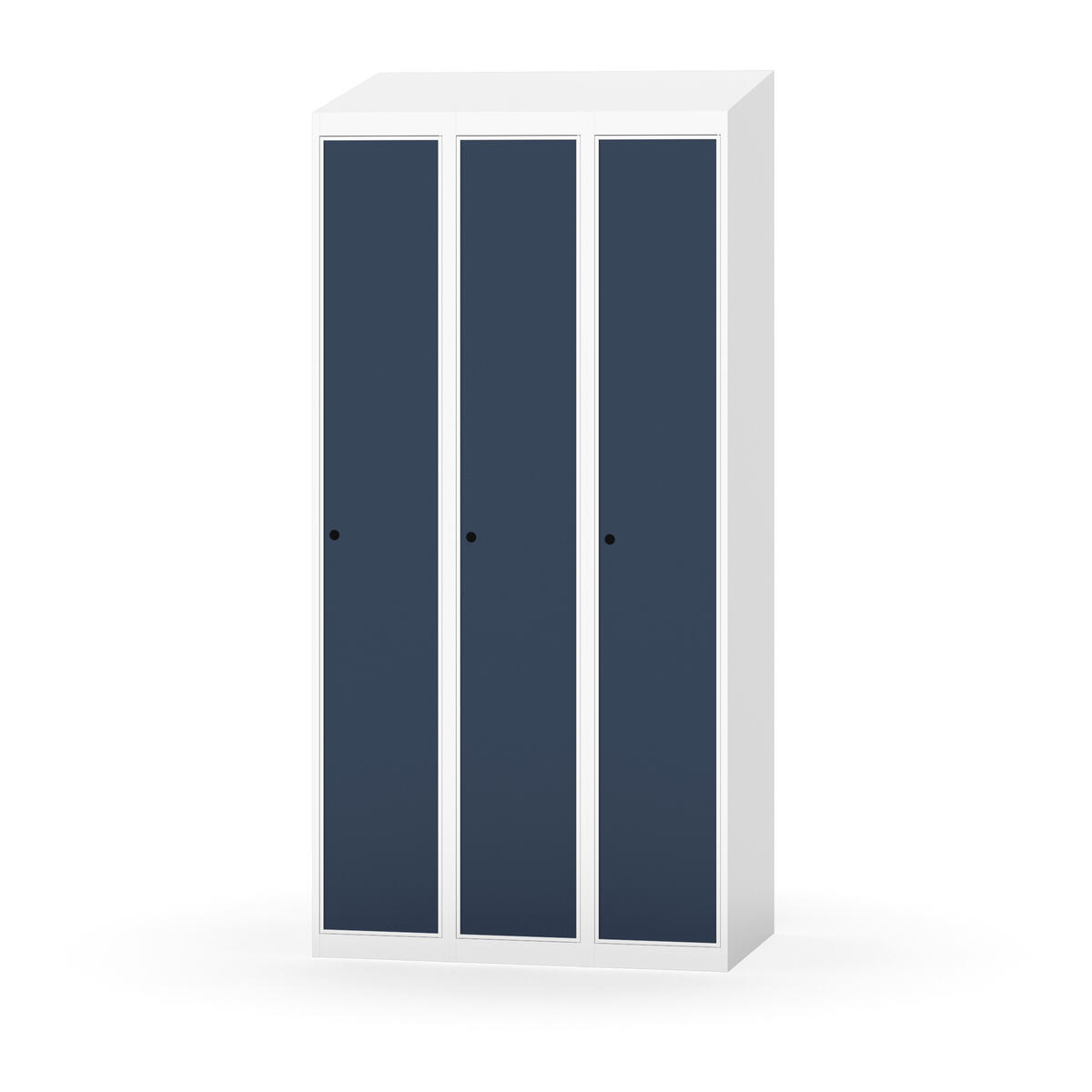 Garderobeskab med fuldsvejset stel. Vælg mellem låge i metal eller laminat. Metallågen er udstyret med dørstopper i stål og indvendig forstærkningsplade omkring låsehullet. Laminatlågen er indstøbt i en stålramme, som er udstyret med dørstopper i stål. Lågerne kan åbnes 90 grader. Indretning: Hylde og bøjlestang med to praktiske ankerkroge. Plan bund uden kant. Ventilation gennem huller i top-/bundplade. Bemærk, at lås samt sokkel/ben bestilles på separate varenumre. Leveres med færdigmonteret lås. Det valgte understel monteres ved levering.