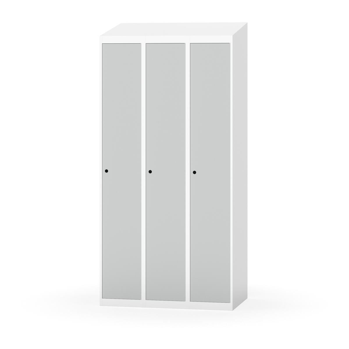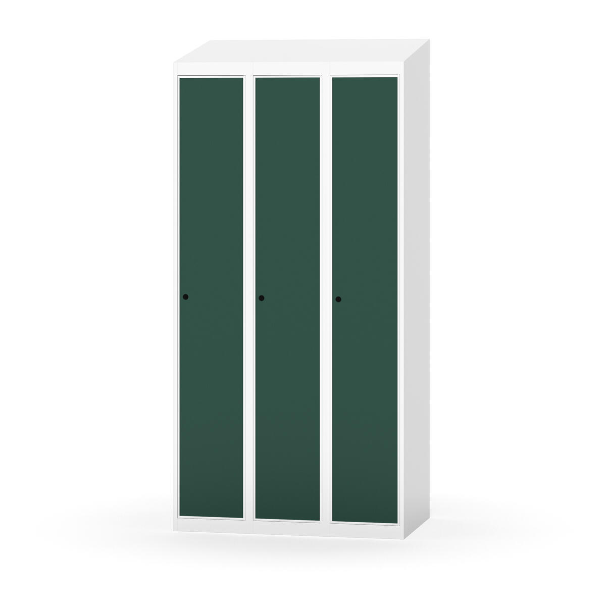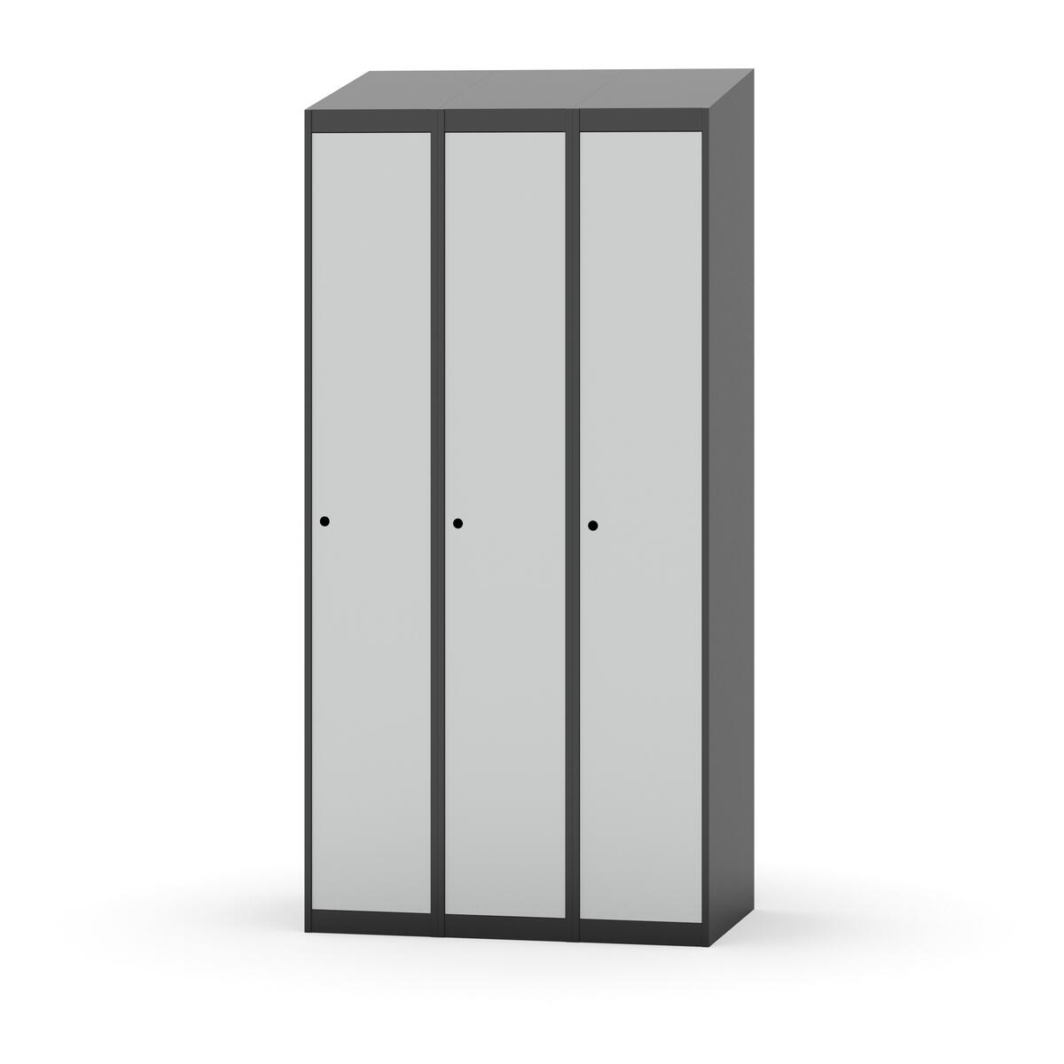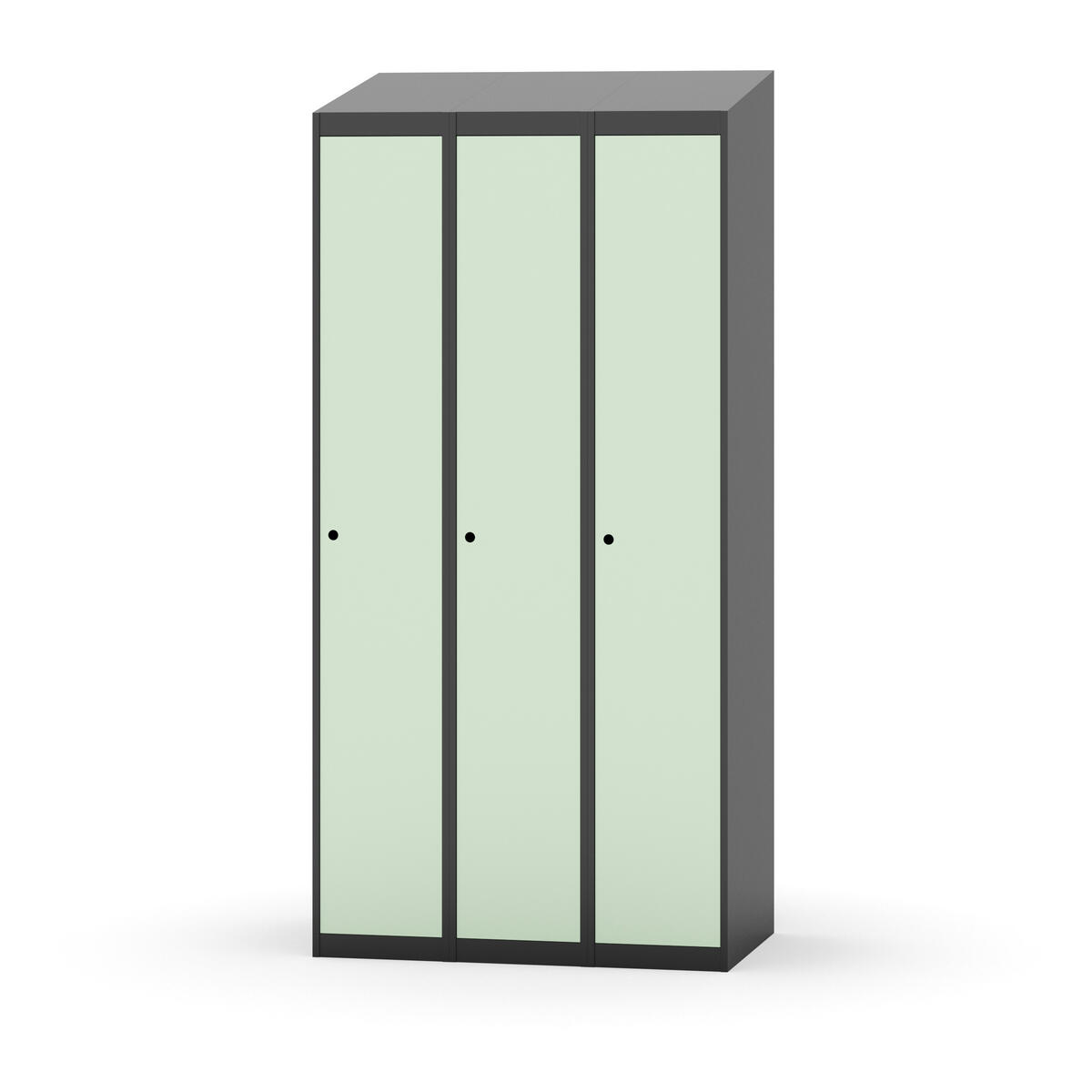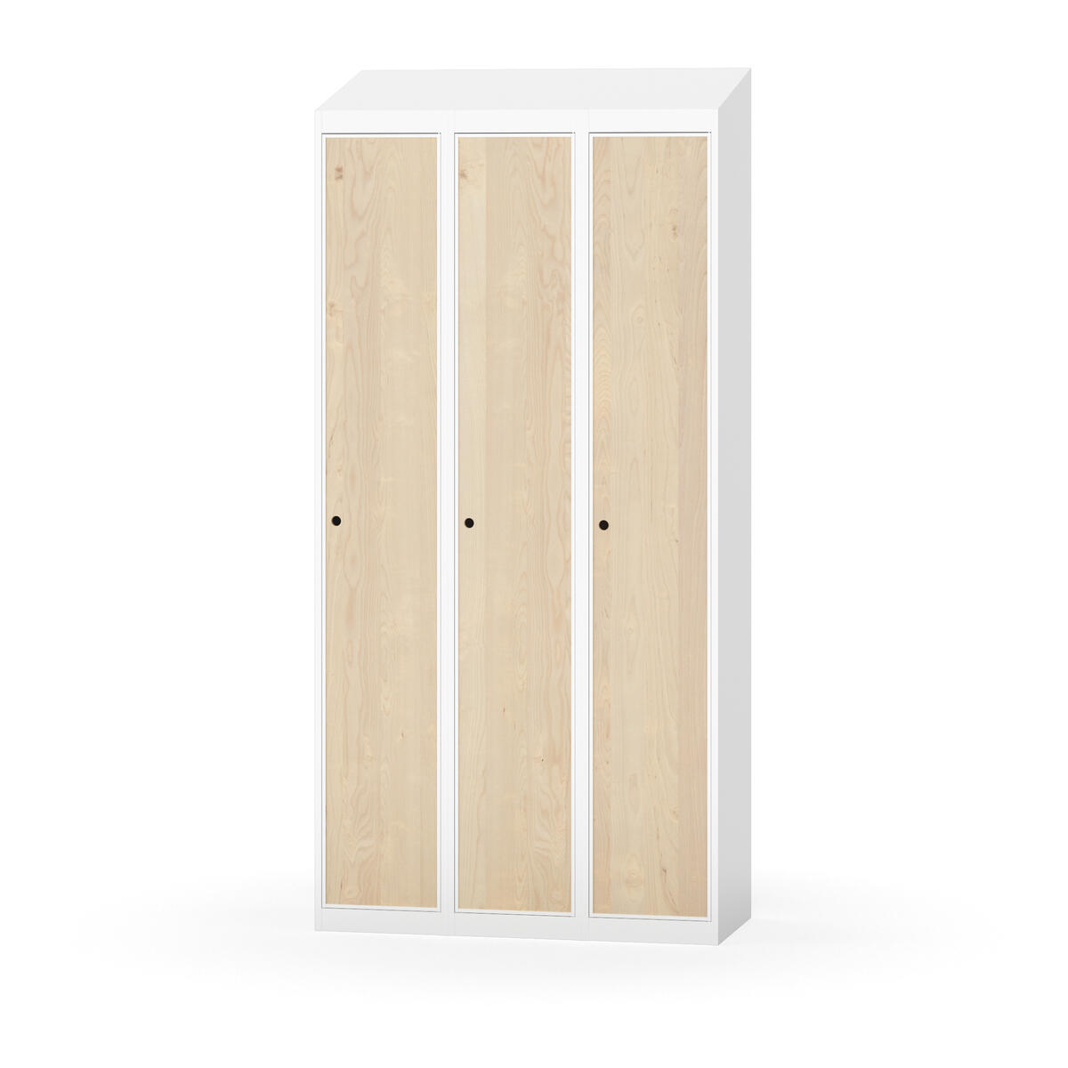 Garderobeskab med fuldsvejset stel. Vælg mellem låge i metal eller laminat. Metallågen er udstyret med dørstopper i stål og indvendig forstærkningsplade omkring låsehullet. Laminatlågen er indstøbt i en stålramme, som er udstyret med dørstopper i stål. Lågerne kan åbnes 90 grader. Indretning: Hylde og bøjlestang med to praktiske ankerkroge. Plan bund uden kant. Ventilation gennem huller i top-/bundplade. Bemærk, at lås samt sokkel/ben bestilles på separate varenumre. Leveres med færdigmonteret lås. Det valgte understel monteres ved levering.