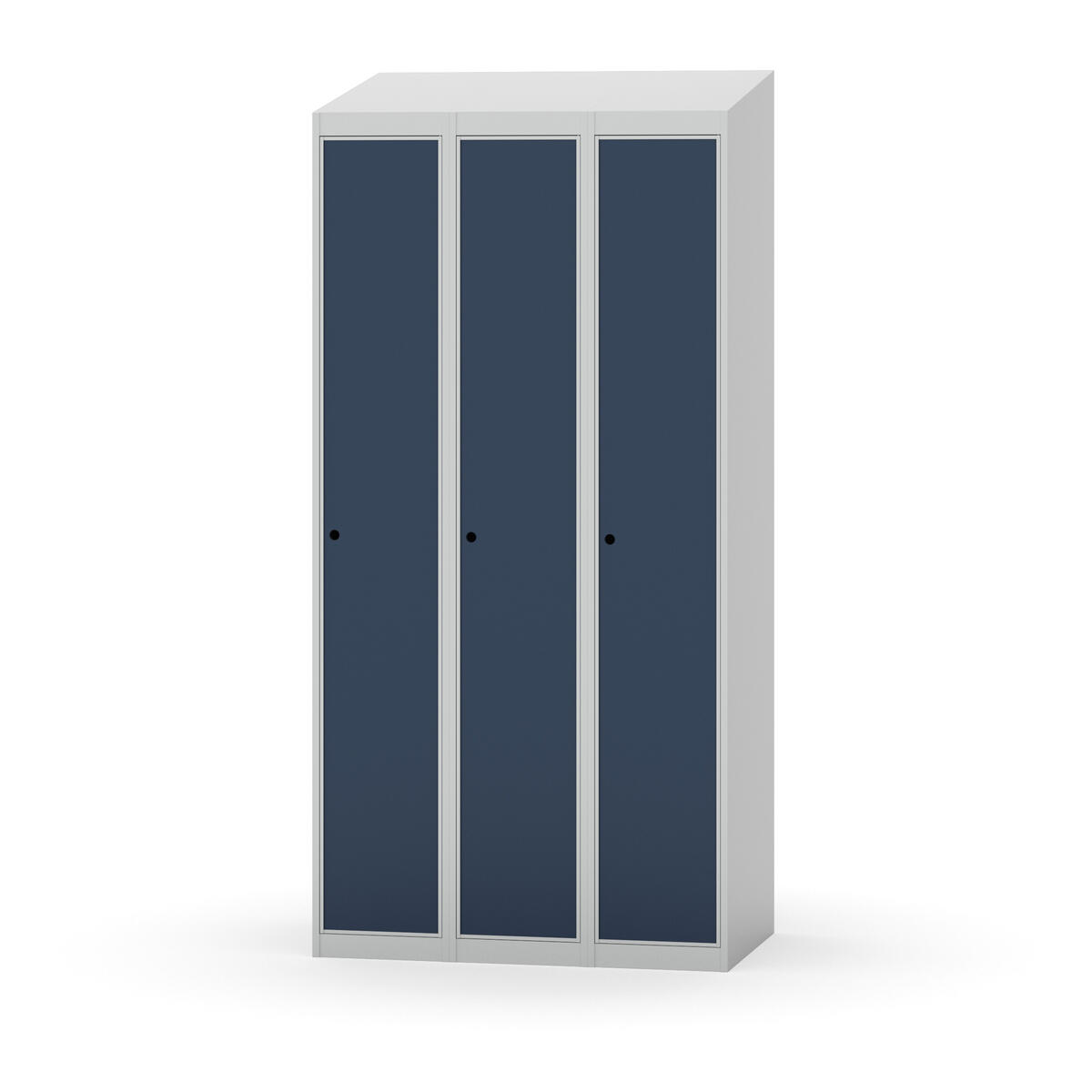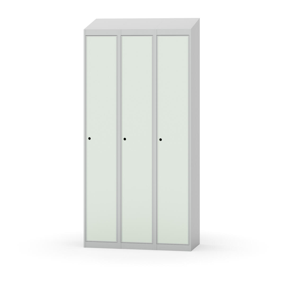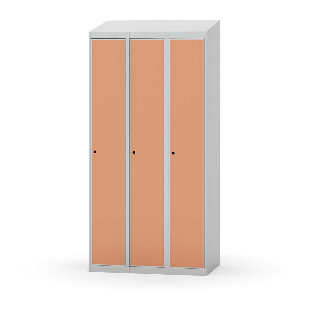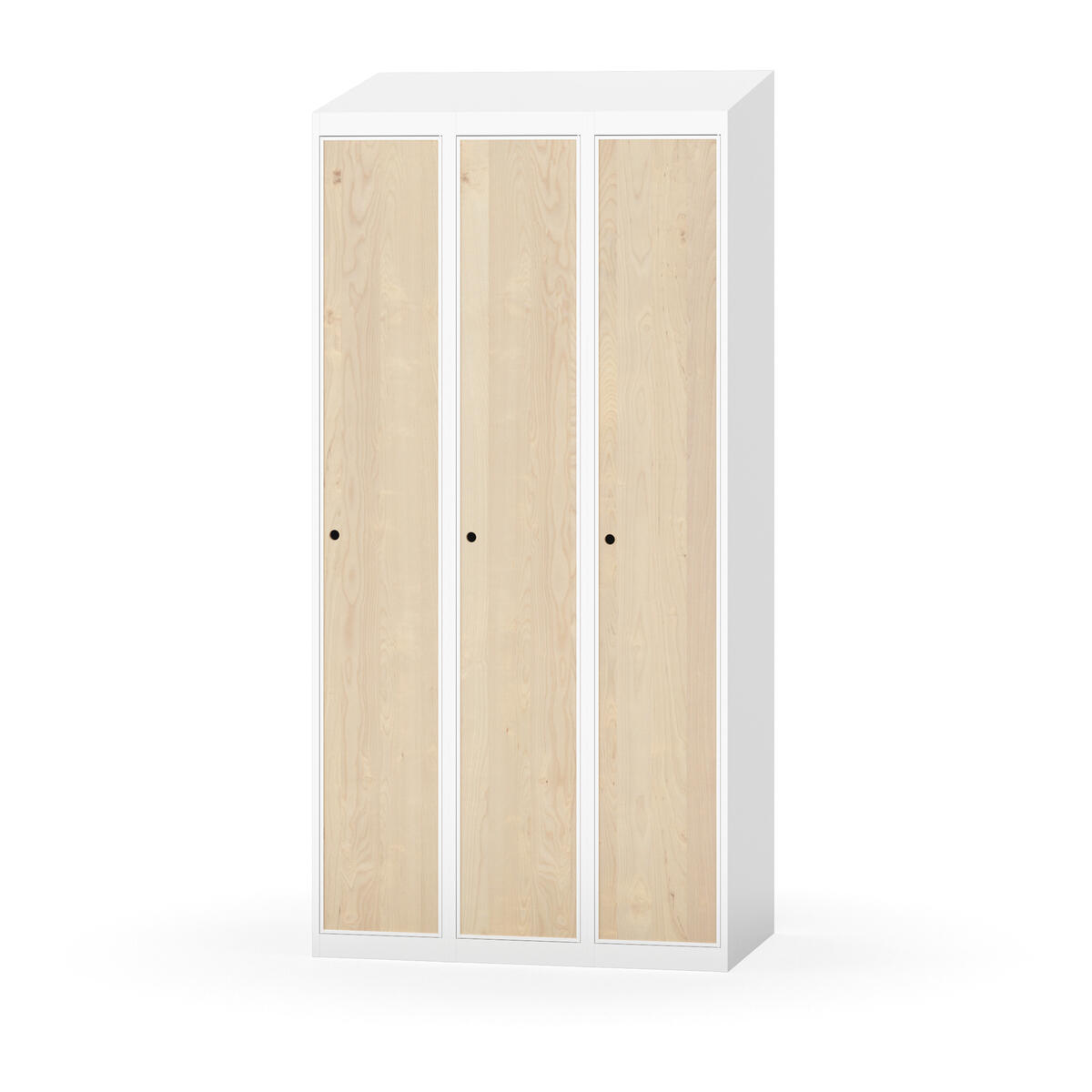 Garderobeskab med fuldsvejset stel. Vælg mellem låge i metal eller laminat. Metallågen er udstyret med dørstopper i stål og indvendig forstærkningsplade omkring låsehullet. Laminatlågen er indstøbt i en stålramme, som er udstyret med dørstopper i stål. Lågerne kan åbnes 90 grader. Indretning: Hylde og bøjlestang med to praktiske ankerkroge. Plan bund uden kant. Ventilation gennem huller i top-/bundplade. Bemærk, at lås samt sokkel/ben bestilles på separate varenumre. Leveres med færdigmonteret lås. Det valgte understel monteres ved levering.