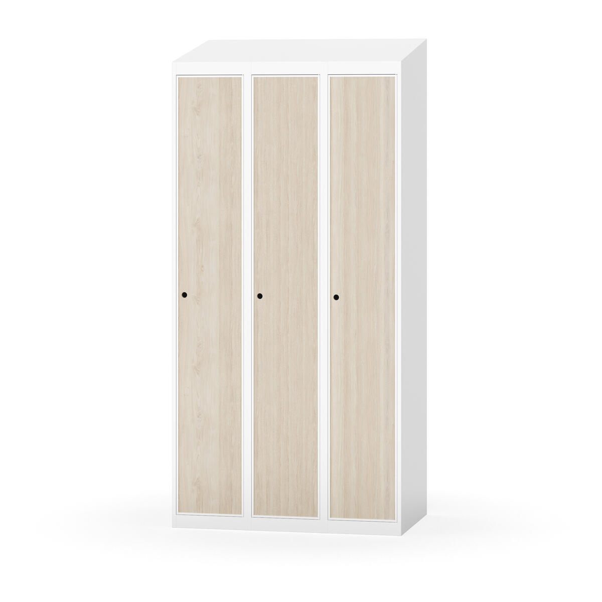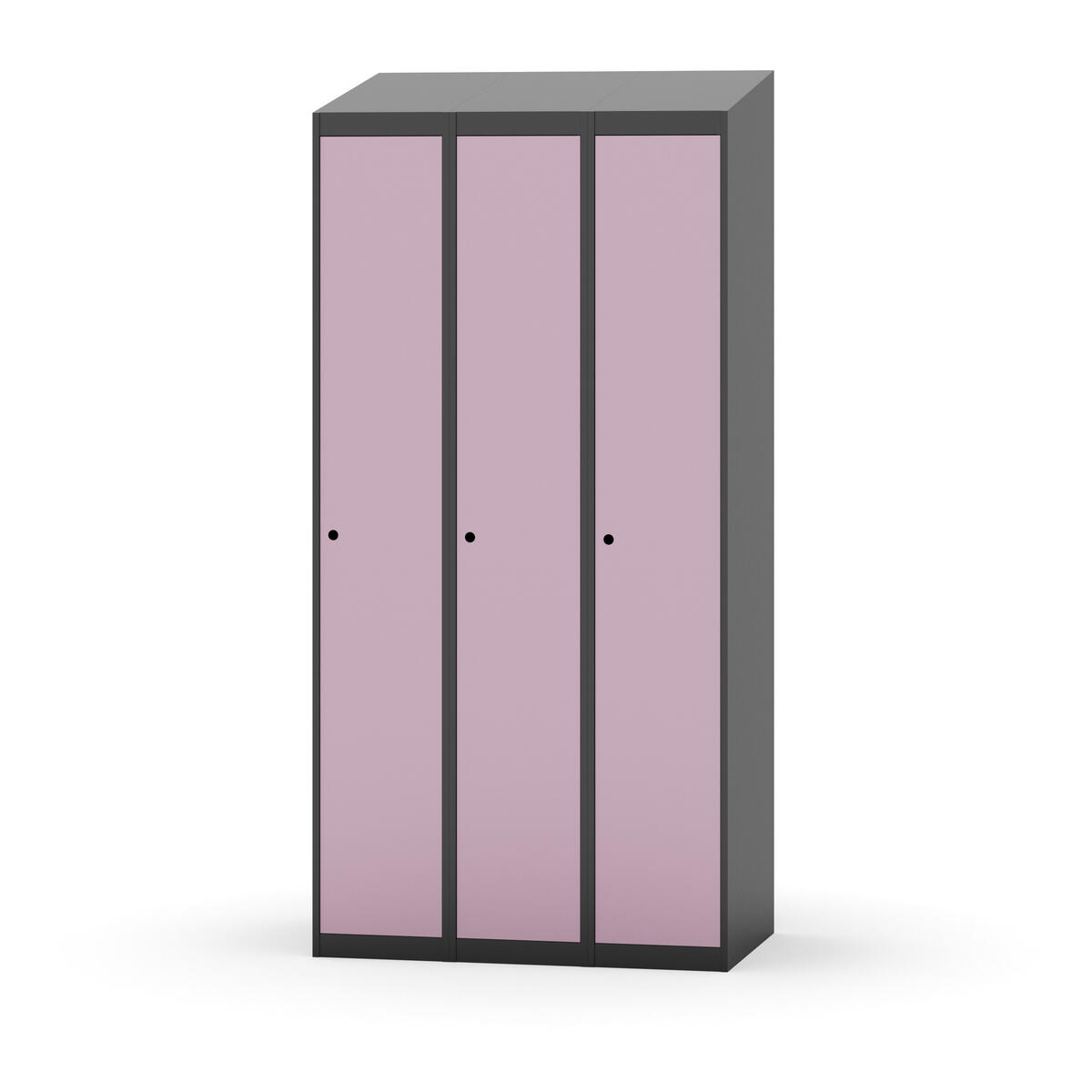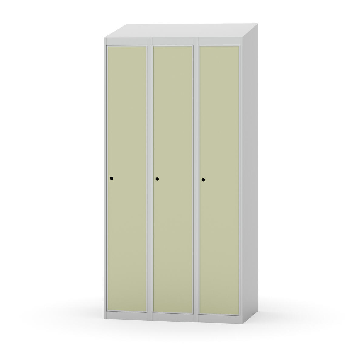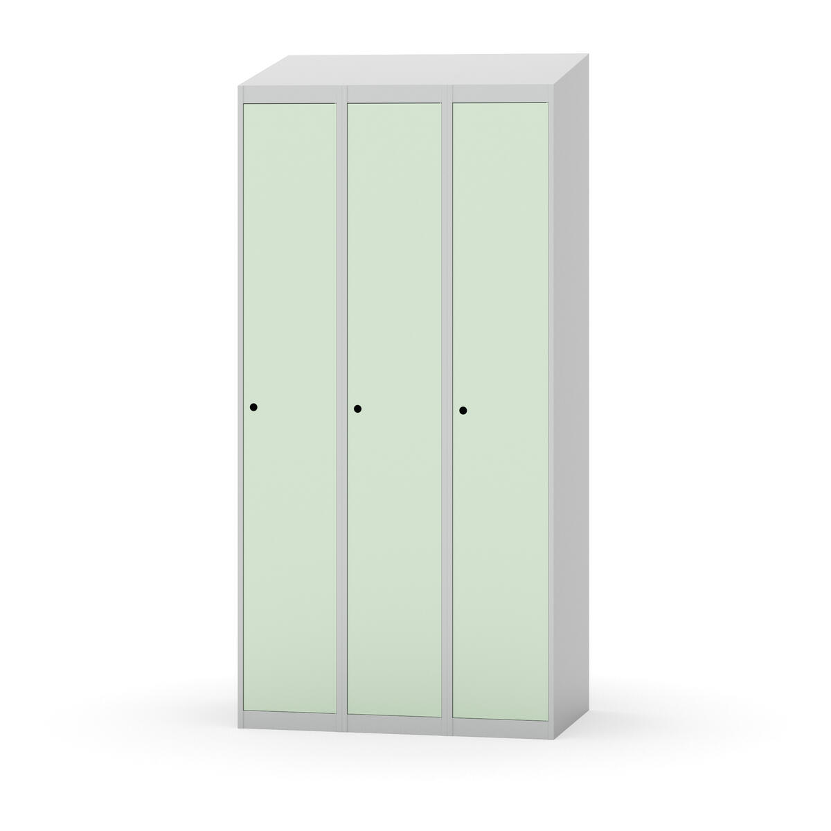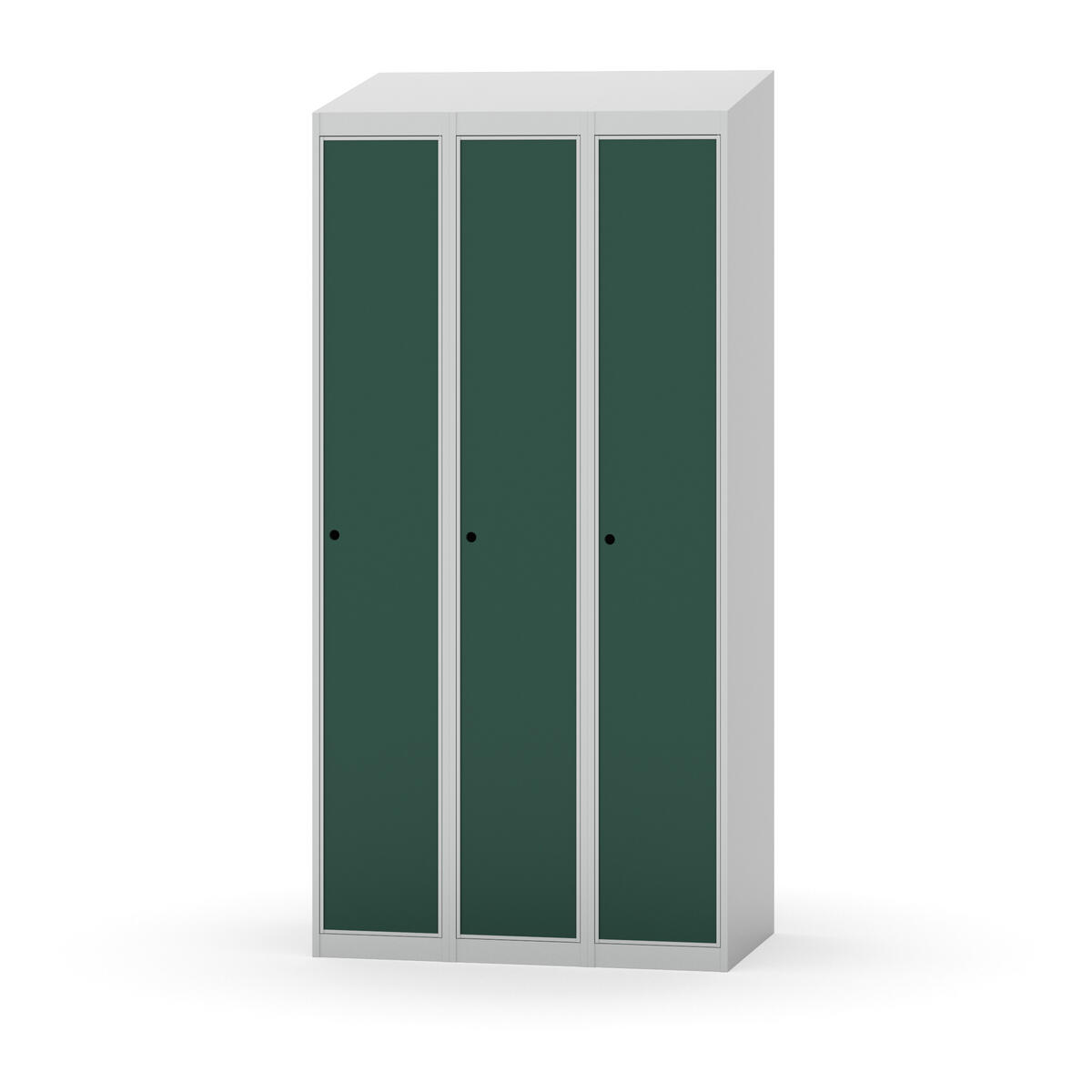 Garderobeskab med fuldsvejset stel. Vælg mellem låge i metal eller laminat. Metallågen er udstyret med dørstopper i stål og indvendig forstærkningsplade omkring låsehullet. Laminatlågen er indstøbt i en stålramme, som er udstyret med dørstopper i stål. Lågerne kan åbnes 90 grader. Indretning: Hylde og bøjlestang med to praktiske ankerkroge. Plan bund uden kant. Ventilation gennem huller i top-/bundplade. Bemærk, at lås samt sokkel/ben bestilles på separate varenumre. Leveres med færdigmonteret lås. Det valgte understel monteres ved levering.