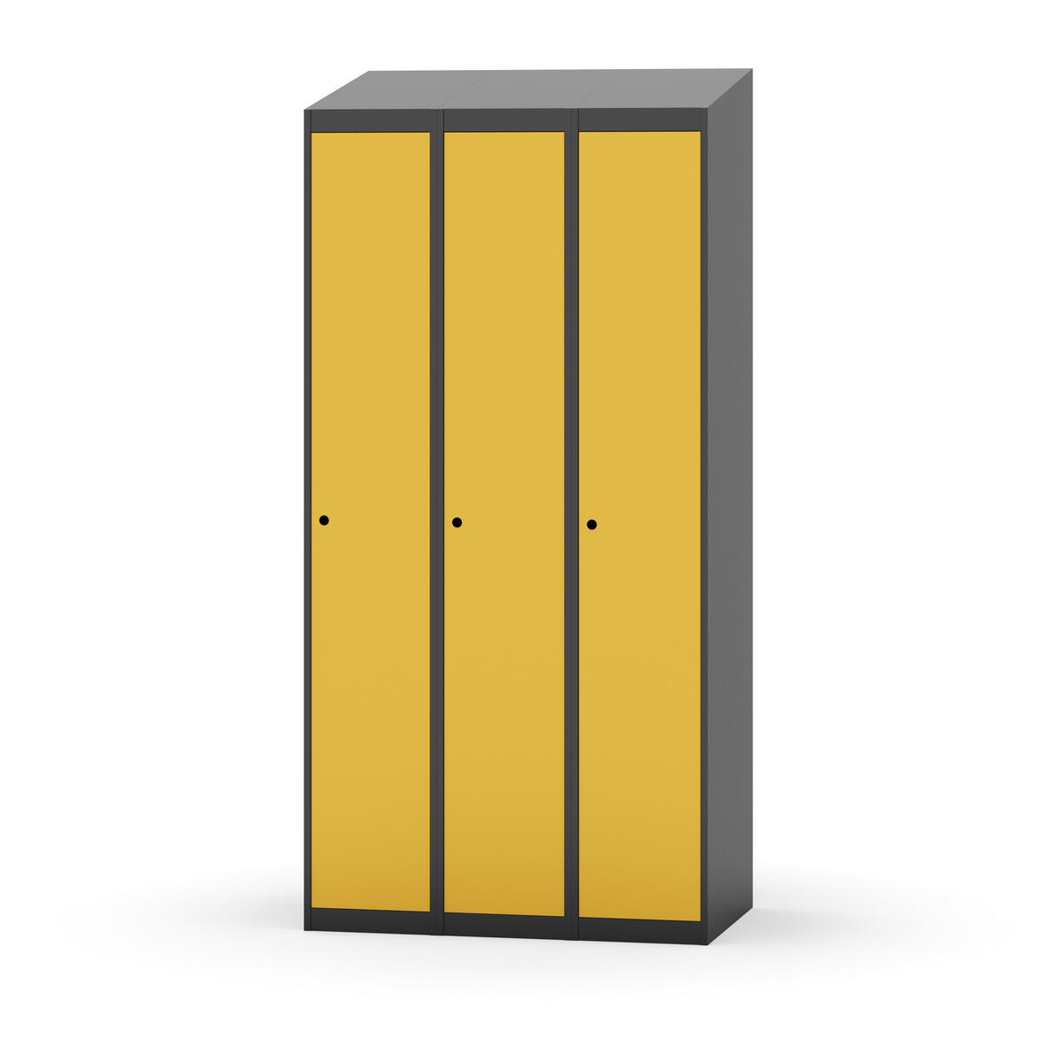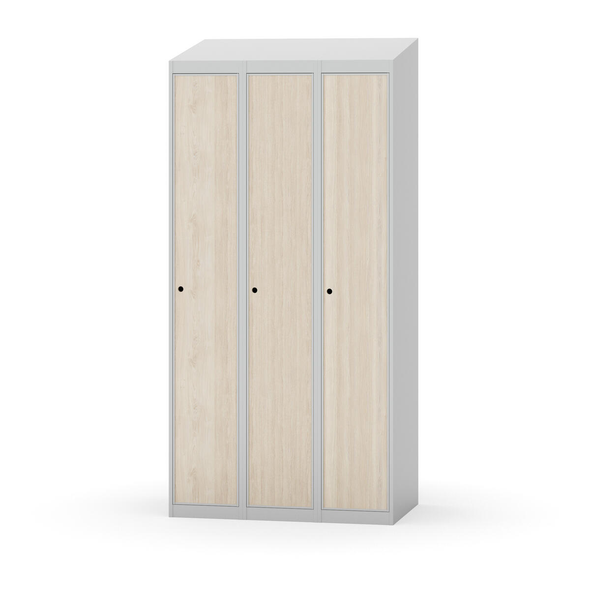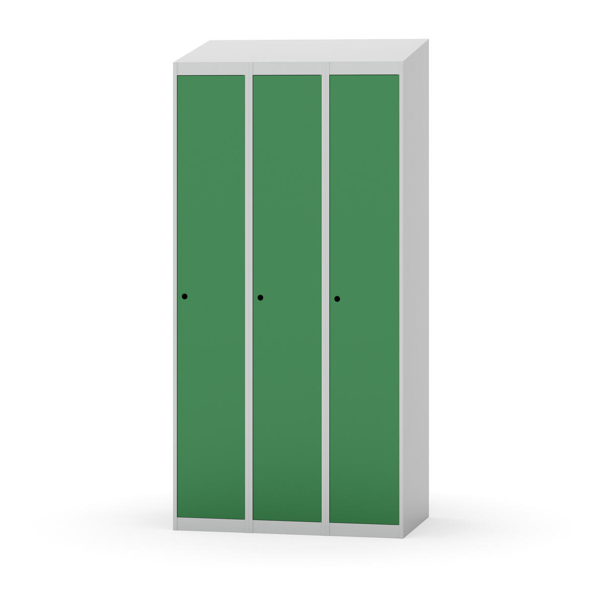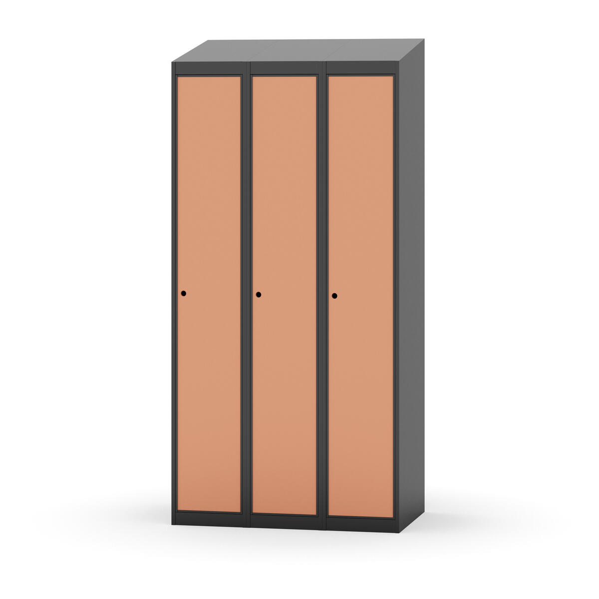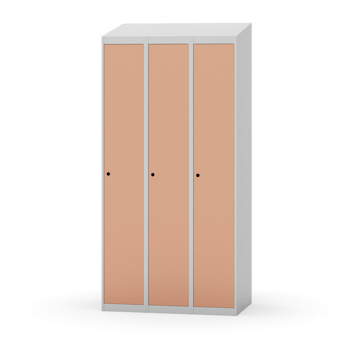 Garderobeskab med fuldsvejset stel. Vælg mellem låge i metal eller laminat. Metallågen er udstyret med dørstopper i stål og indvendig forstærkningsplade omkring låsehullet. Laminatlågen er indstøbt i en stålramme, som er udstyret med dørstopper i stål. Lågerne kan åbnes 90 grader. Indretning: Hylde og bøjlestang med to praktiske ankerkroge. Plan bund uden kant. Ventilation gennem huller i top-/bundplade. Bemærk, at lås samt sokkel/ben bestilles på separate varenumre. Leveres med færdigmonteret lås. Det valgte understel monteres ved levering.