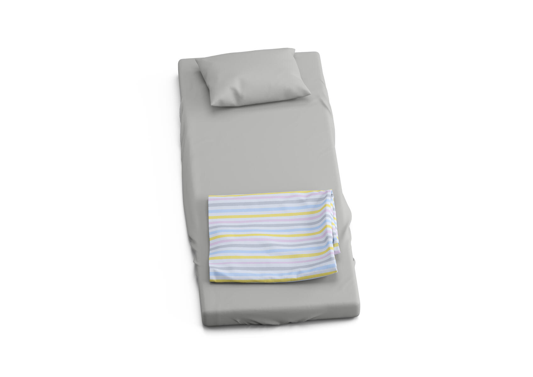 Indeholder 1 pudebetræk, 1 lagen, 1 stribet tæppe i jersey og 1 pude med polyesterfyld. Farvekoden beskriver lagen og pudebetræk. Må ikke tørretumbles. Madras købes separat.