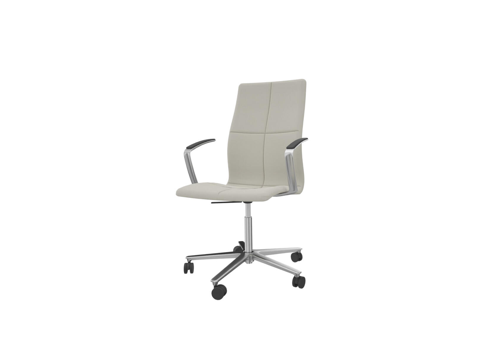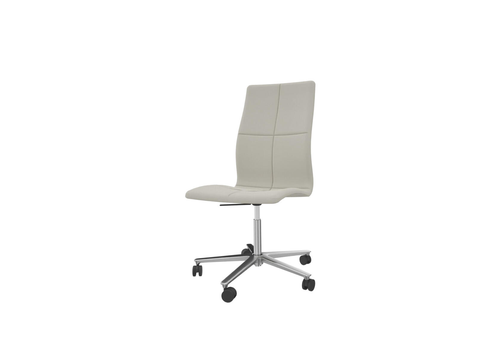 En tidløs, ergonomisk og komfortabel stol med høj ryg og pikeret syning i ryglænet, som giver et elegant og blødt udtryk. Sædet er lavet i formpresset finér med behagelig polstring i koldskum, der sikrer både komfort og støtte. Stolen har en tiltmekanisme med 7° hældning bagud og 4° fremad, som giver øget bevægelighed og bedre siddestilling. Den leveres med et poleret metalkryds og fem hårde hjul, der er velegnet til bløde gulve. Armstøtte fås som tilvalg.