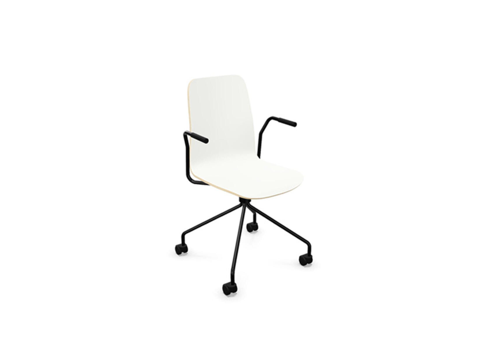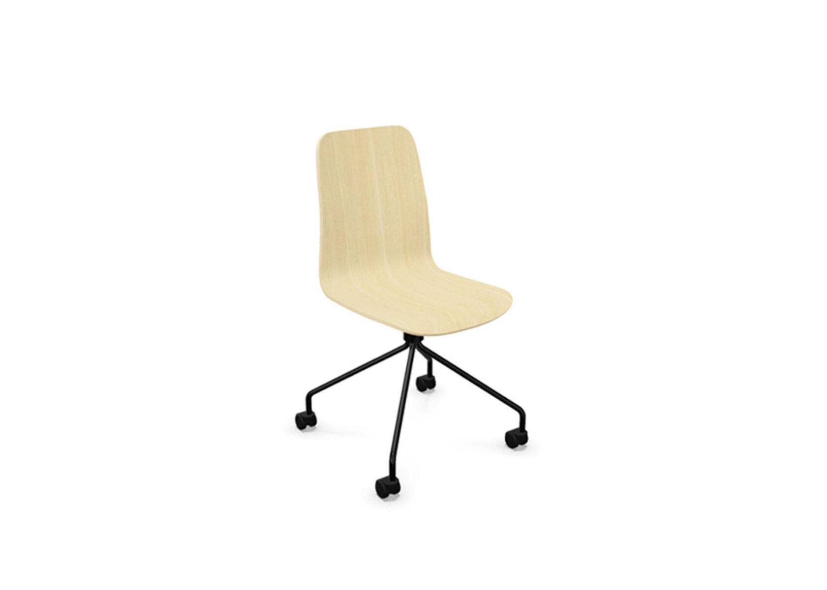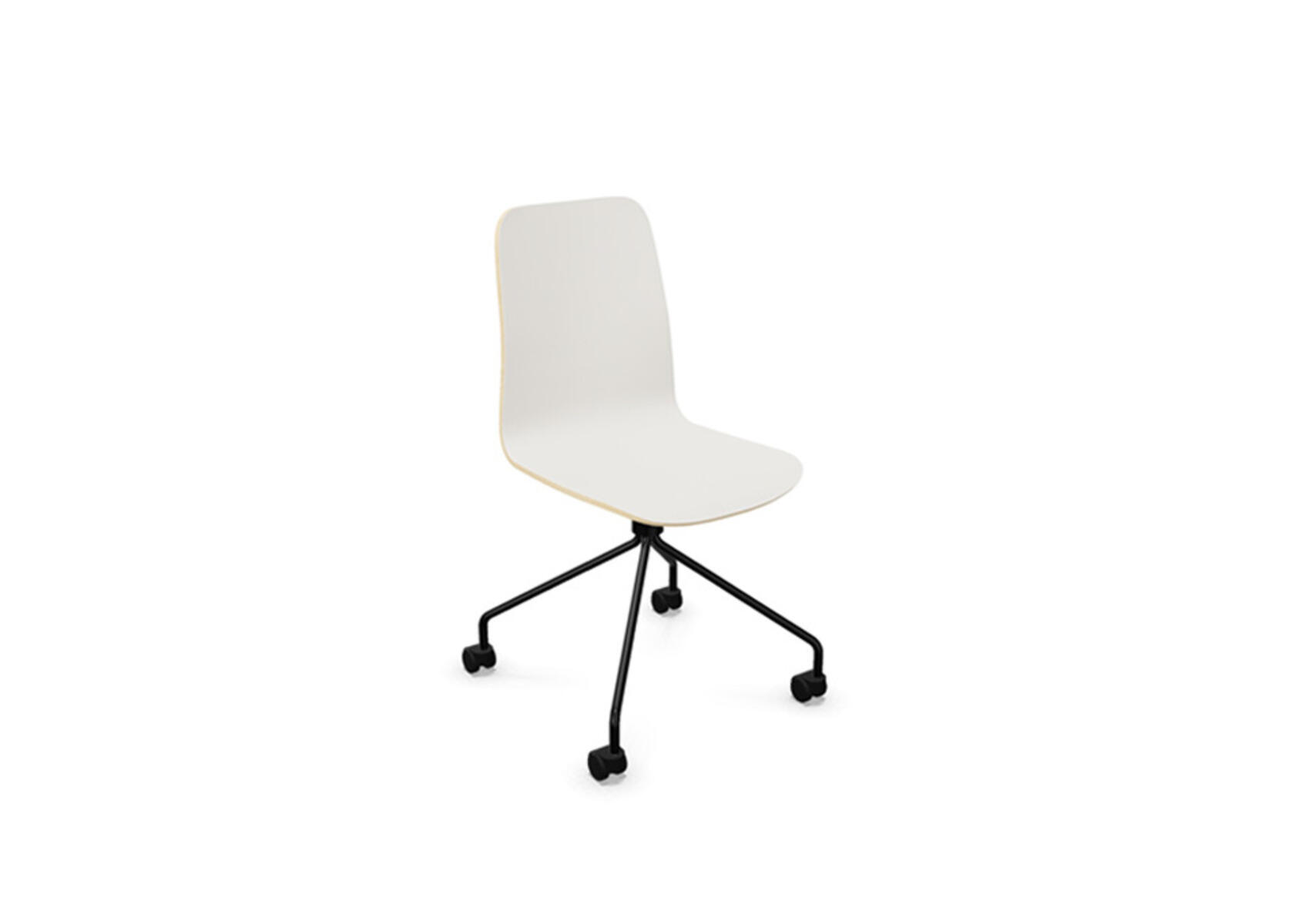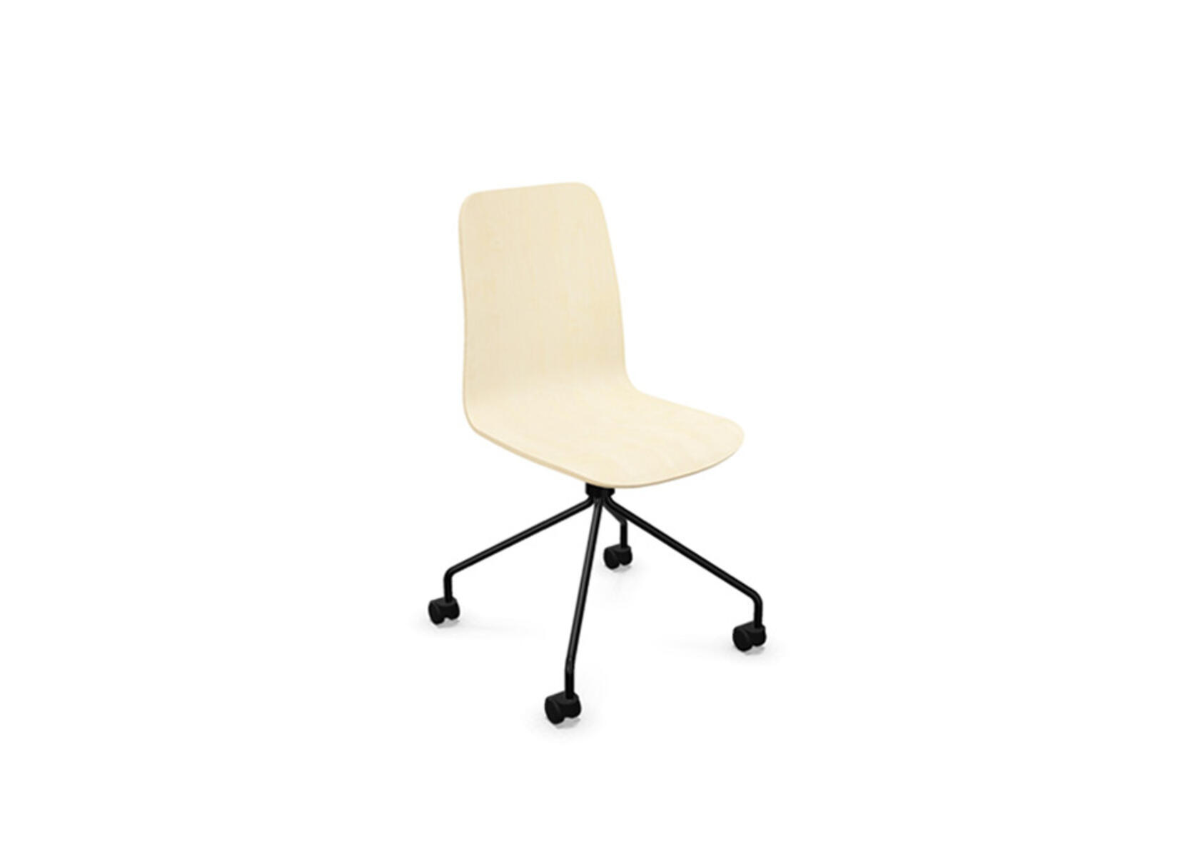 Sædeskål i formpresset krydsfinér belagt med højtrykslaminat. Stabilt pulverlakeret 4-kryds stel i Ø18 mm rør med hjul til hårde gulve. Stolen har drejefunktion, men er ikke højdejusterbar. Armlæn fås som tilbehør. Maks. belastning 110 kg.