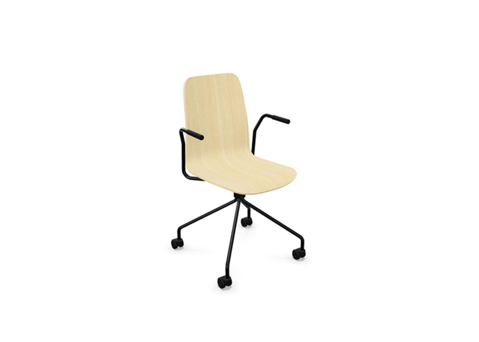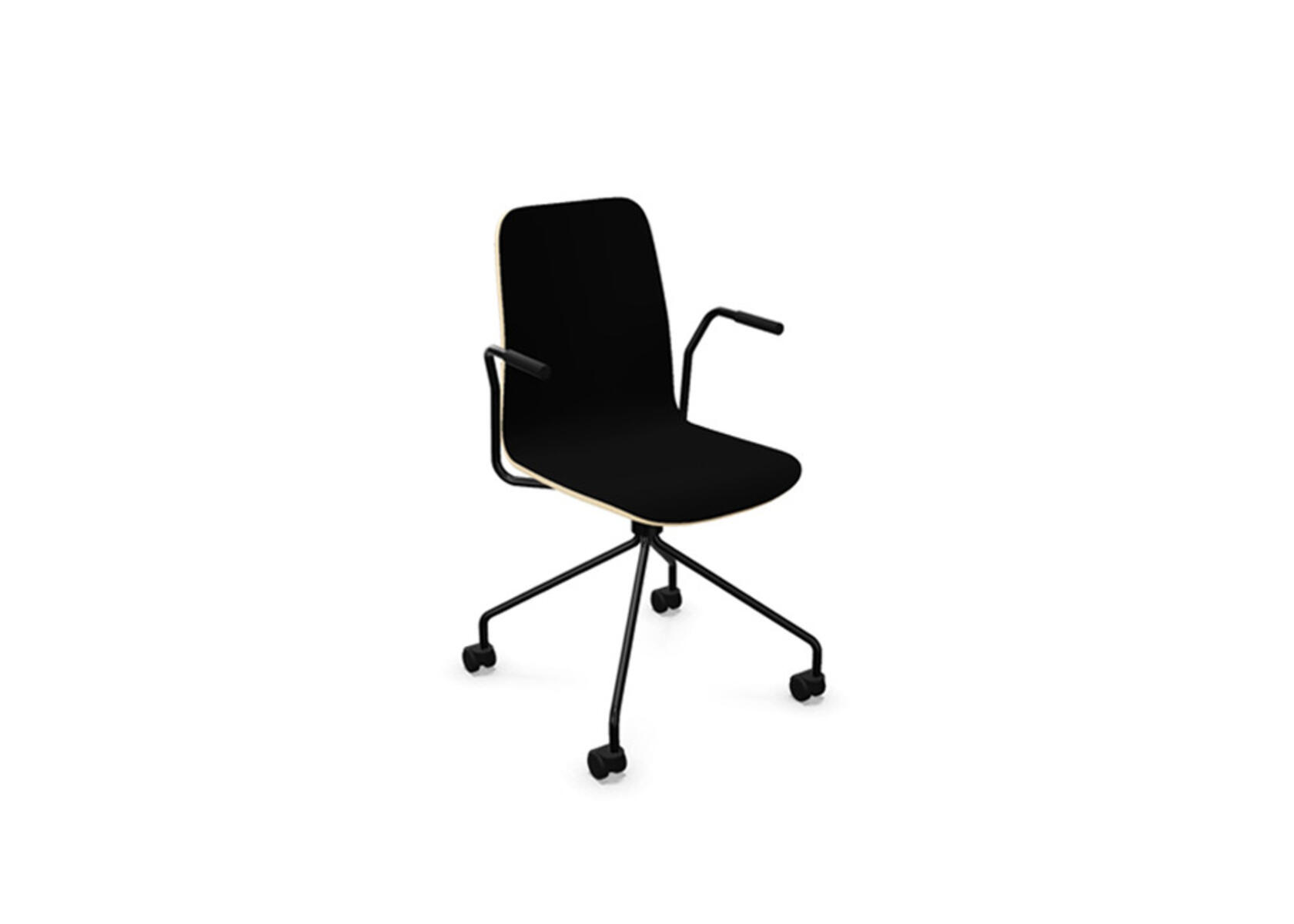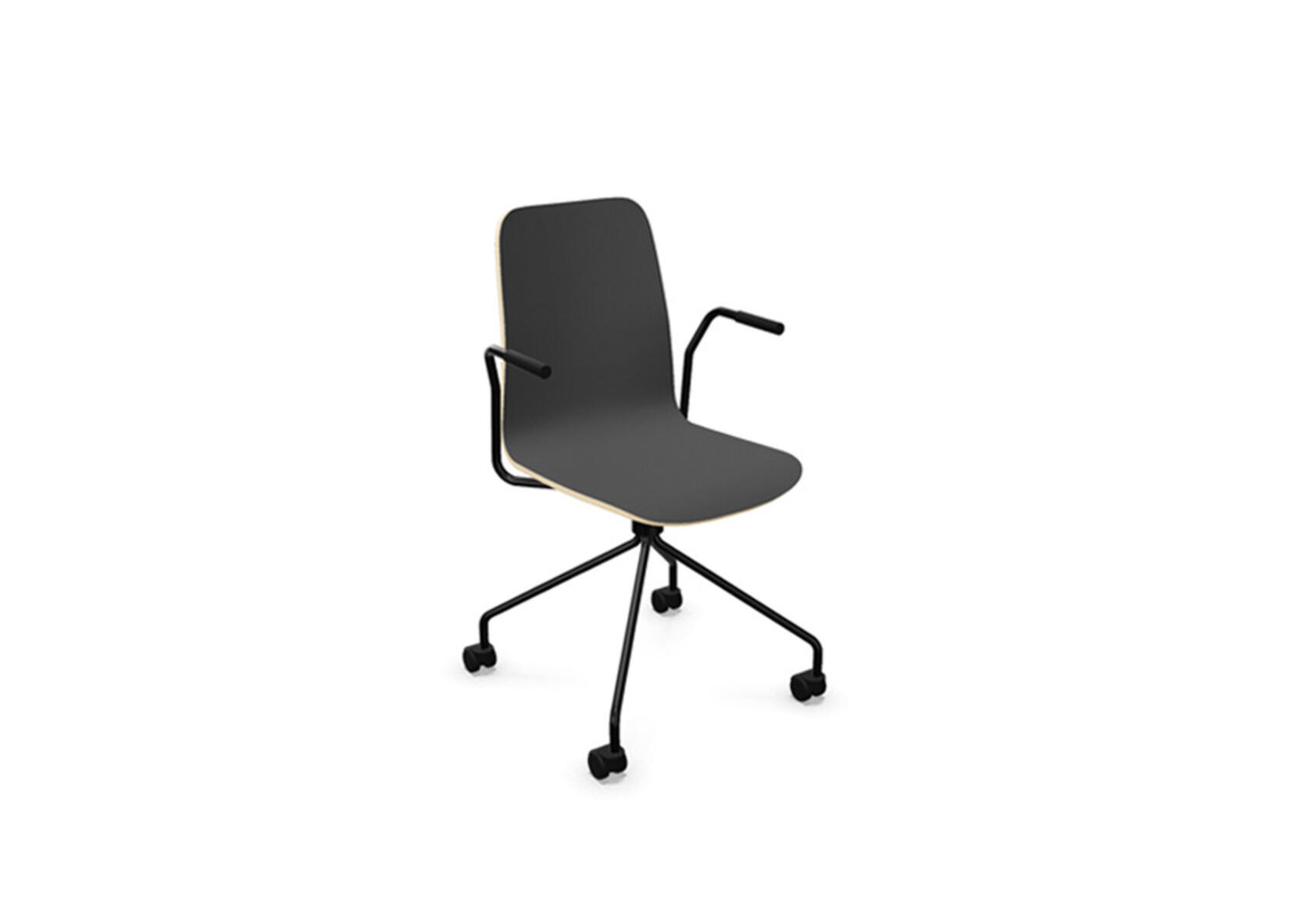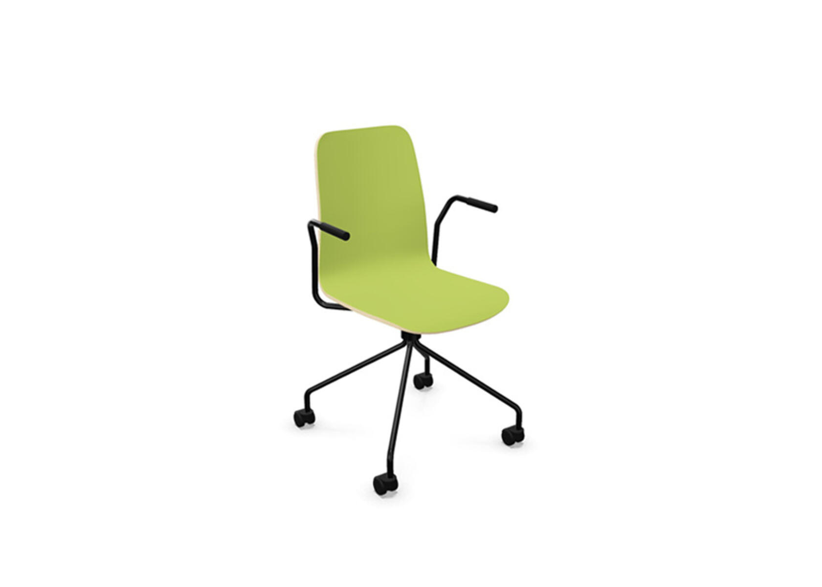 Sædeskål i formpresset krydsfinér belagt med højtrykslaminat. Stabilt pulverlakeret 4-kryds stel i Ø18 mm rør med hjul til hårde gulve. Stolen har drejefunktion, men er ikke højdejusterbar. Armlæn fås som tilbehør. Maks. belastning 110 kg.
