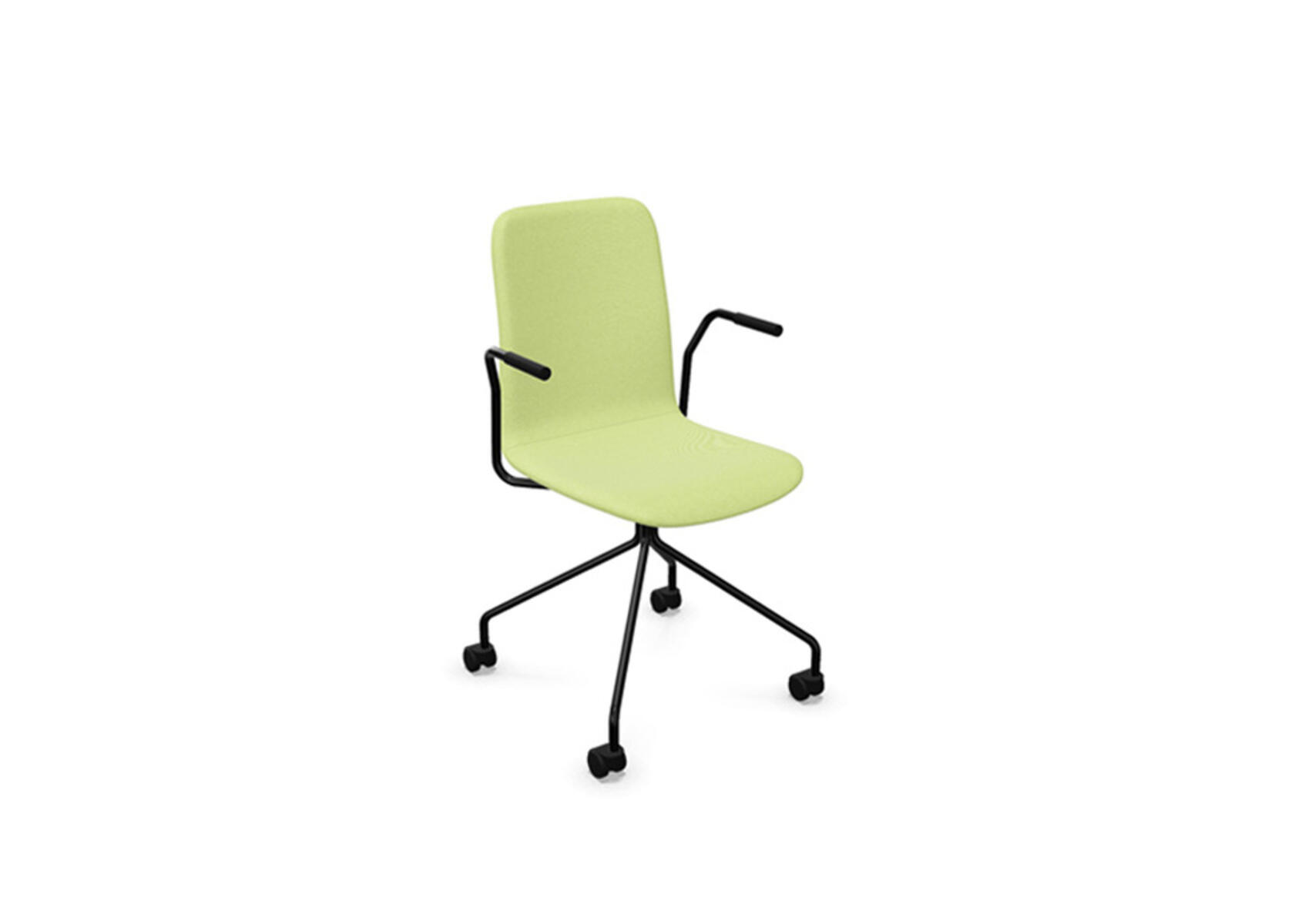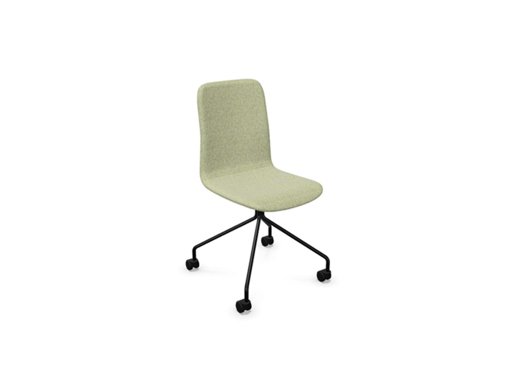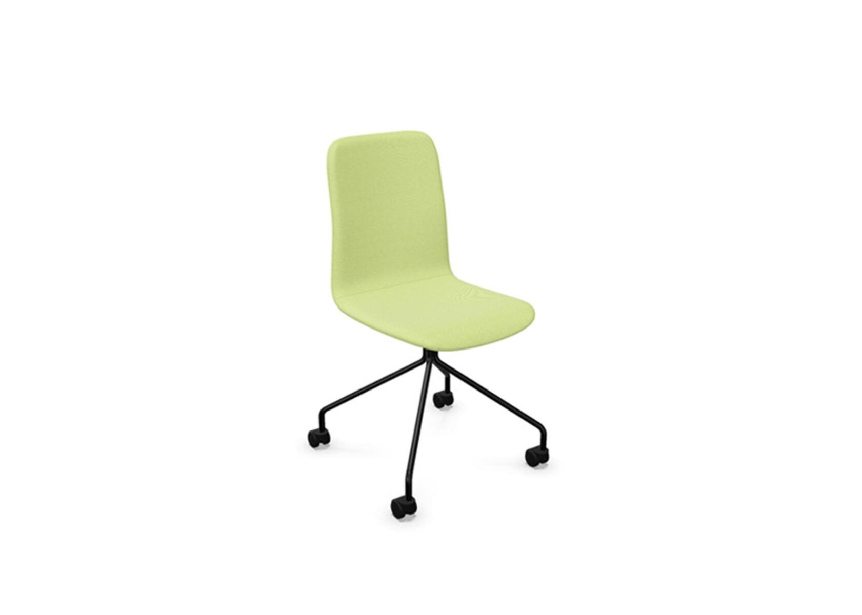 Sædeskål i formpresset krydsfinér belagt med højtrykslaminat. Stabilt pulverlakeret 4-kryds stel i Ø18 mm rør med hjul til hårde gulve. Stolen har drejefunktion, men er ikke højdejusterbar. Armlæn fås som tilbehør. Maks. belastning 110 kg.