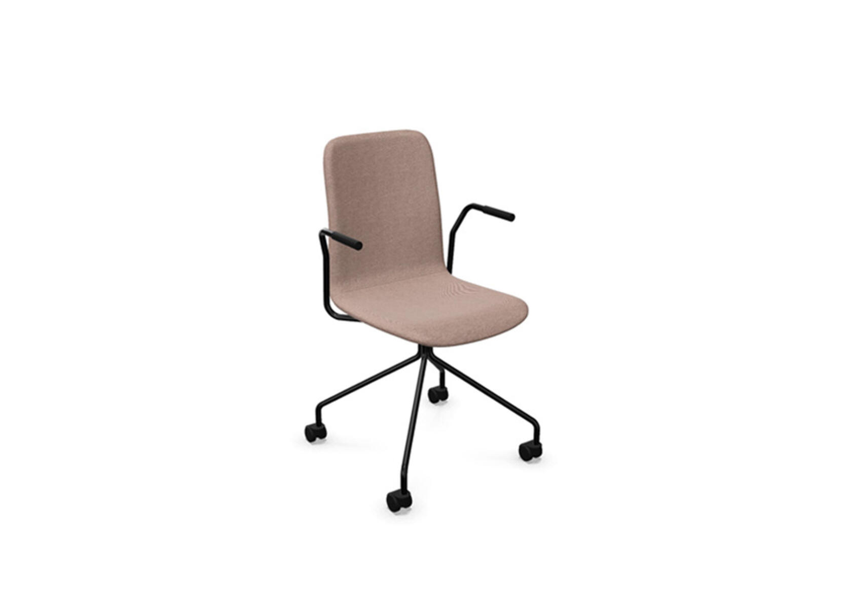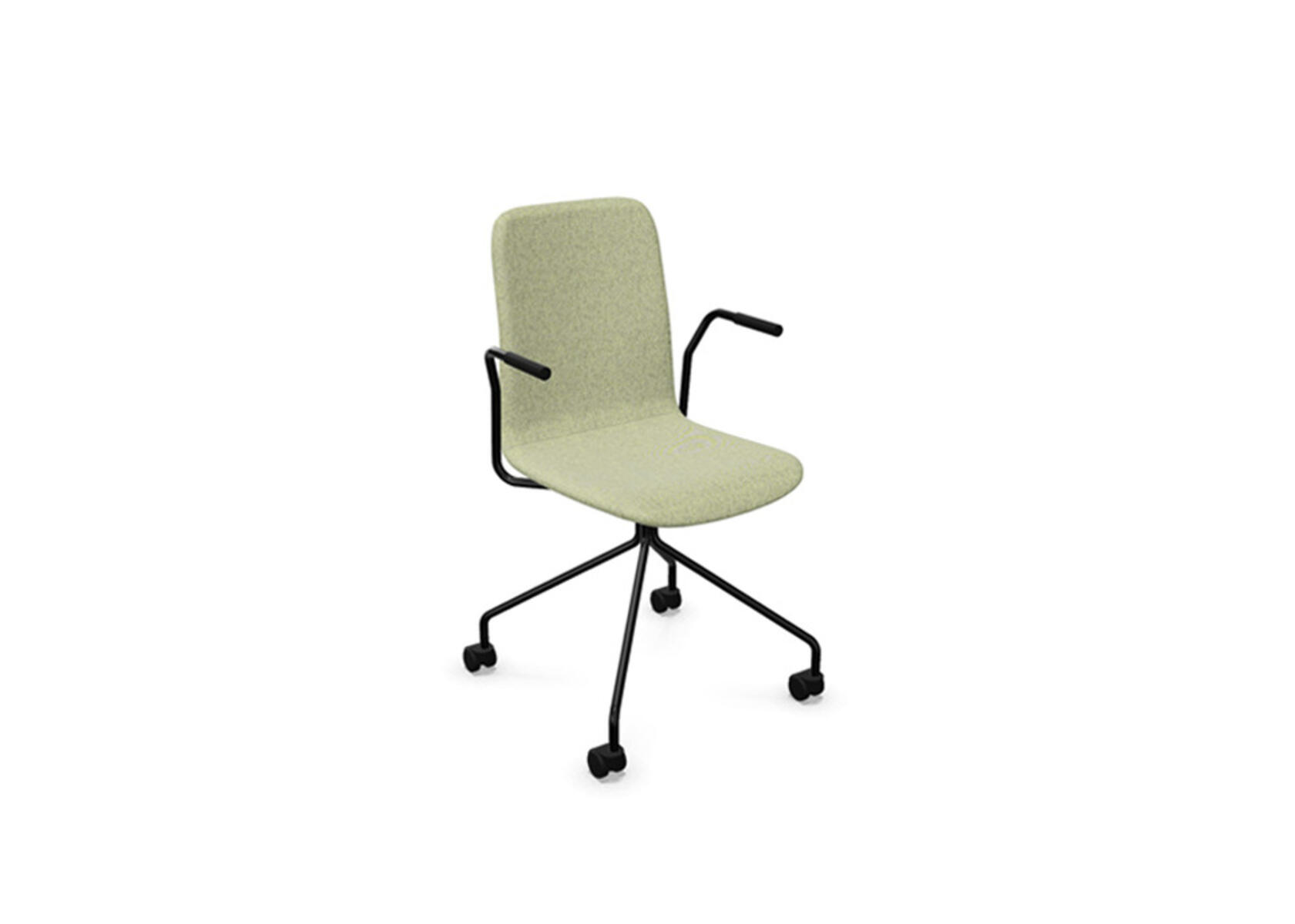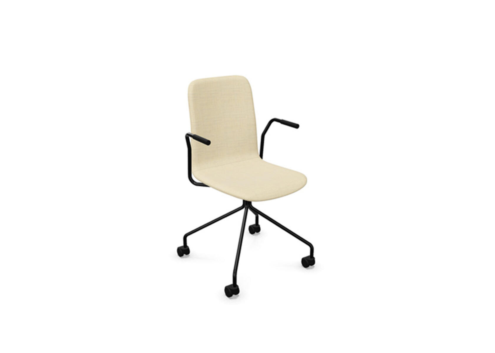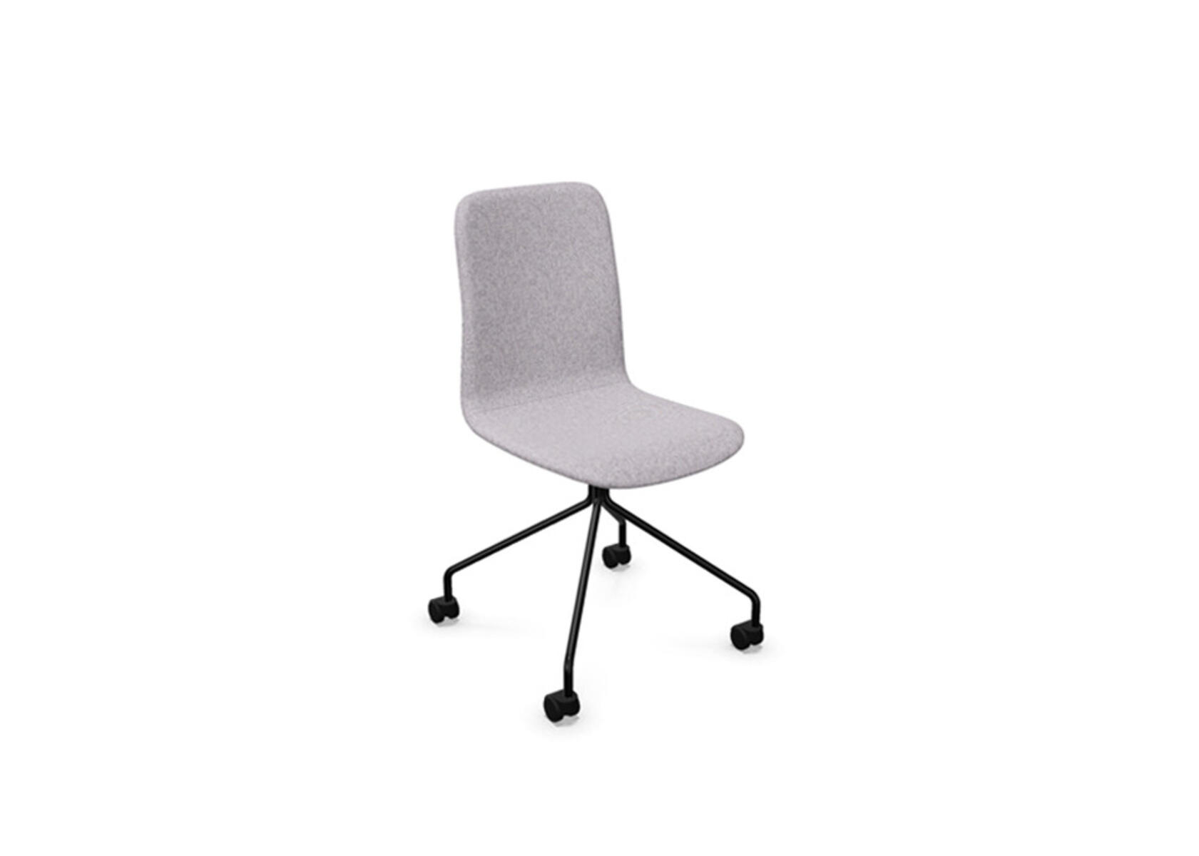 Sædeskål i formpresset krydsfinér polstret med koldskum, som giver både komfort og støtte. Stabilt pulverlakeret 4-kryds stel i Ø18 mm rør med hjul til hårde gulve. Armlæn fås som tilbehør. Maks. belastning 110 kg. Stolen er hverken højdejusterbar eller roterbar.