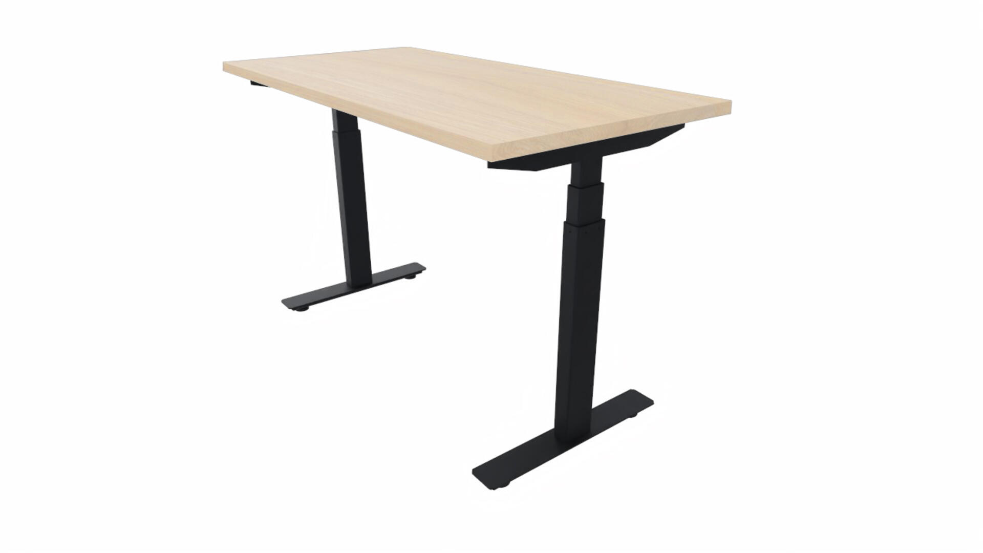 Bordplade i decor laminat med ABS-kant. Med sin brede justeringsinterval (615 - 1275 mm ±5 mm ekskl. bordplade) kan skrivebordet nemt tilpasses i højden. Anti-kollisionsfunktionen registrerer forhindringer, når skrivebordet sænkes eller hæves, og reagerer hurtigt ved at stoppe stellet. Stellet er udstyret med justerbare fødder til ujævne overflader. Mål på fod: L49xB6 cm.