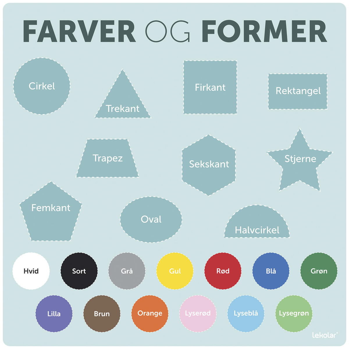 Lær børnenen om farver og former. Ved at koble navnene på både farve og form, er det lettere at huske fx farven og hvordan den staves. Det visuelle element er ofte med til, at hjernen har lettere ved at huske formen og farvens navn. Læringsfolien illustrerer 13 farver og 10 former.