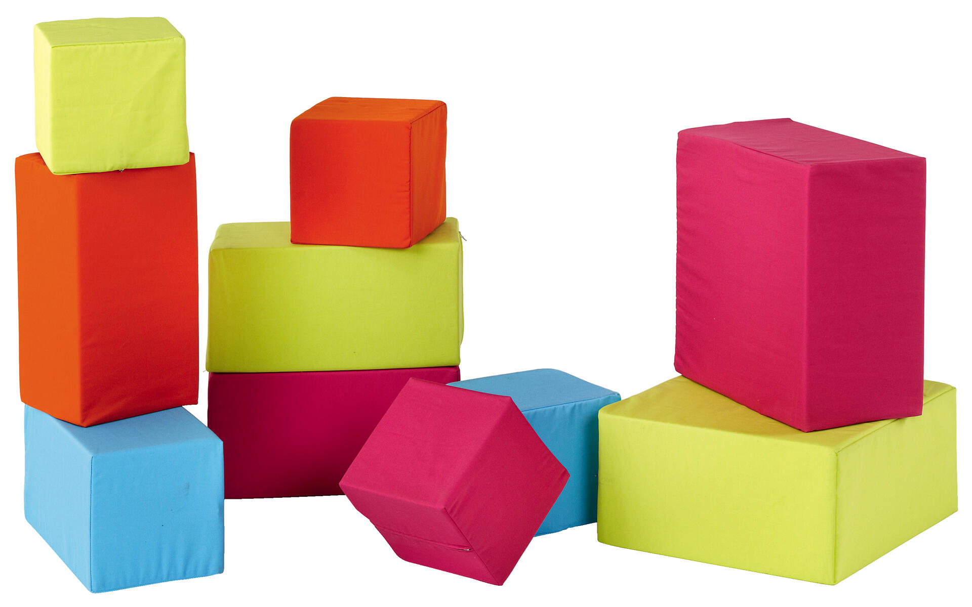 Sæt med 10 byggeklodser helt uden PVC og med koldskumskerne. Indeholder: 4 stk. 20x20x20 cm, 2 stk. 40x20x20 cm, 2 stk. 40x20x20 cm, 1 stk. 40x40x20 cm og 1 stk. 40x40x20 cm. Betræk bestående af 49 % polyuretan og 51 % polyesterstof. Vandtæt. Aftageligt betræk, som tåler maskinvask op til 60 °C. Betrækket kan ikke afsprittes. Vandtæt. Oeko-Tex- og Svanemærket, licensnummer 3031 0084.