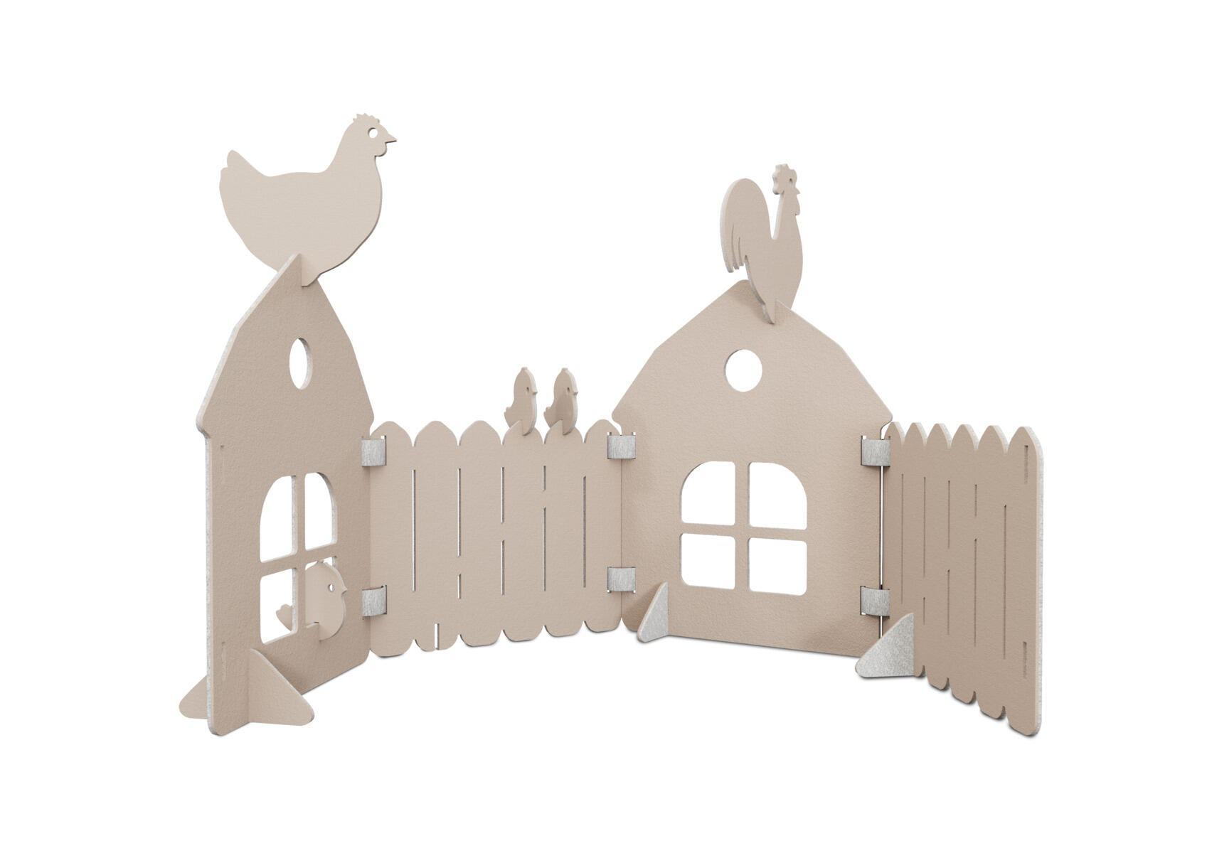 Legeskærme i lyddæmpende filt. Anvendes til scenografi, som rumdeler eller som et forstærkende element i legen. Alle dele i Saga-serien kan bruges sammen. En bondegårdskombination med 4 skærme, 4 fødder og 6 hængsler. Hertil hører også en hane, en høne og tre høns, som kan monteres på legeskærmene. Skærmene er tofarvede, den ene side er altid lysegrå. Fødder følger samme farvekombination som farvevalg. Hængsler er lysegrå. Mål på skærme: B58xH70 cm. Mindst 50 % genbrugsmateriale. 100% genanvendelig.