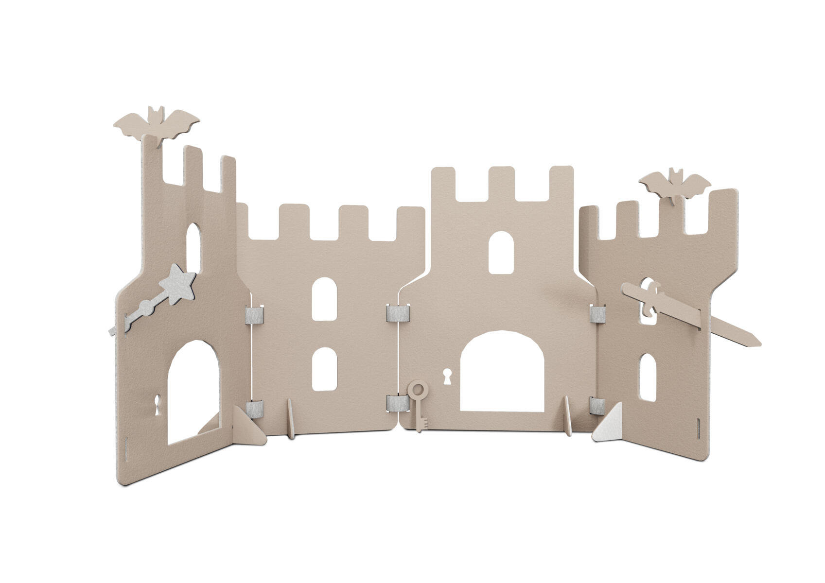 Legeskærme i lyddæmpende filt. Anvendes til scenografi, som rumdeler eller som et forstærkende element i legen. Alle dele i Saga-serien kan bruges sammen. En kombination af en fæstning med 4 skærme, 4 fødder og 6 hængsler. Der medfølger også to flagermus, et sværd, en tryllestav og en nøgle, som kan monteres på legeskærmene. Skærmene er tofarvede, den ene side er altid lysegrå. Fødder følger samme farvekombination som farvevalg. Hængsler er lysegrå. Mål på skærme: B58xH70 cm. Mindst 50 % genbrugsmateriale. 100% genanvendelig.