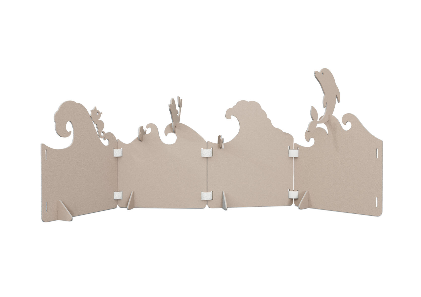 Legeskærme i lyddæmpende filt. Anvendes til scenografi, som rumdeler eller som et forstærkende element i legen. Alle dele i Saga-serien kan bruges sammen. En kombination af havet med 4 skærme, 4 fødder og 6 hængsler. Hertil hører også en søhest, to fisk og to delfiner, som kan monteres på legeskærmene. Skærmene er tofarvede, den ene side er altid lysegrå. Fødder følger samme farvekombination som farvevalg. Hængsler er lysegrå. Mål på skærme: B58xH70 cm. Mindst 50 % genbrugsmateriale. 100% genanvendelig.