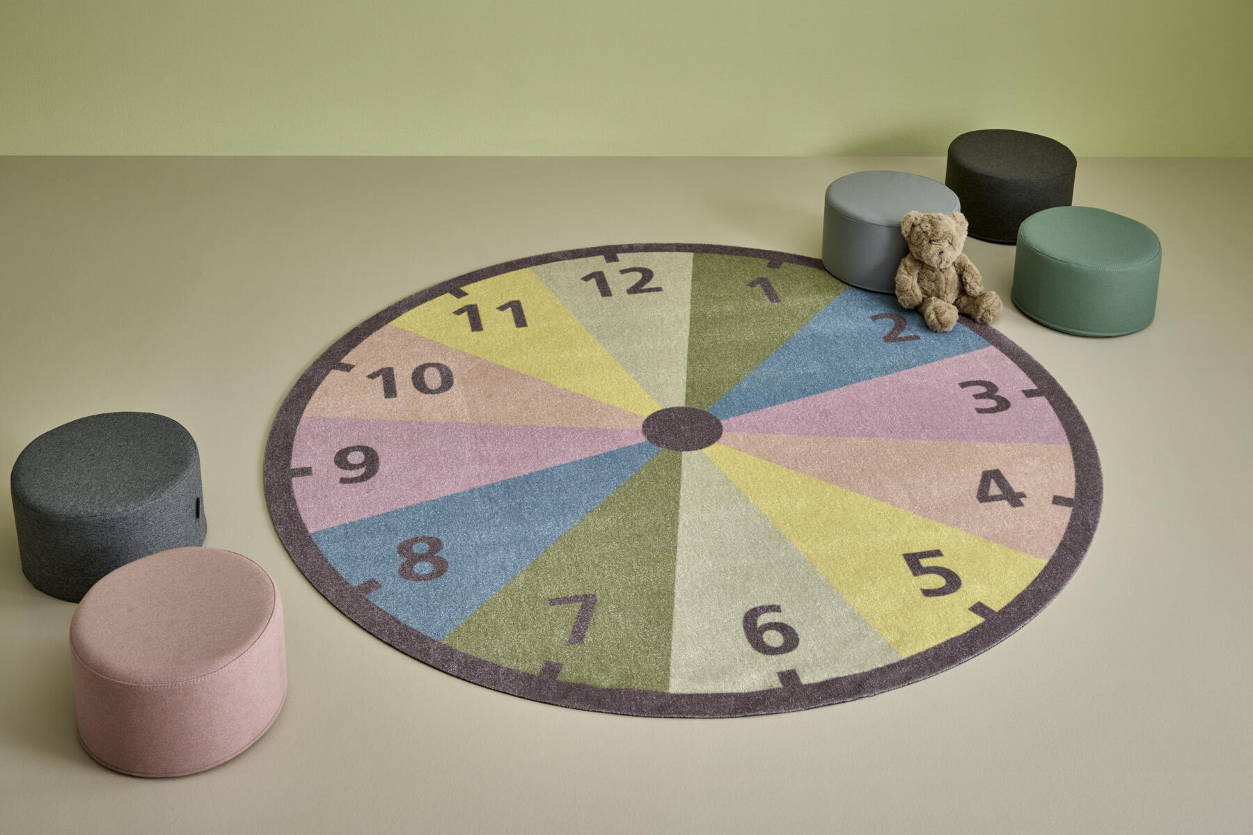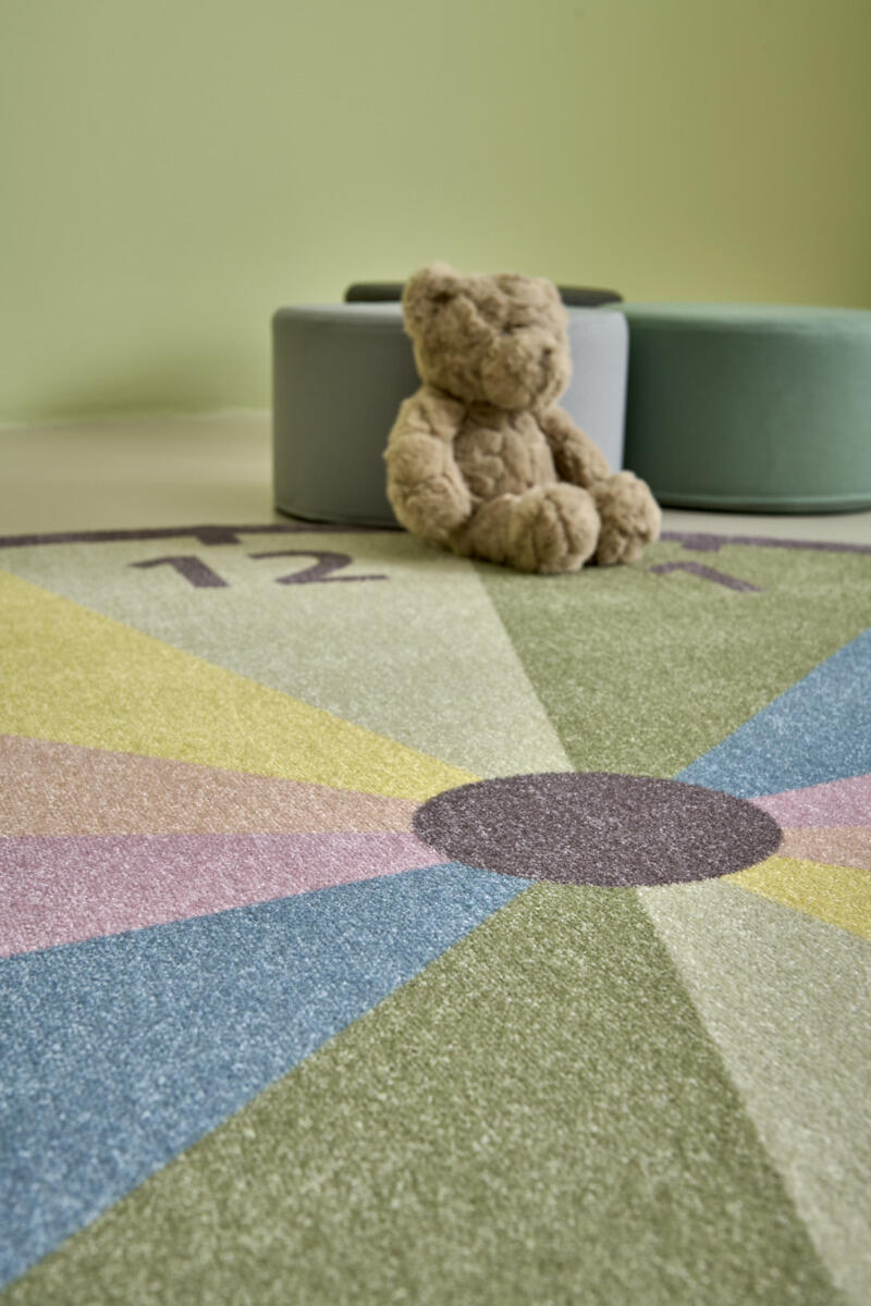 Måtte med digitalt tryk i form af et ur. Friséstruktur. 100 % polyamid. Luvhøjde 6 mm, luvvægt 1300 g/m². Bagside med skridsikker gummibelægning, PVC-fri og ftalatfri. Kan bruges på tørre gulve med gulvvarme.