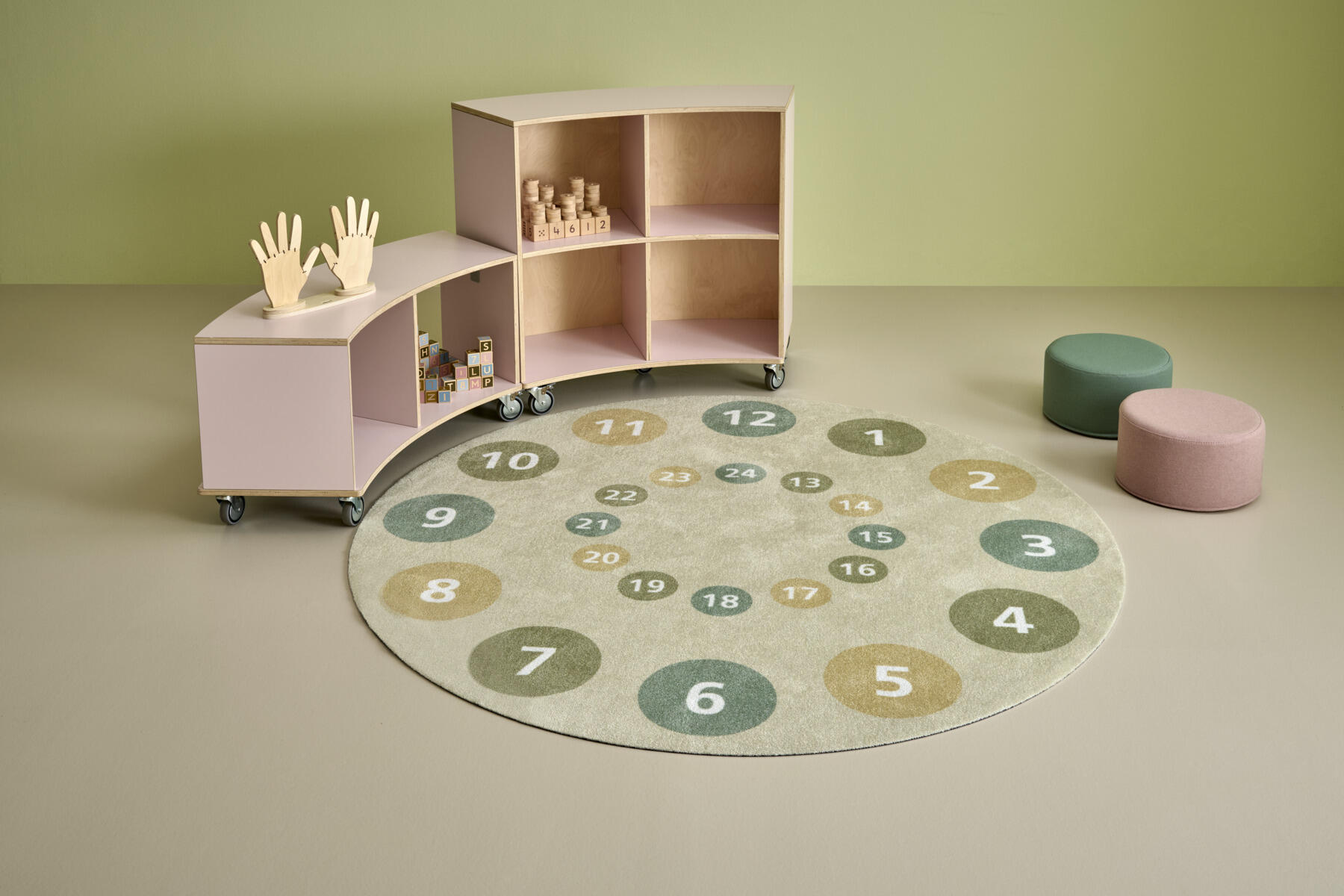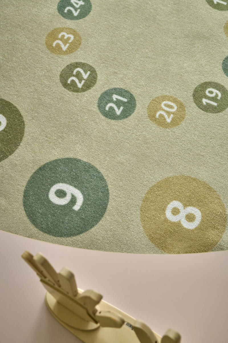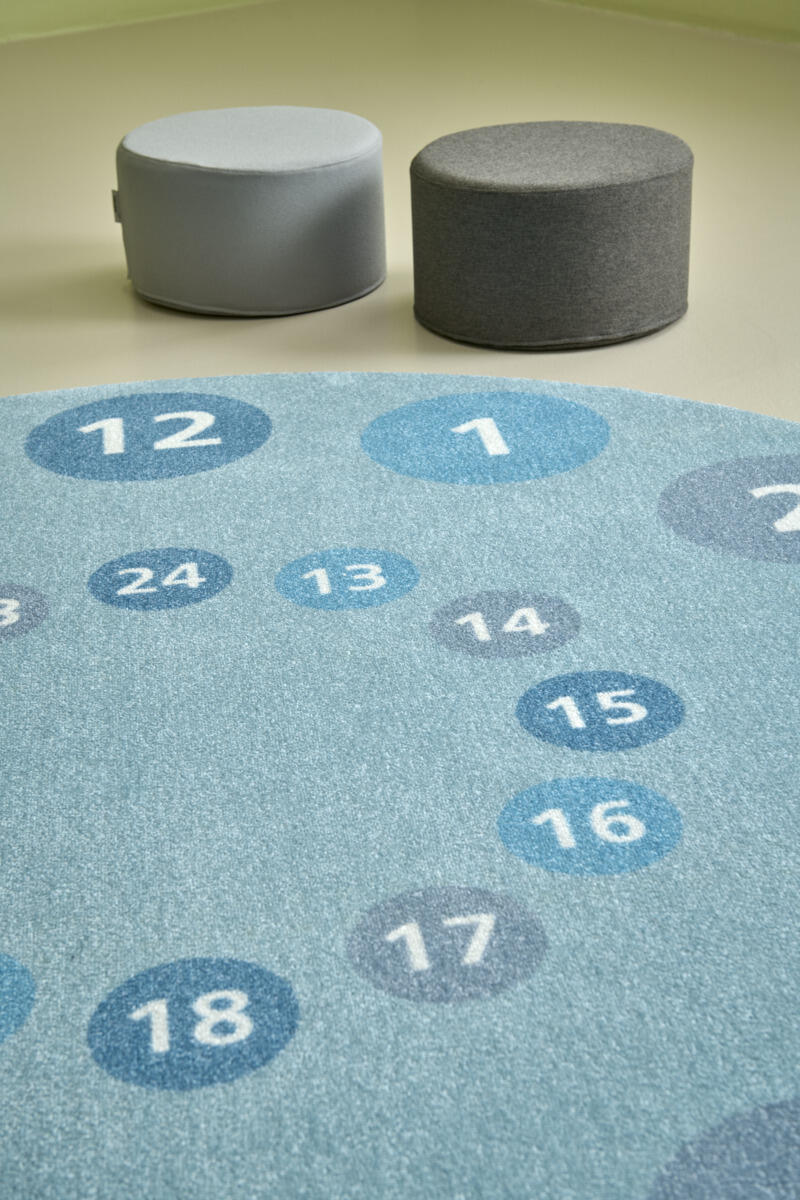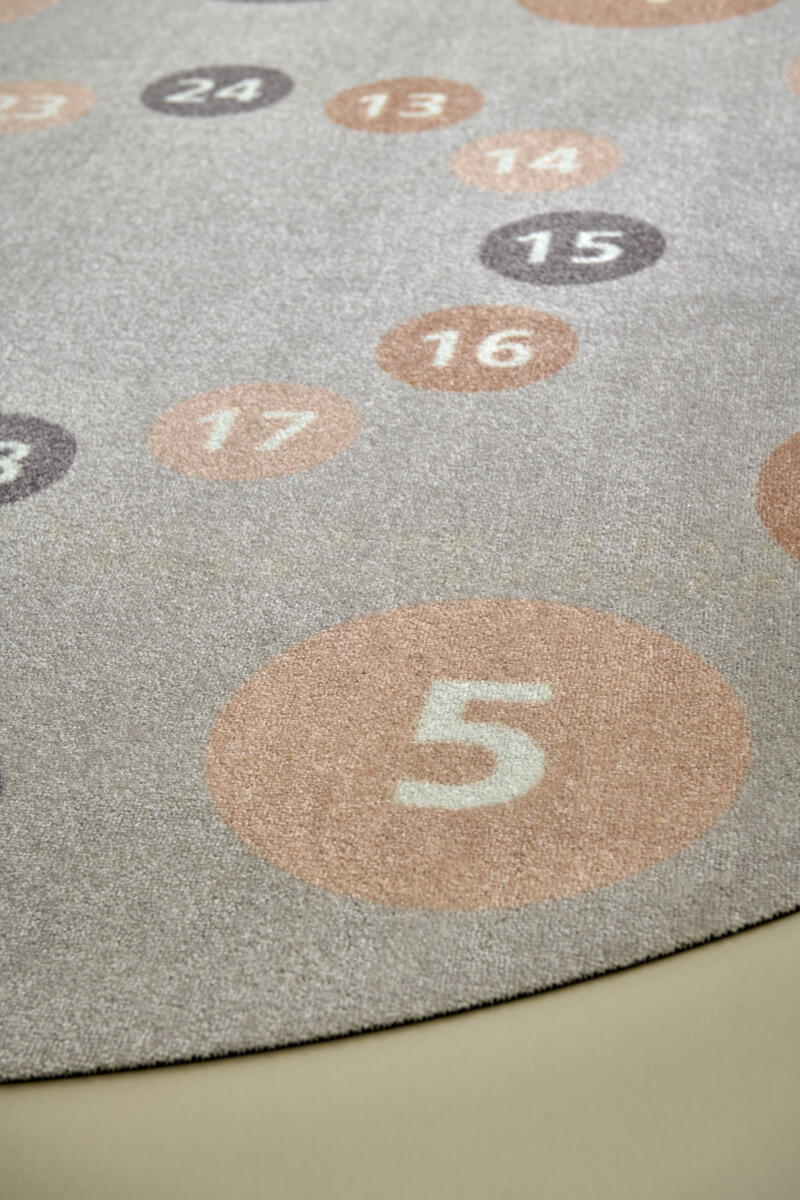 Måtte med digitalt tryk i form af et ur. Friséstruktur. 100 % polyamid. Luvhøjde 6 mm, luvvægt 1300 g/m². Bagside med skridsikker gummibelægning, PVC-fri og ftalatfri. Kan bruges på tørre gulve med gulvvarme.
