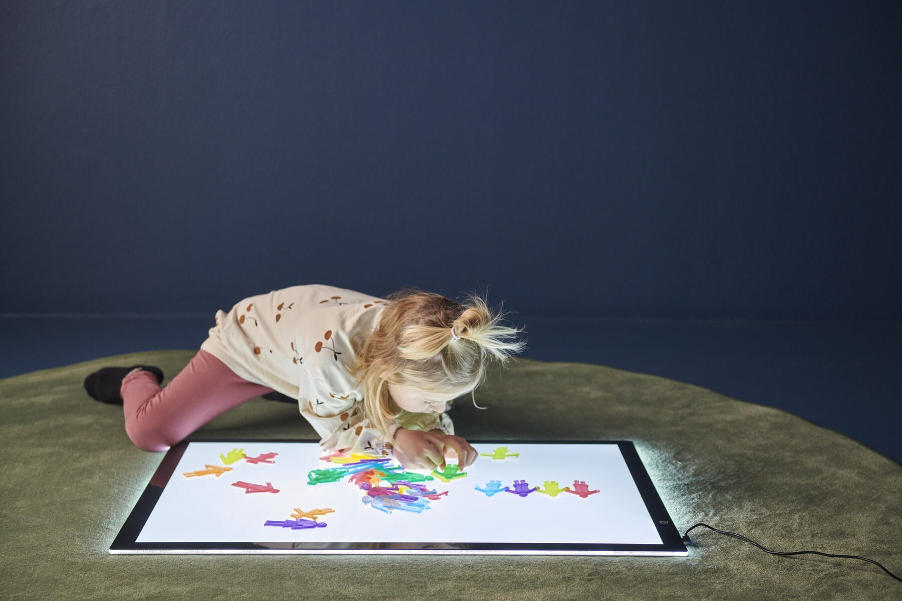 Lysbord til udforskning og kreativ læring, specielt udviklet til børnehave. Lysbordet er udstyret med en LED-lyskilde, der udsender et behageligt, jævnt arbejdslys på hele overfladen med 1050 lumen. Estimeret levetid er 60.000 timer. Plade af plexiglas. Låsbare hjul. Ramme i krydsfiner. 1,8 m ledning med afbryder.