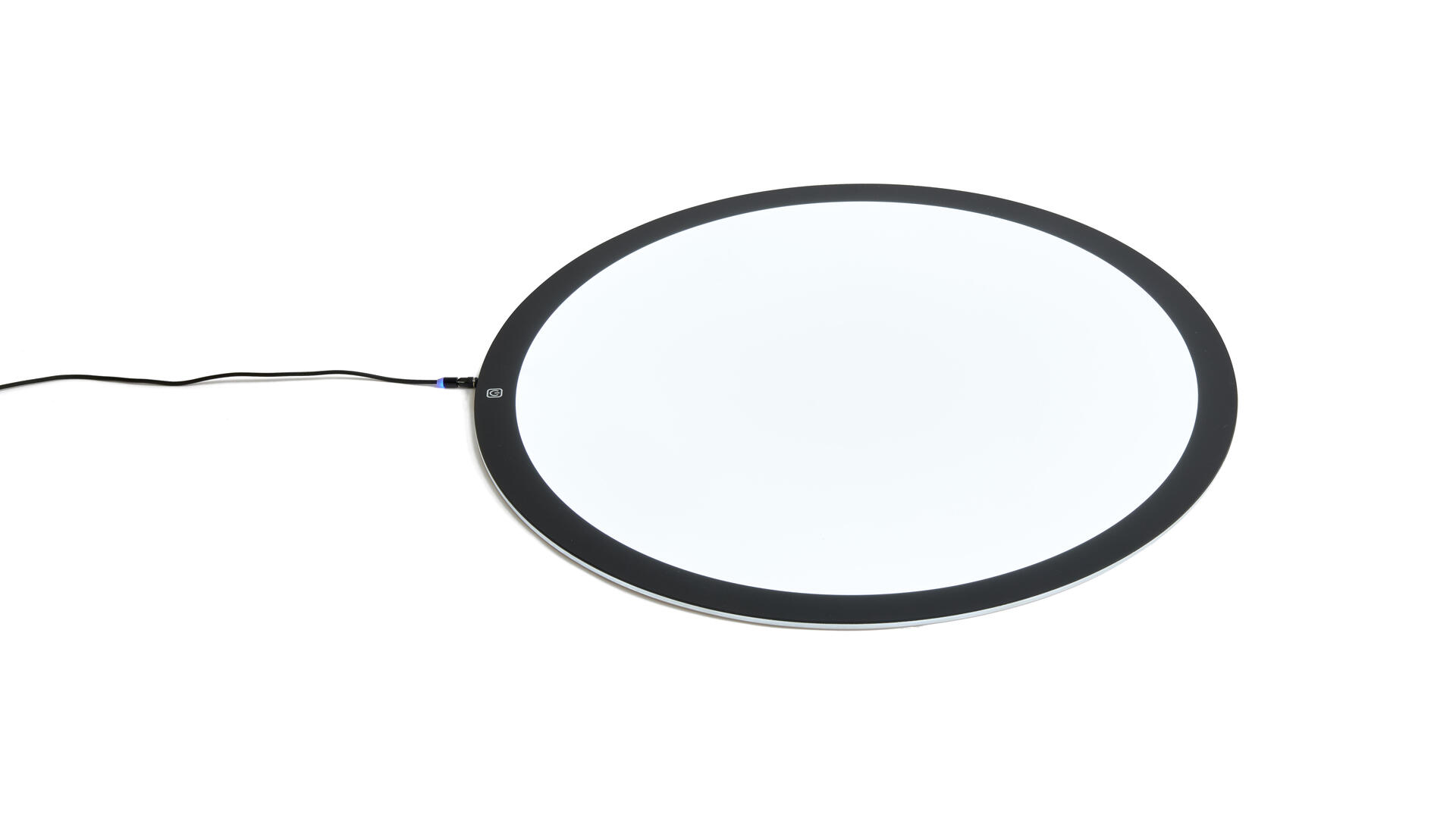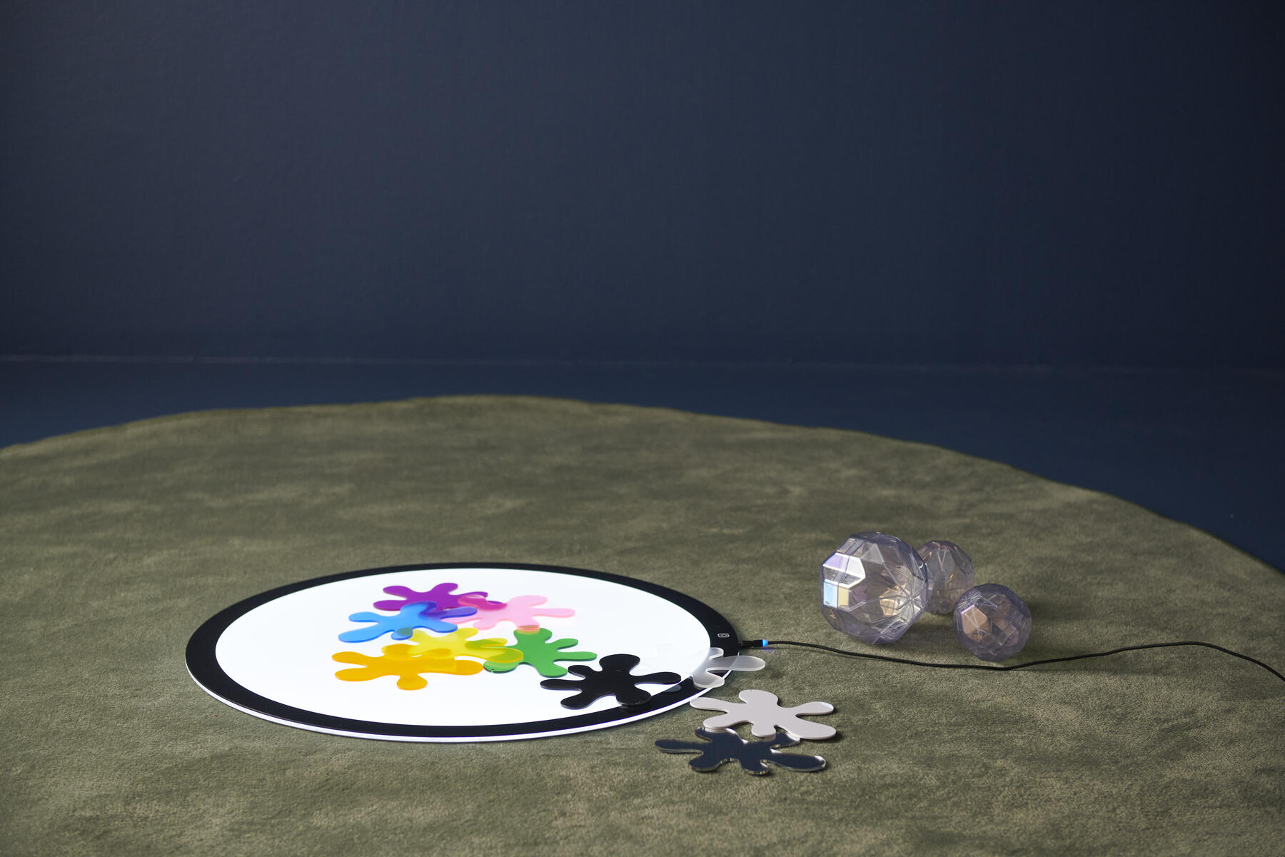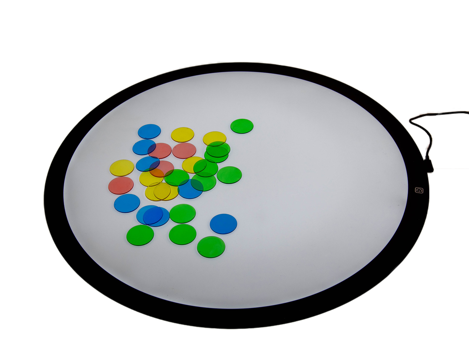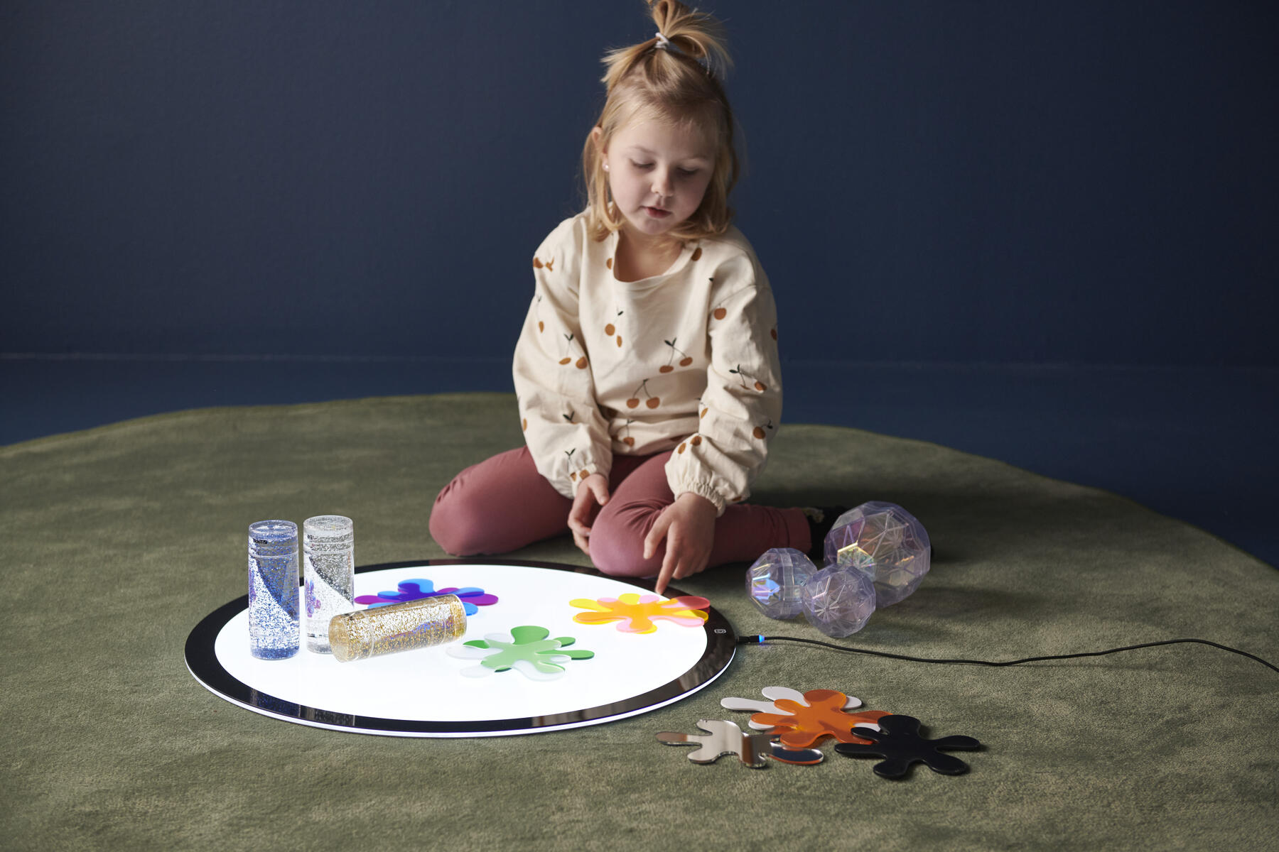 Et rundt lysbord som flere kan arbejde ved samtidig. Børnene kan blandt andet gennemlyse blade, tegne på transparent papir, eksperimentere med forskellige billedteknikker og lege med prismatiske brikker. LED-belysning med en levetid på 50.000 timer og 3 forskellige lysstyrker. Bemærk, at knappen skal holdes inde i 3-4 sekunder for at skifte til næste niveau. Adapter medfølger. Magnettilslutning. Mål: Ø60 cm. Materiale: Akryl. PVC-fri. Fra 3 år.