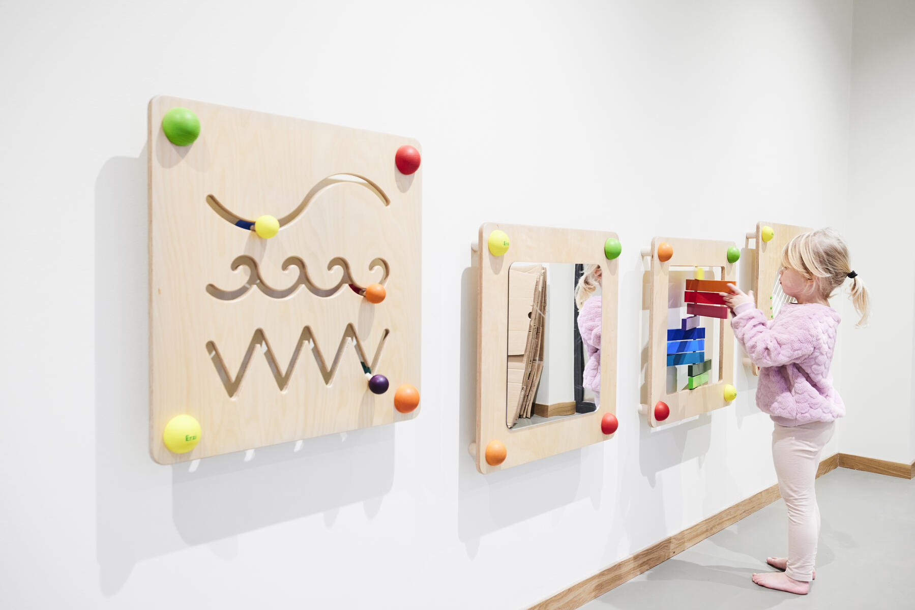 Der er tre forskellige spor på panelet med en lille kugle i hver. Kan monteres på væg eller stå vha. fødder, som bestilles separat. Mål: 57,5x57,5x1,5 cm. Af birkekrydsfinér. Til de allermindste, 0-3 år.