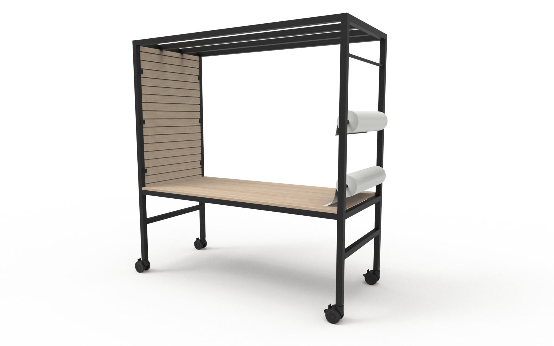 Dette arbejdsbord kombinerer funktion og fleksibilitet. Det solide stel i sortlakeret stål står stabilt på låsbare hjul, og bordpladen i birkekrydsfinér kan justeres i højden. Sidepanelet har riller til ophæng, og papirrulleholderen giver hurtig adgang til materialer – perfekt til kreative opgaver og projektarbejde. Bordet kan nemt udbygges med ekstra elementer, så det tilpasses rummets behov og aktiviteter.