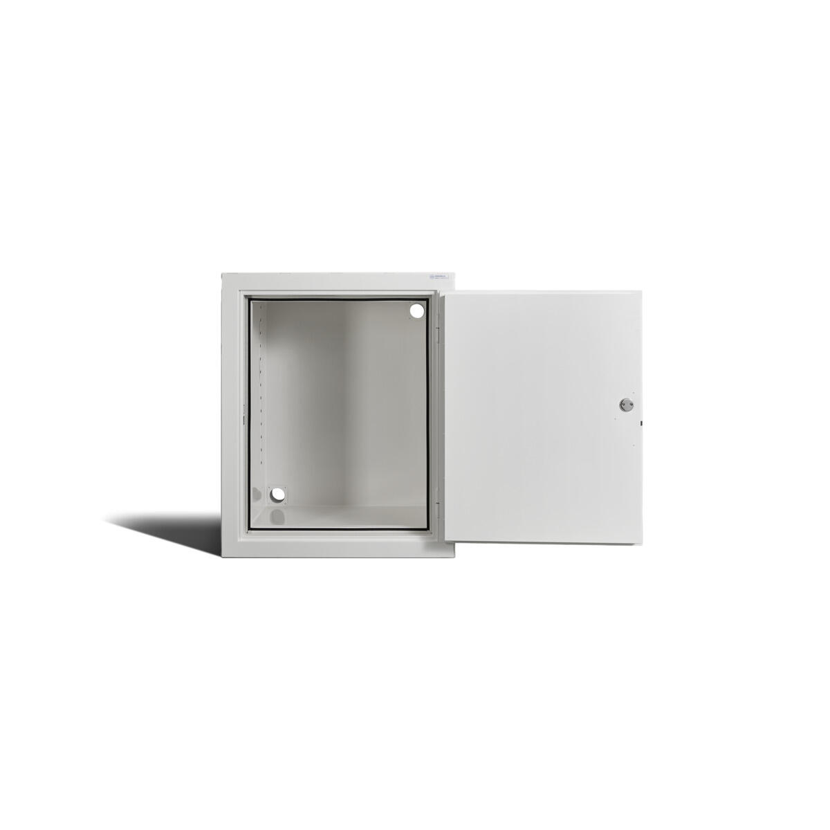 Brandklassificeret gasskab til opbevaring af propan og andre brandfarlige gasser. Skabet er udstyret med ventilationsstudse, der føres direkte ud gennem ydervæg uden behov for mekanisk ventilation. 2 stk. rørstudse (ILÖ 80) er placeret på skabets bagside – én i øverste kant og én i nederste kant.