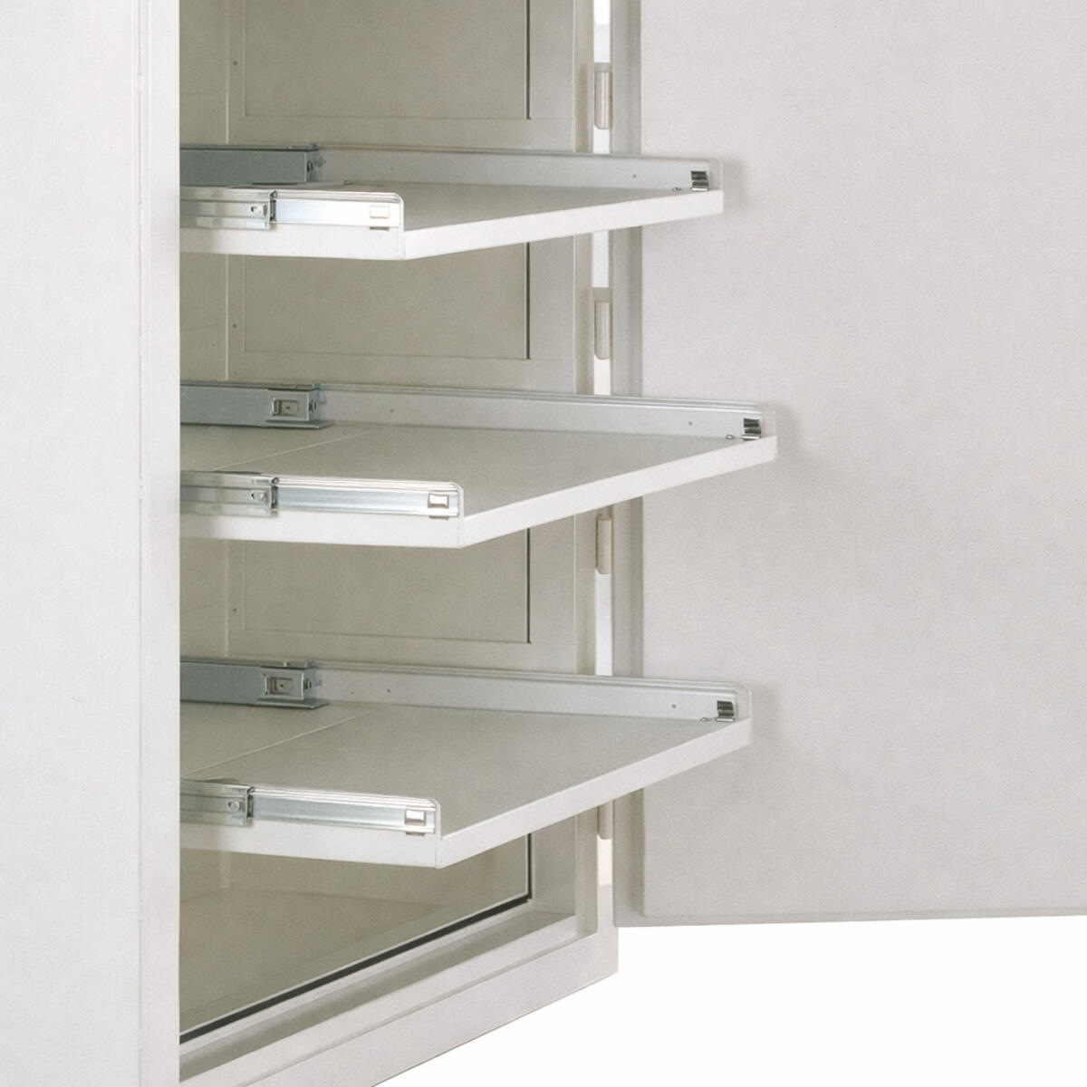 6 hylder, heraf 4 udtrækshylder, samt 6 skuffer i polypropylen (18 liter). Skufferne kan løftes ud af skabet. Hyldebelastning: 50 kg jævnt fordelt.