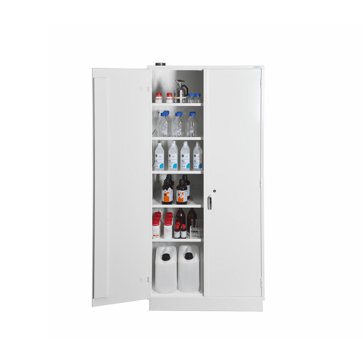 Ventileret skab til opbevaring af syrer og baser, opdelt i to sektioner for separat opbevaring. Skabet er fremstillet i højtrykslaminat. Understel i pulverlakeret metal (H 15 cm). 6 flytbare hylder samt 2 bundkar. Opsamlingsvolumen: 5,9 liter pr. stk. Hyldebelastning: 50 kg jævnt fordelt.
