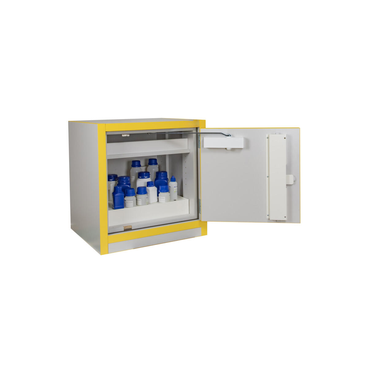 Brandklassificeret kemikalieskab F30 til opbevaring af brandfarlige og giftige kemikalier. Skabet leveres med håndtagslås og 2 nøgler (monteret ved levering). 1 bundkar med perforeret bundplade. Opsamlingsvolumen: 20 liter. Hyldebelastning: 50 kg jævnt fordelt. Udstyret med ventilationsstuds i bagvæg (Ø 100 mm) til tilluft og tilkobling til aftræk.
