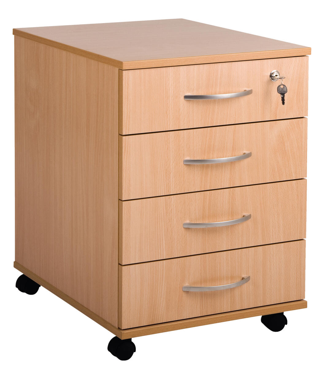 Skuffemodul med hjul. Bøge- eller birkelaminat. 4 skuffer, hvoraf øverste er låsbar. Mål: B45xD55xH60 cm. Indvendigt mål på skuffer: B36,3xD48,8xH7,2 cm. Med låsbare hjul.