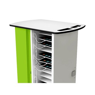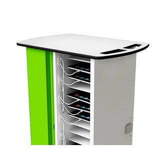 Opladningsvogn til op til 30 tablets eller andet udstyr. Har 2 hylder med skillevægge i stål. Hvert rum måler B25xD300xH260 mm. Materiale: Koldvalset stål af høj kvalitet, tykkelse 0,8 mm. Skabet kan låses og leveres med 2 nøgler. Med 2 låsbare hjul og kabelophæng på siden. Der kan anvendes type C stik, som er et to-ledet stik, der har to runde ben.