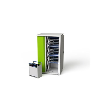 Ladeskab til 32 laptops/tablets med 11" skærm. Husk at gøre plads til tilslutningen. Opladningskablerne lægges bag det farvede panel og tilkoblingen stikker ud ved hvert rum. 8 kurve som rummer 4 tablets hver forenkler transport af flere tablets samtidig. Dørene åbnes i 270° og kan låses med nøgle. Kodelås kan tilkøbes. Mål: B96xD42xH86 cm. Rummets mål: B21xD31xH2,8 cm. Skab og døre i MDF, panel i metal. Kræver 2 stikkontakter.