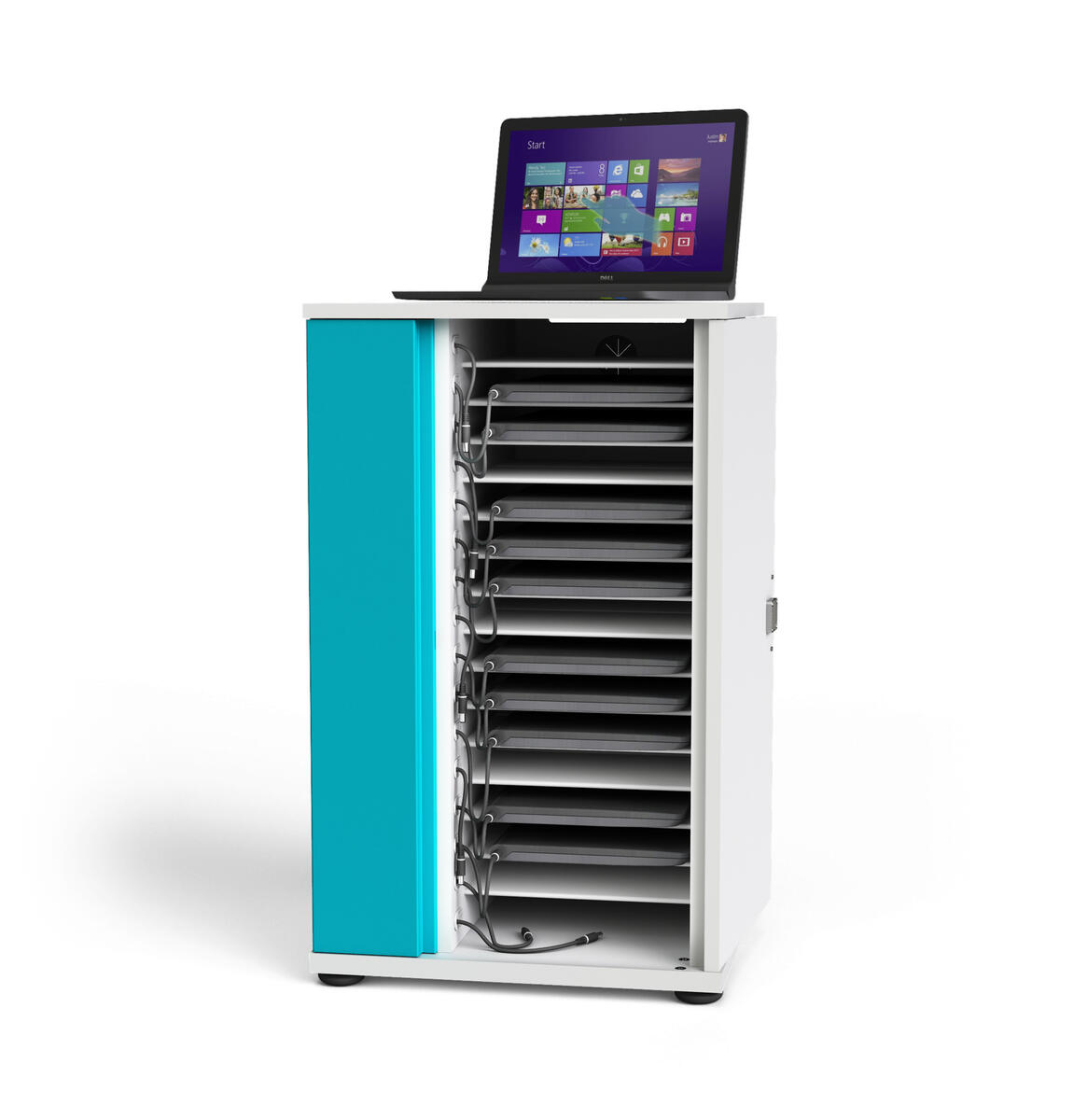 Ladeskab til 32 laptops/tablets med 11" skærm. Husk at gøre plads til tilslutningen. Opladningskablerne lægges bag det farvede panel og tilkoblingen stikker ud ved hvert rum. 8 kurve som rummer 4 tablets hver forenkler transport af flere tablets samtidig. Dørene åbnes i 270° og kan låses med nøgle. Kodelås kan tilkøbes. Mål: B96xD42xH86 cm. Rummets mål: B21xD31xH2,8 cm. Skab og døre i MDF, panel i metal. Kræver 2 stikkontakter.