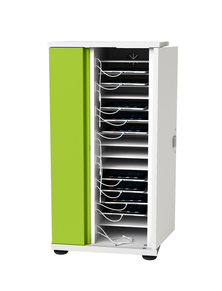 Ladeskab til 32 laptops/tablets med 11" skærm. Husk at gøre plads til tilslutningen. Opladningskablerne lægges bag det farvede panel og tilkoblingen stikker ud ved hvert rum. 8 kurve som rummer 4 tablets hver forenkler transport af flere tablets samtidig. Dørene åbnes i 270° og kan låses med nøgle. Kodelås kan tilkøbes. Mål: B96xD42xH86 cm. Rummets mål: B21xD31xH2,8 cm. Skab og døre i MDF, panel i metal. Kræver 2 stikkontakter.