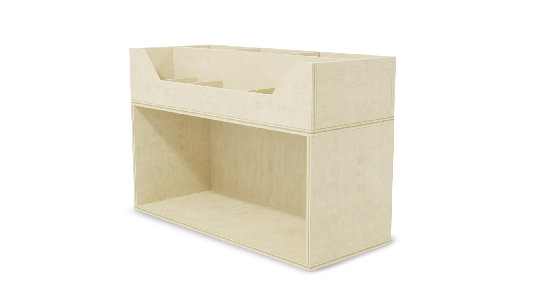 Sorteringskasse med 24 små rum monteret på et FIXA 3:1 modul. Den kan med fordel monteres på de ben, plinter, sokler eller hjul, som fås til vores FIXA-møbler.