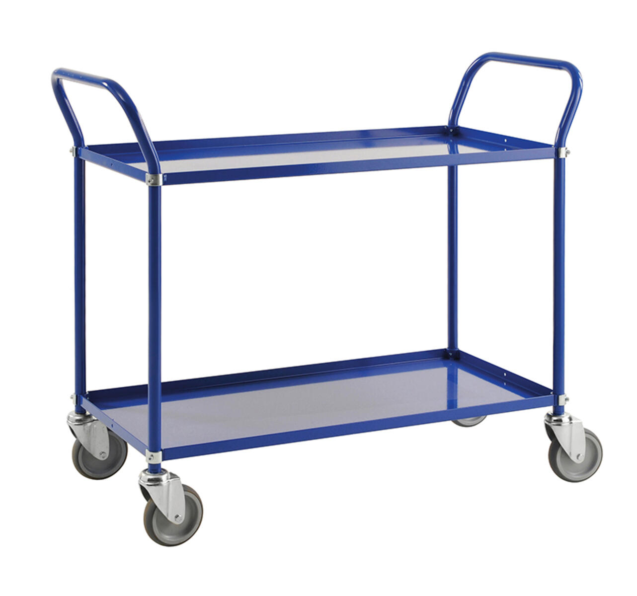 Rullebord og serveringsvogn med 2 vendbare hylder. Pulverlakeret eller galvaniseret stål. 4 hjul hvoraf 2 stk. er låsbare, Ø12,5 cm. Maks. belastning 250 kg. Vægt 23 kg. Mål på hylde: 90x44 cm. Mål på vogn: L94xB50xH94 cm. Længden er 108 cm, hvis hjulene peger ud fra bordet.