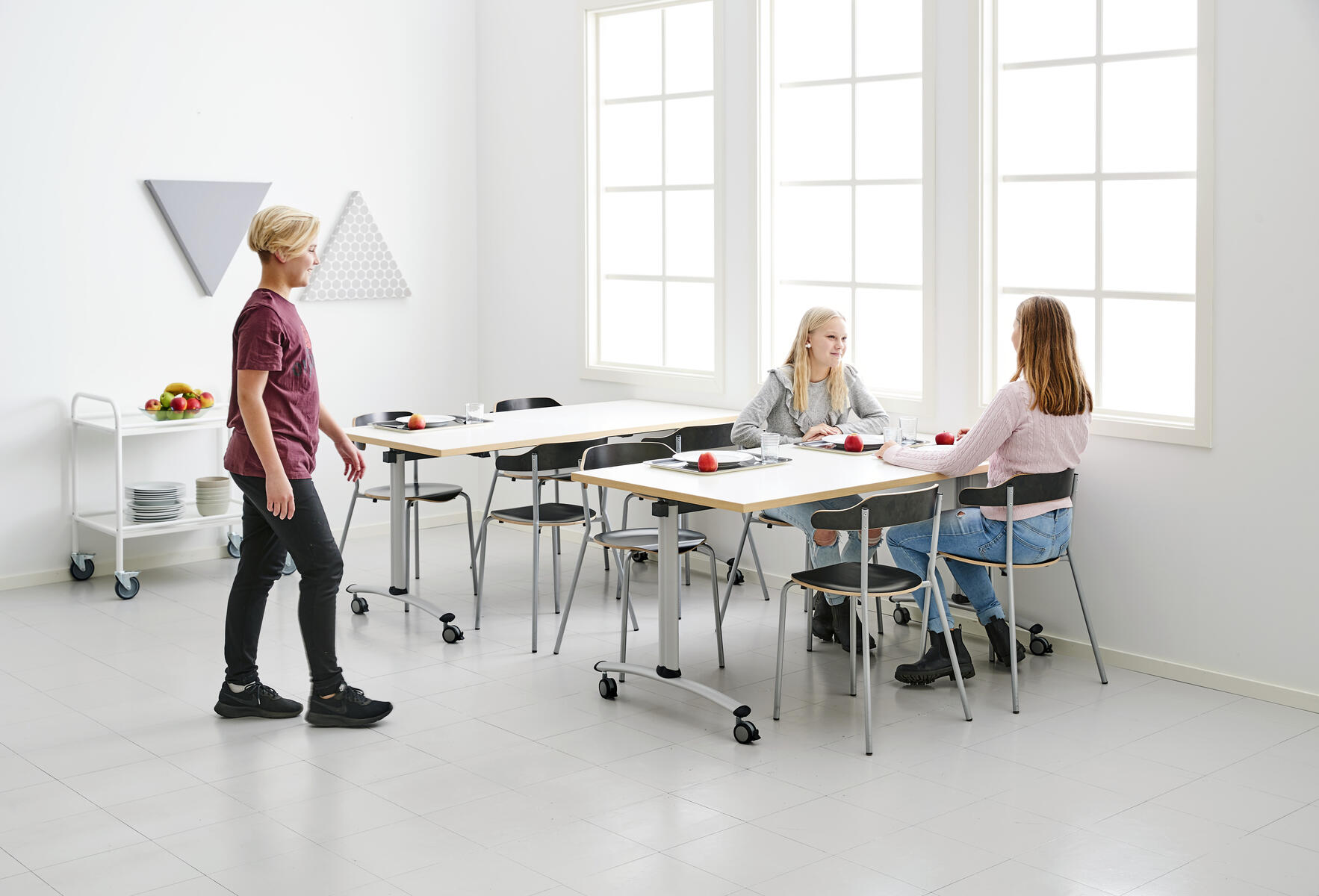 Stel af hvidlakeret stålrør. Plader belagt med lyddæmpende linoleum. Mål: 76x52x83 cm. Afstand mellem hylderne er 37 cm. Vægt 20 kg. Maks. belastning 100 kg. Med 4 hjul hvoraf 2 er låsbare.