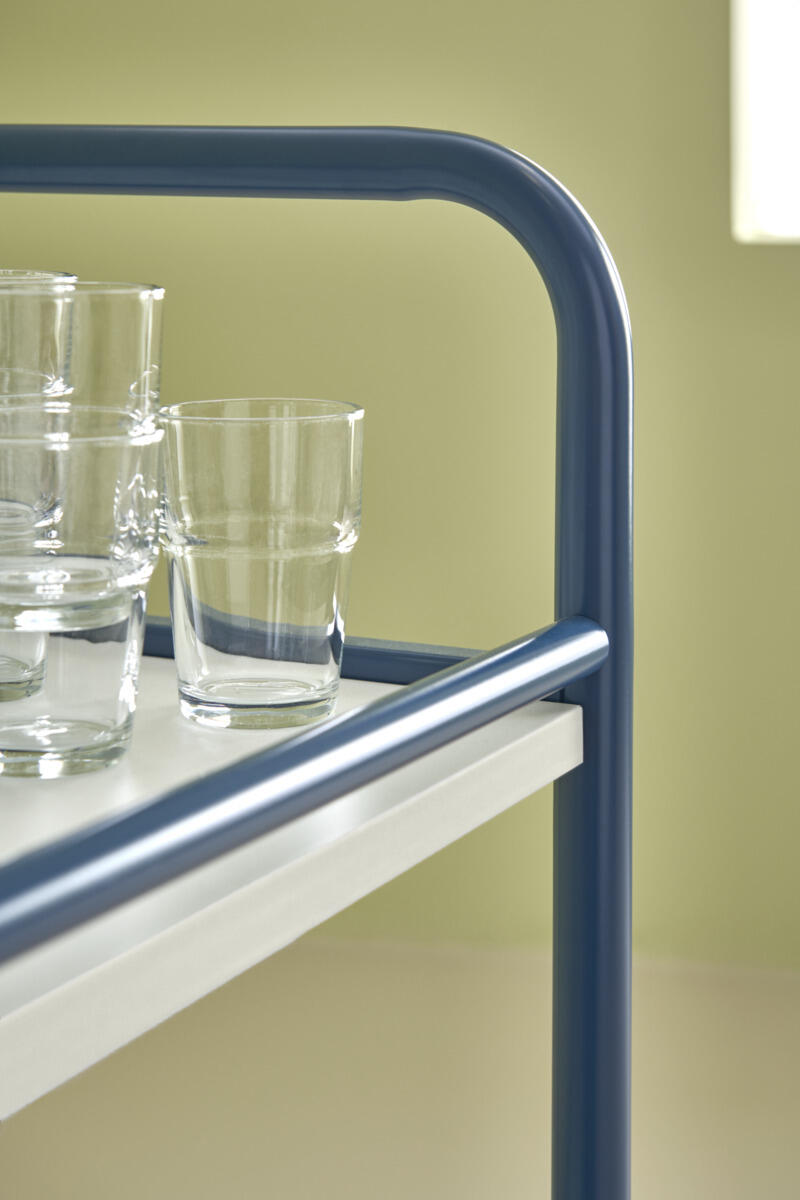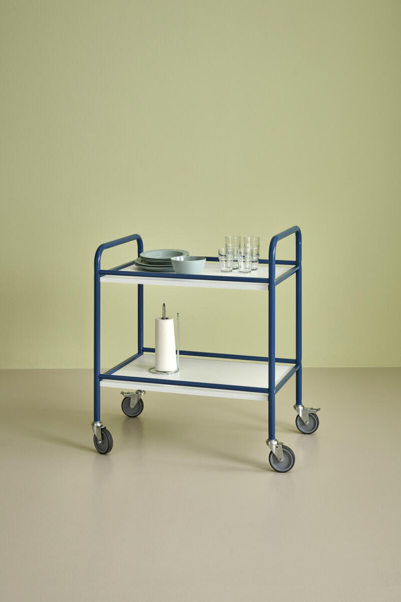 Stel i blålakeret stålrør. Plader af hvid laminat. Mål: B76xD52xH83 cm. Afstand til øverste hylde er 75 cm. Afstand mellem hylderne er 37 cm. Vægt 20 kg. Maks. belastning 100 kg. 2 låsbare hjul.