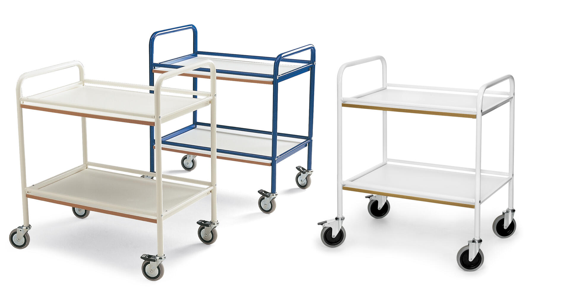 Rullebord og serveringsvogn med 3 vendbare hylder. 4 hjul hvoraf 2 er låsbare, Ø12,5 cm. Mål hylder: L90xB44 cm. Højde til øverste hylde 76 cm, højde mellem hylderne 25 cm. Mål på vogn: L108xB48xH94 cm, vægt 30 kg. Maks. belastning 250 kg. Pulverlakeret eller forzinket metal.